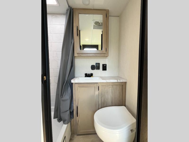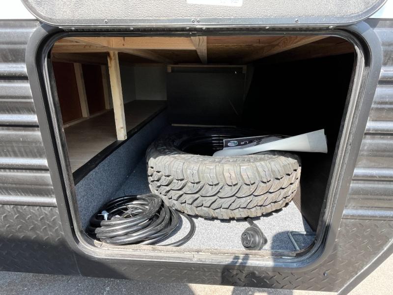 You will undoubtedly love this Cherokee Grey Wolf toy hauler! Because of its ability to have up to 15' 2" of cargo space, you can easily load up the ramp door and head out to your outdoor toy land, and you can bring much more than just your toys since this trailer also comes with exterior storage, a bedside wardrobe, overhead cabinets, a refrigerator, and a kitchen pantry. The full bathroom is another feature that is going to allow you to experience a true getaway since you won't need to find public facilities to use while you're gone, and the USB charging stations will allow you to charge your phone inside while you're outside playing.