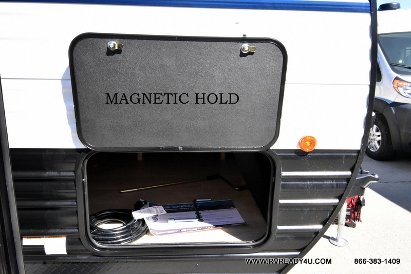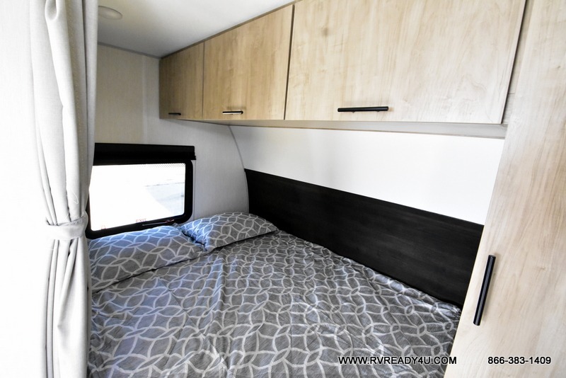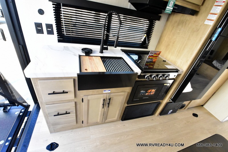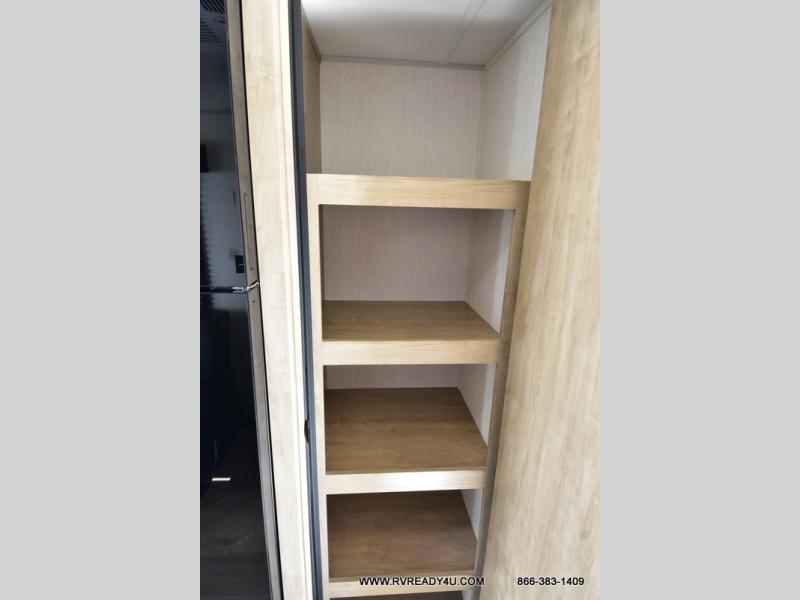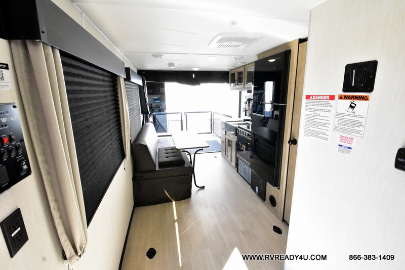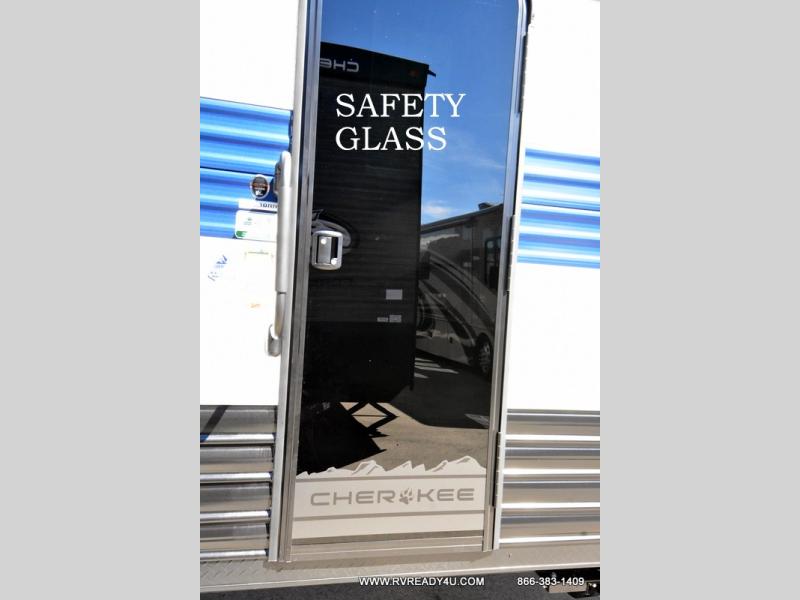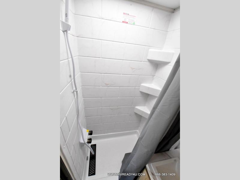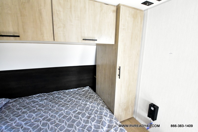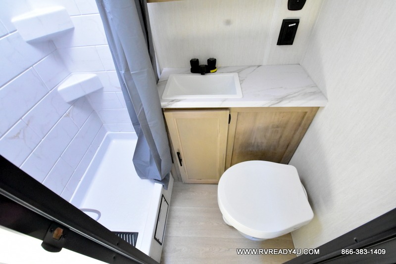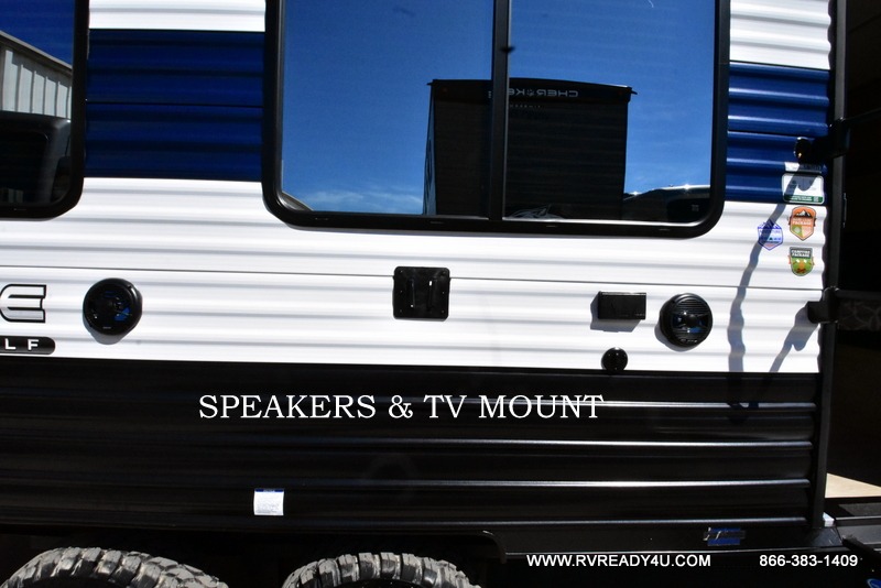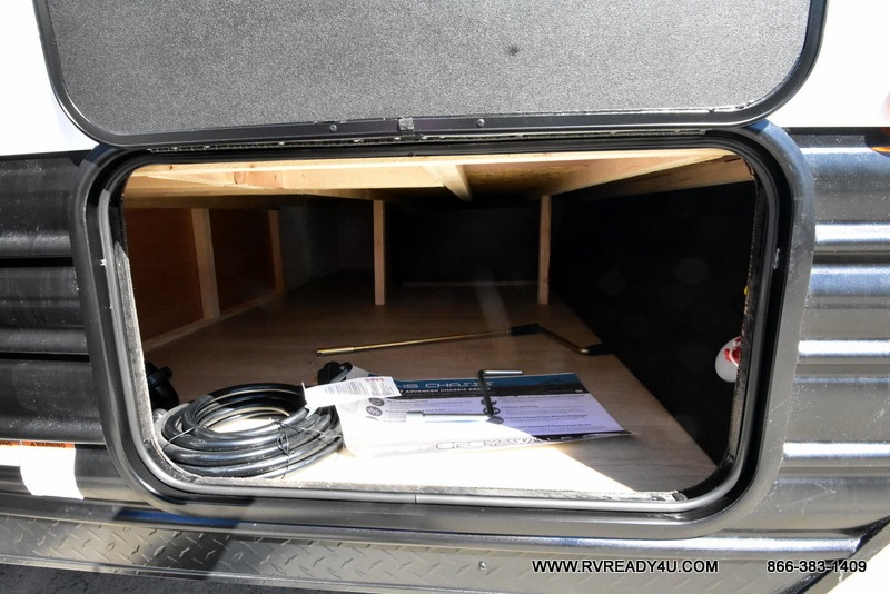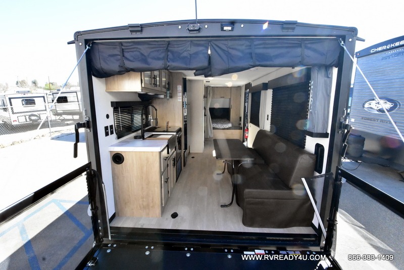 You will undoubtedly love this Cherokee Grey Wolf toy hauler! Because of its ability to have up to 15' 2" of cargo space, you can easily load up the ramp door and head out to your outdoor toy land, and you can bring much more than just your toys since this trailer also comes with exterior storage, a bedside wardrobe, overhead cabinets, a refrigerator, and a kitchen pantry. The full bathroom is another feature that is going to allow you to experience a true getaway since you won't need to find public facilities to use while you're gone, and the USB charging stations will allow you to charge your phone inside while you're outside playing.