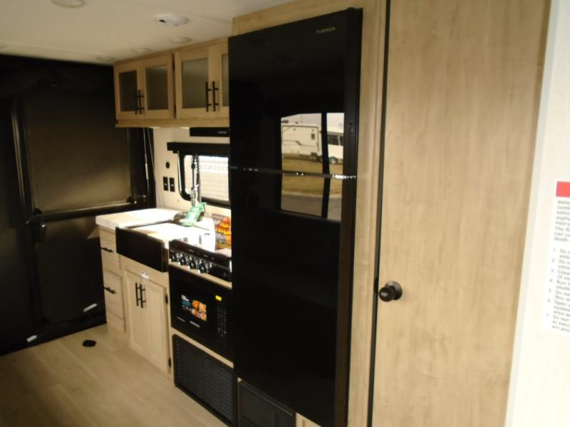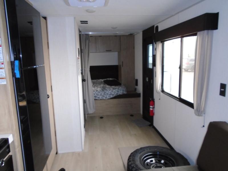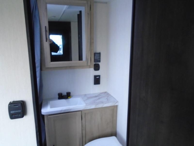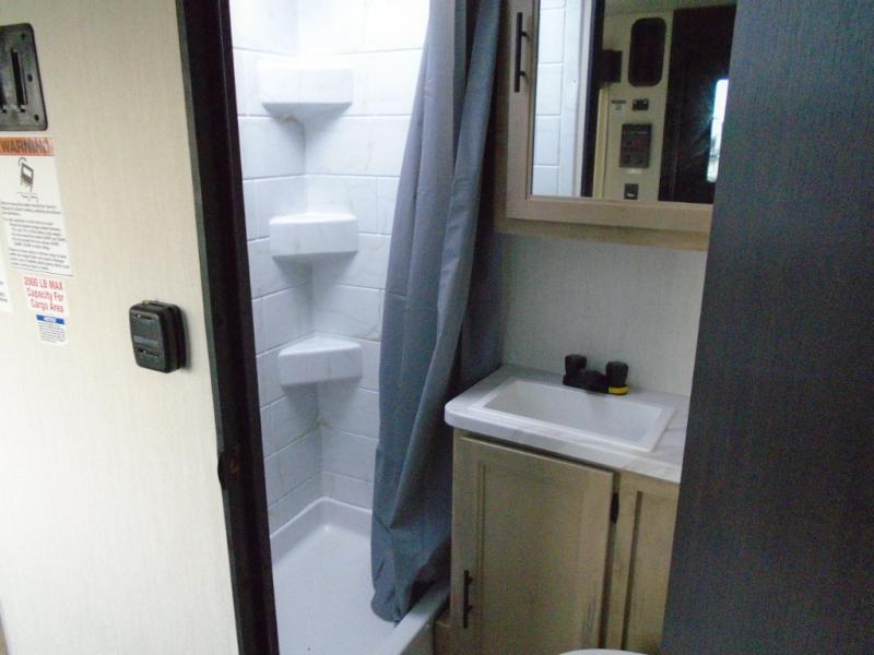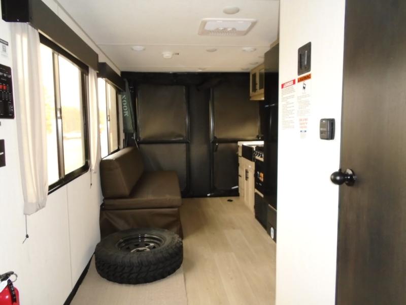 You will undoubtedly love this Cherokee Grey Wolf toy hauler! Because of its ability to have up to 15' 2" of cargo space, you can easily load up the ramp door and head out to your outdoor toy land, and you can bring much more than just your toys since this trailer also comes with exterior storage, a bedside wardrobe, overhead cabinets, a refrigerator, and a kitchen pantry. The full bathroom is another feature that is going to allow you to experience a true getaway since you won't need to find public facilities to use while you're gone, and the USB charging stations will allow you to charge your phone inside while you're outside playing.