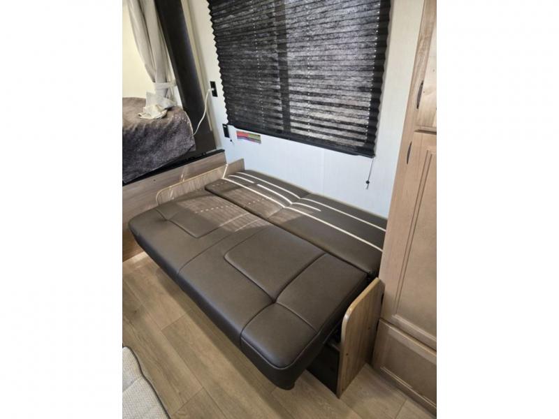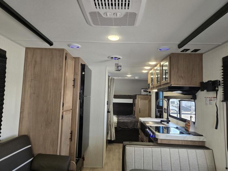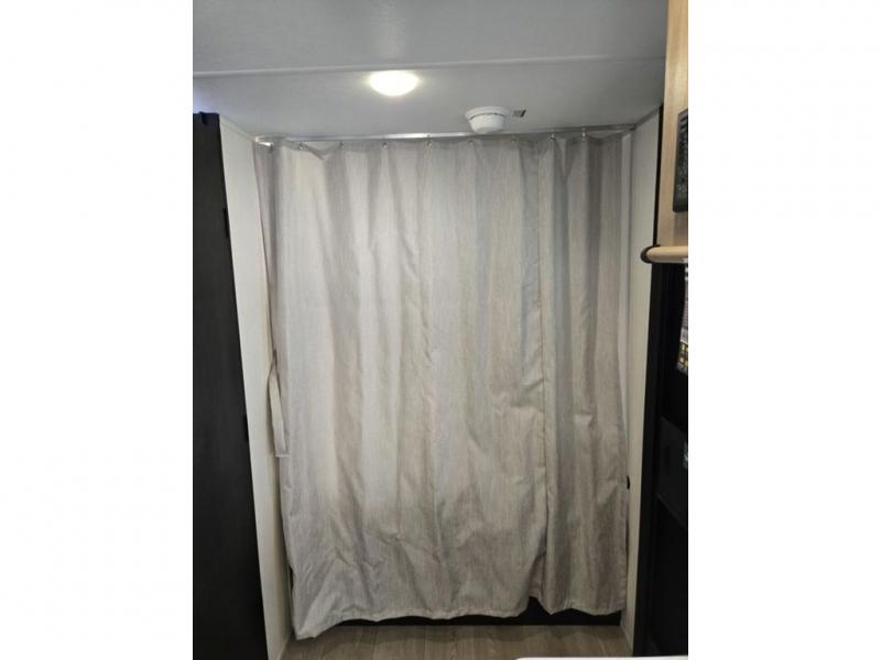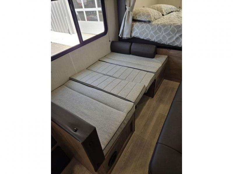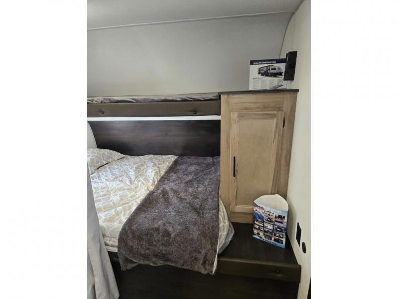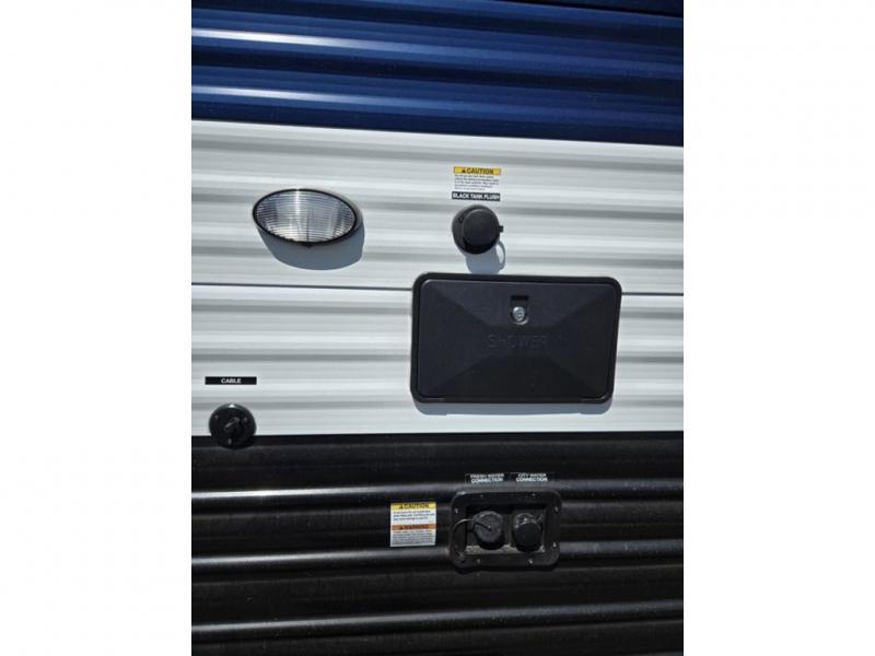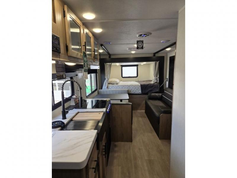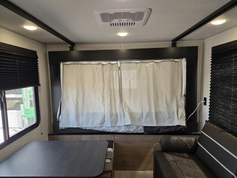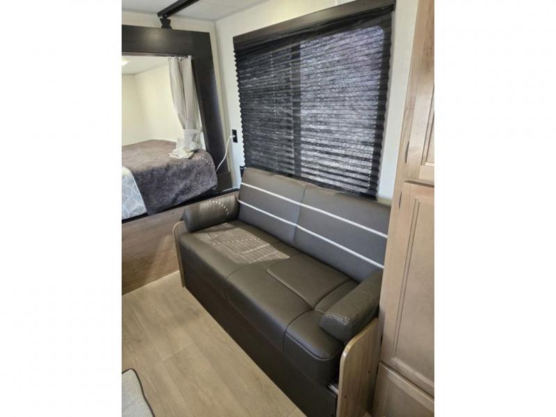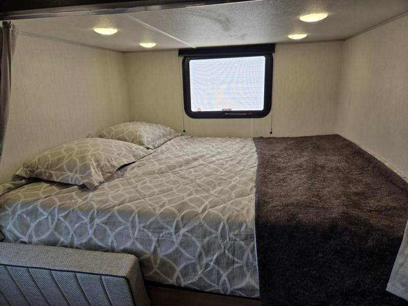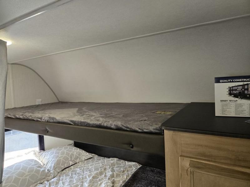 A family of seven or eight can enjoy many outdoor adventures in this Cherokee Grey Wolf travel trailer which features two queen beds and a bunk above the front bed. With the rear queen bed slide, you gain sleeping space without having additional tow length added. You will find large overhead cabinets inside, a pantry to bring along your favorite snacks, and a wardrobe for keeping your clothes wrinkle free. There is a booth dinette for you to enjoy your meals at or play some card games, and there is also a sofa for those who just want to sit back and watch. A conveniently located bathroom that sits directly across from the main entry makes it easy to access from outside. There is also a nice 15' awning for creating additional living space so that you can enjoy the outdoors whether rain or shine!