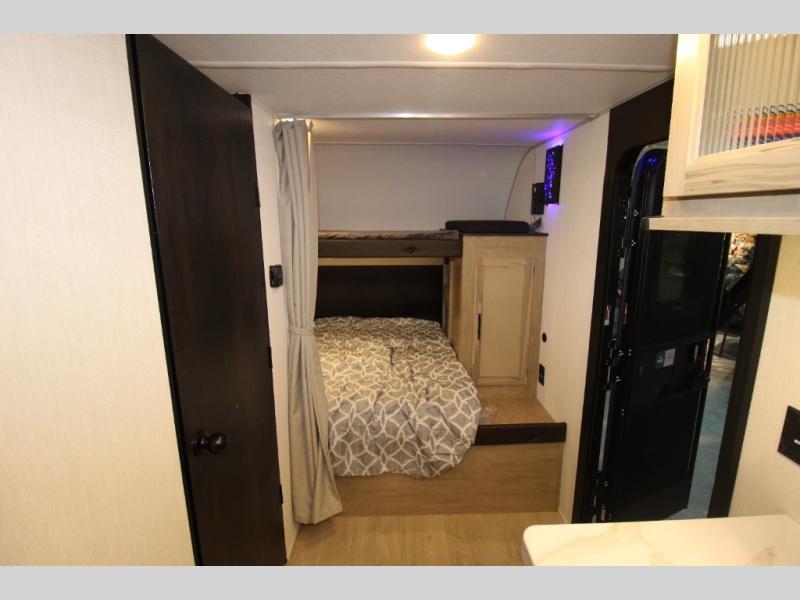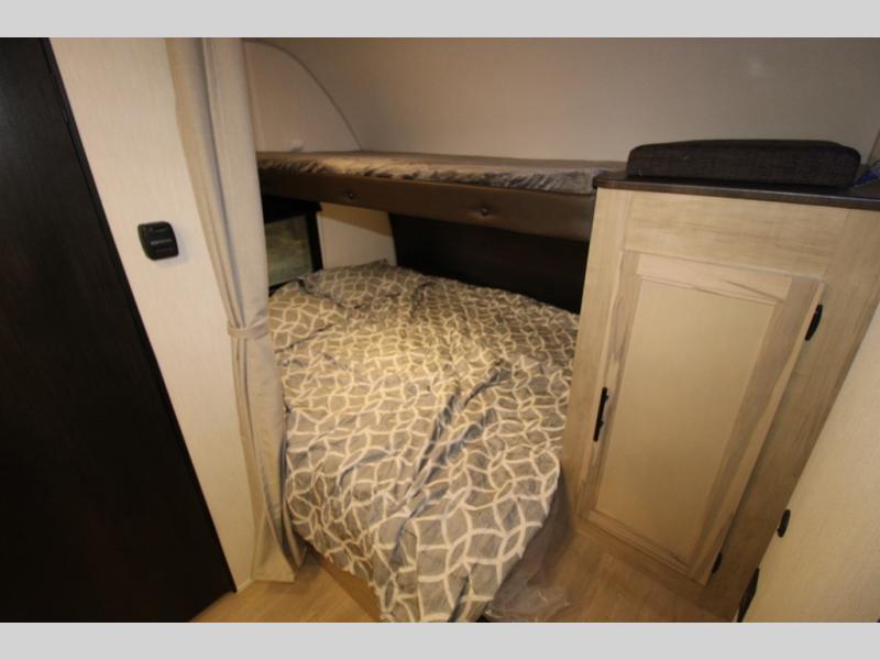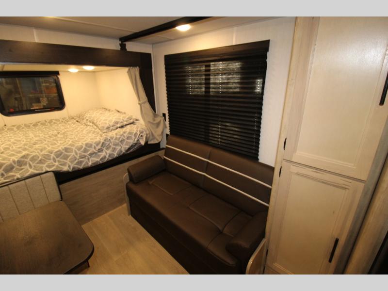 A family of seven or eight can enjoy many outdoor adventures in this Cherokee Grey Wolf travel trailer which features two queen beds and a bunk above the front bed. With the rear queen bed slide, you gain sleeping space without having additional tow length added. You will find large overhead cabinets inside, a pantry to bring along your favorite snacks, and a wardrobe for keeping your clothes wrinkle free. There is a booth dinette for you to enjoy your meals at or play some card games, and there is also a sofa for those who just want to sit back and watch. A conveniently located bathroom that sits directly across from the main entry makes it easy to access from outside. There is also a nice 15' awning for creating additional living space so that you can enjoy the outdoors whether rain or shine!