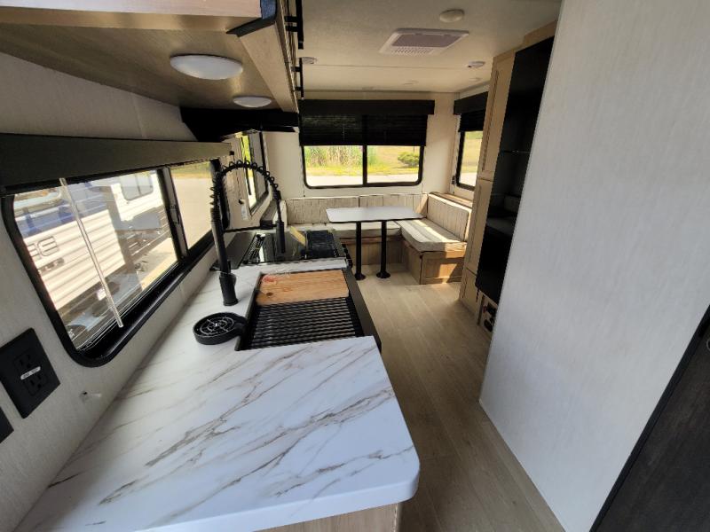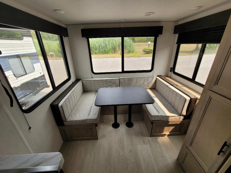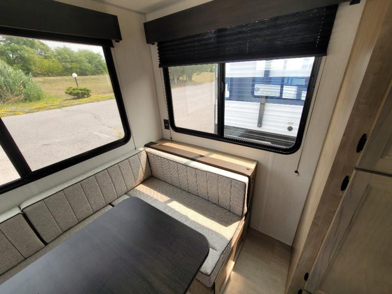 Time spent at the campground in this well designed travel trailer will be time well spent! The front bedroom includes a walk-around RV king bed, dual bedroom wardrobes plus USB ports to charge your phone or laptop. You can whip up breakfast in the modern kitchen that includes an air fryer, then dine around the U-shaped dinette with a panoramic window. This area can also double as sleeping space for one to two guests as well! A pantry will let you stock up on snacks and the TV mount means you can bring along a television if you want to enjoy movie nights. There is also a full bath with a tub/shower where you can freshen up each day!