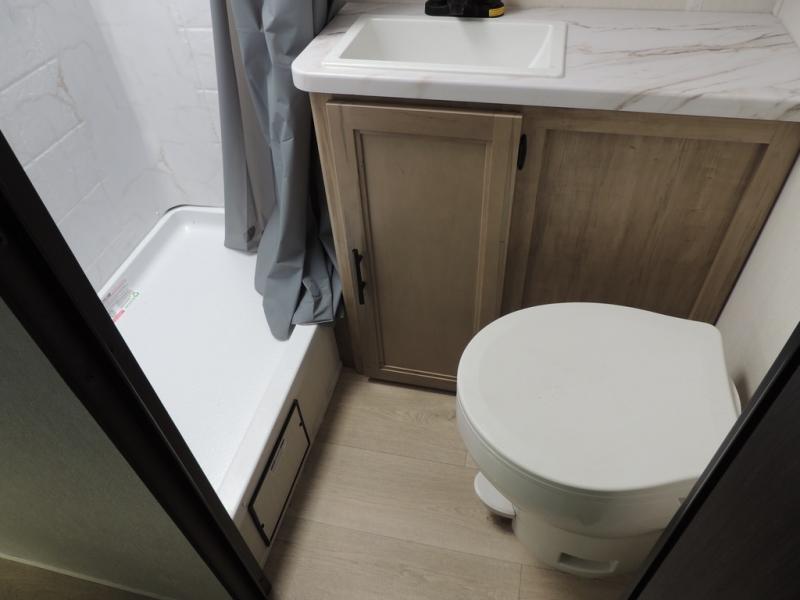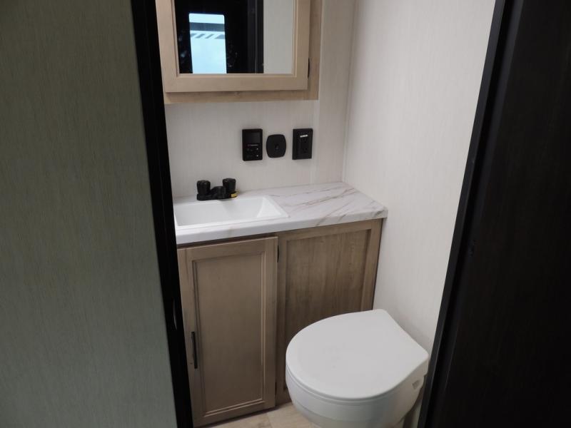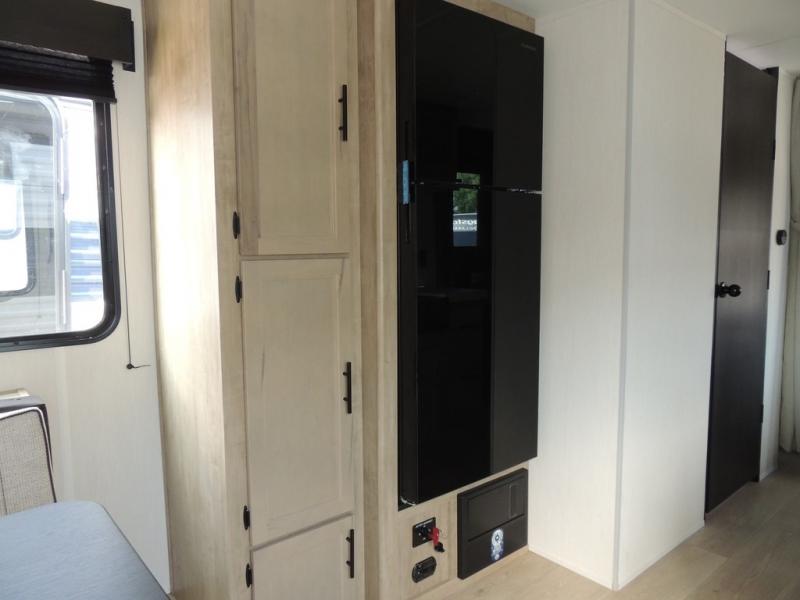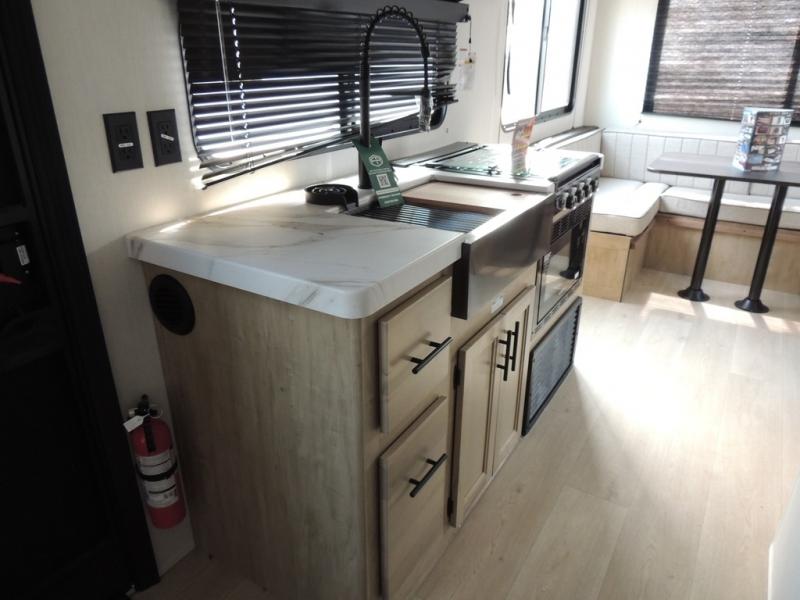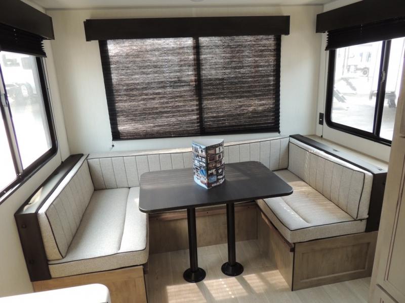 Time spent at the campground in this well designed travel trailer will be time well spent! The front bedroom includes a walk-around RV king bed, dual bedroom wardrobes plus USB ports to charge your phone or laptop. You can whip up breakfast in the modern kitchen that includes an air fryer, then dine around the U-shaped dinette with a panoramic window. This area can also double as sleeping space for one to two guests as well! A pantry will let you stock up on snacks and the TV mount means you can bring along a television if you want to enjoy movie nights. There is also a full bath with a tub/shower where you can freshen up each day!
