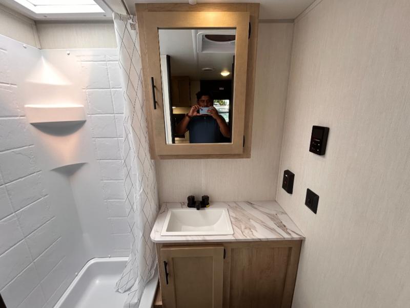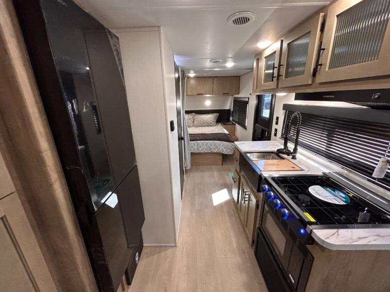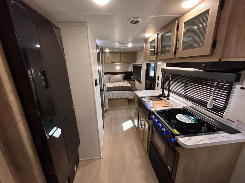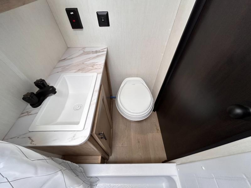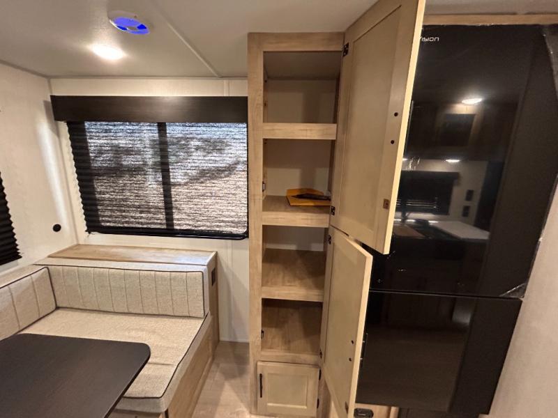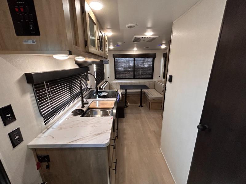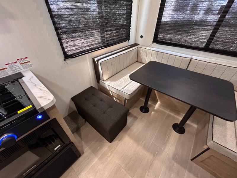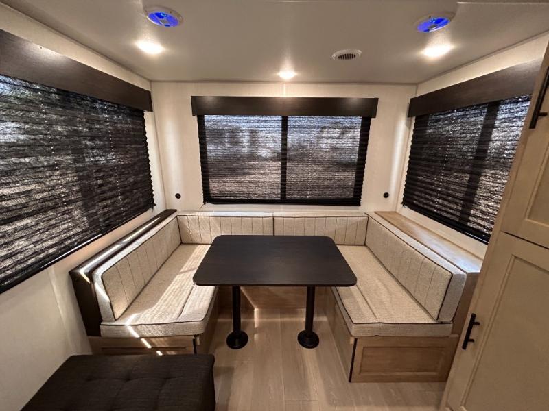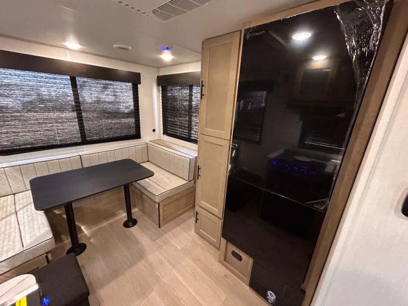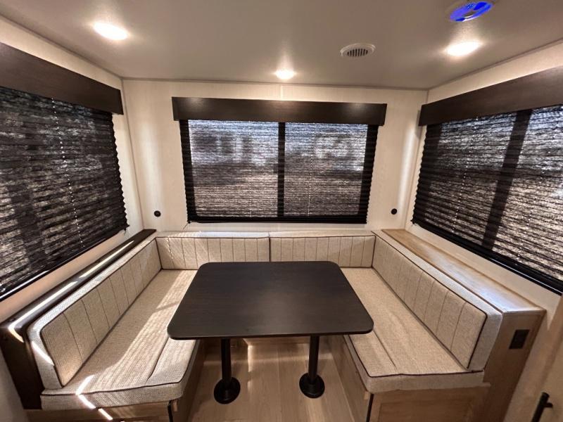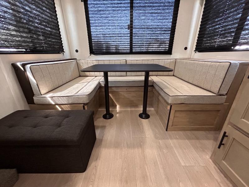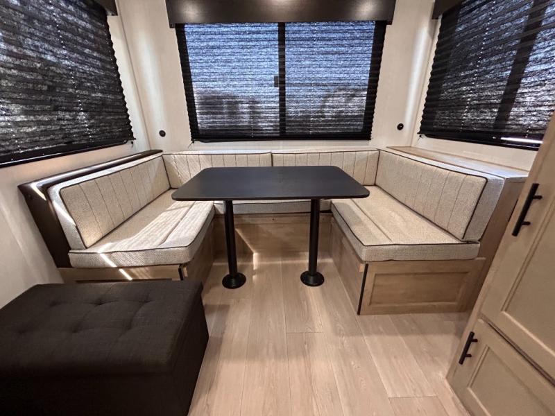 Time spent at the campground in this well designed travel trailer will be time well spent! The front bedroom includes a walk-around RV king bed, dual bedroom wardrobes plus USB ports to charge your phone or laptop. You can whip up breakfast in the modern kitchen that includes an air fryer, then dine around the U-shaped dinette with a panoramic window. This area can also double as sleeping space for one to two guests as well! A pantry will let you stock up on snacks and the TV mount means you can bring along a television if you want to enjoy movie nights. There is also a full bath with a tub/shower where you can freshen up each day!