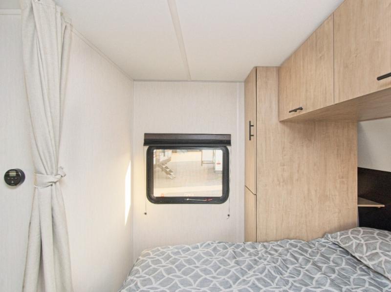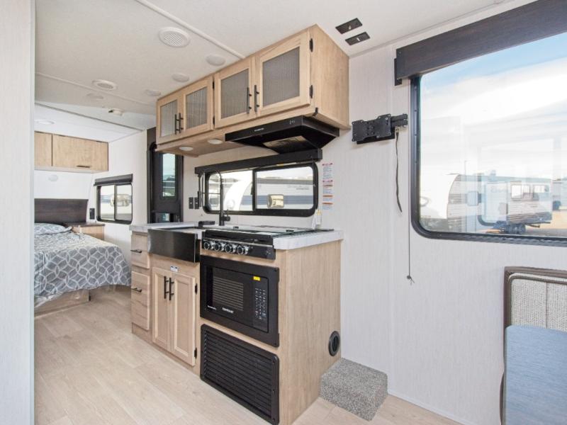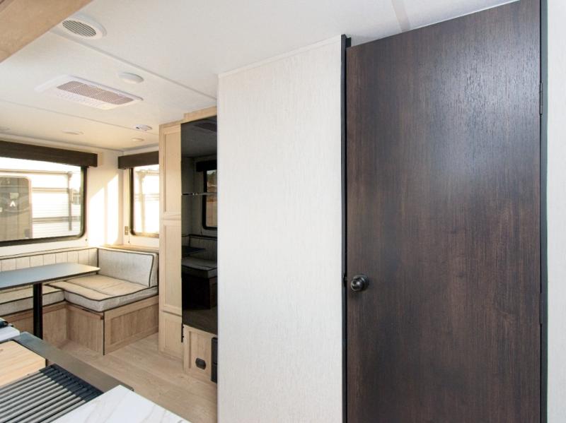 Enjoy ultimate comfort with the Cherokee Grey Wolf 20RDSE, featuring a spacious walk-around RV king bed and a rear U-shaped dinette with panoramic views for dining and relaxation.