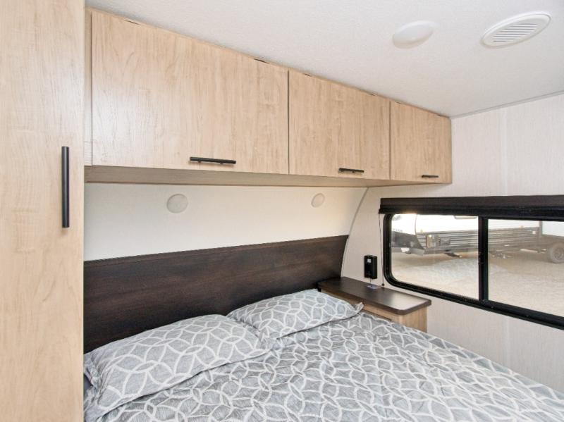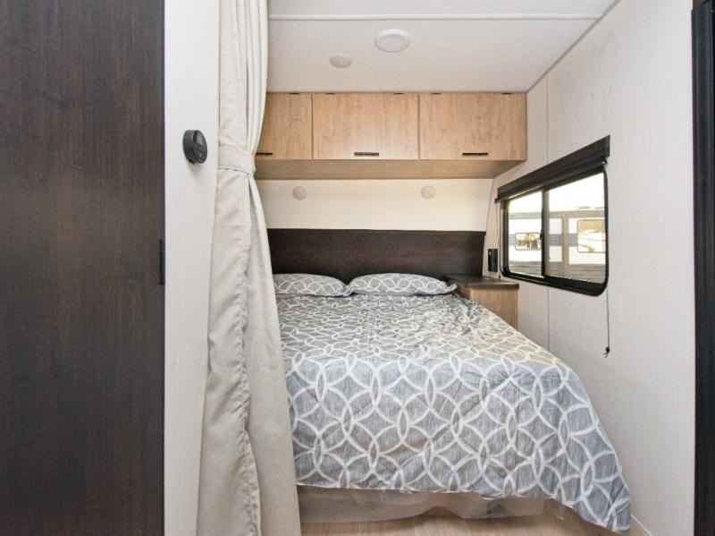 Make every campground stay unforgettable with the Cherokee Grey Wolf 20RDSE! The front bedroom features a walk-around RV king bed, dual wardrobes, and USB charging ports for your devices.