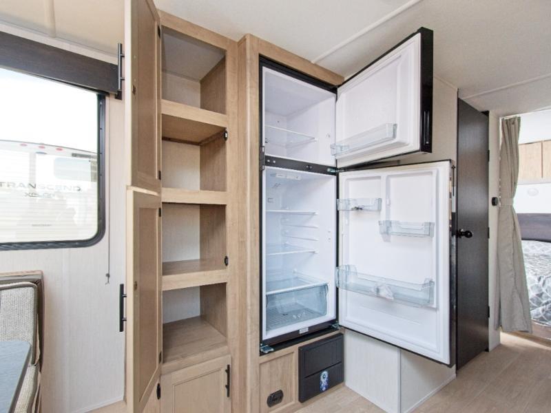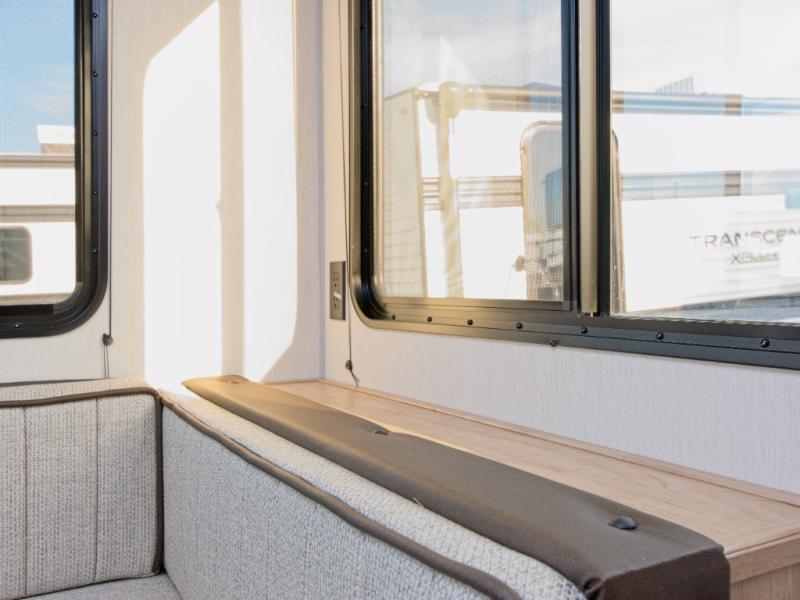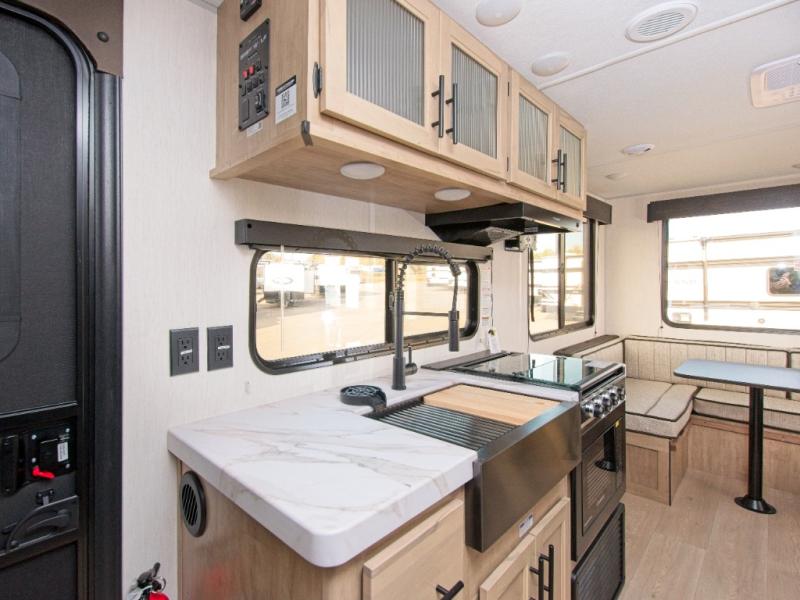 Enjoy cooking in the modern kitchen with an air fryer, then gather around the rear U-shaped dinette with a panoramic window for meals or game nights. Need extra sleeping space? The dinette easily converts for guests.