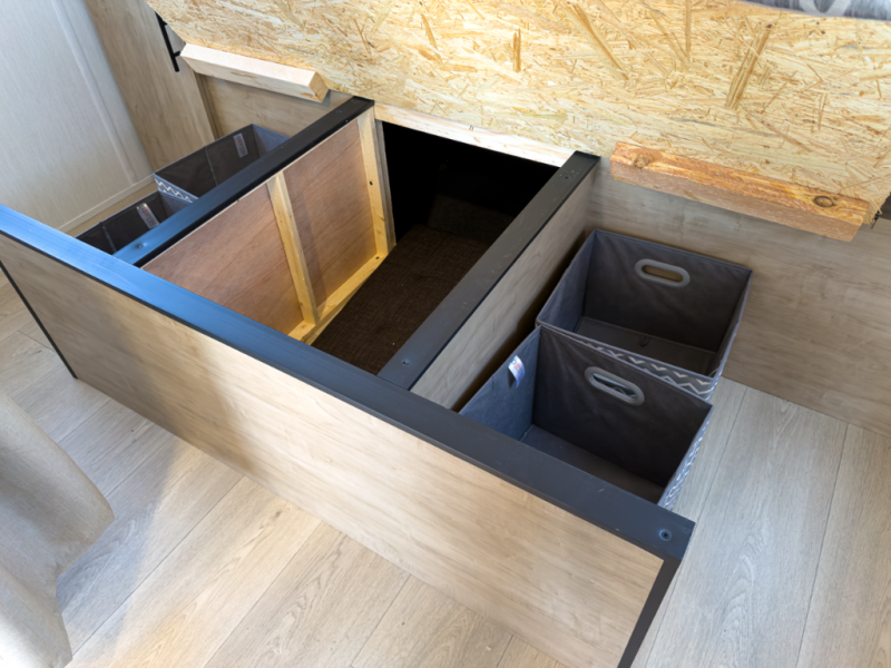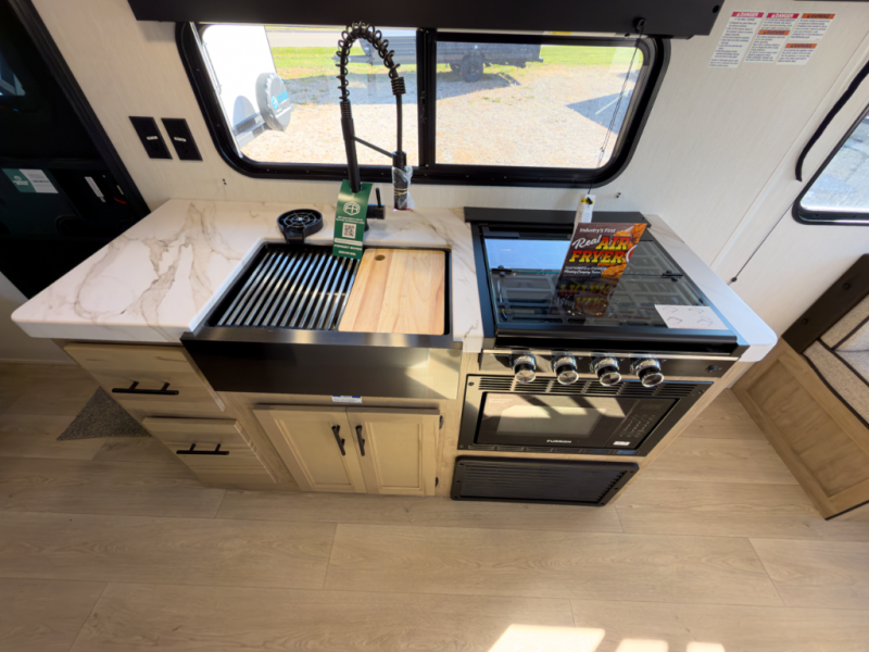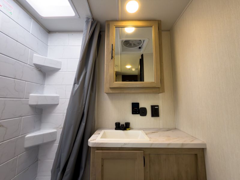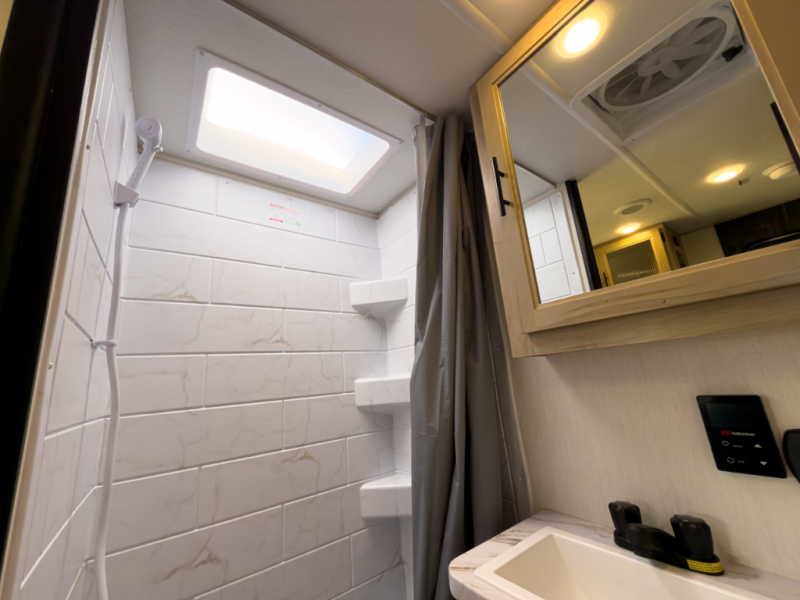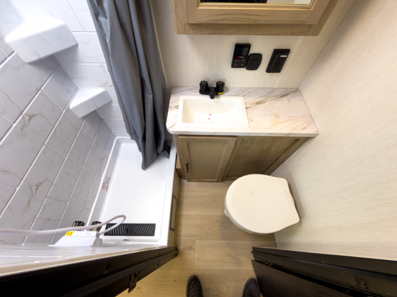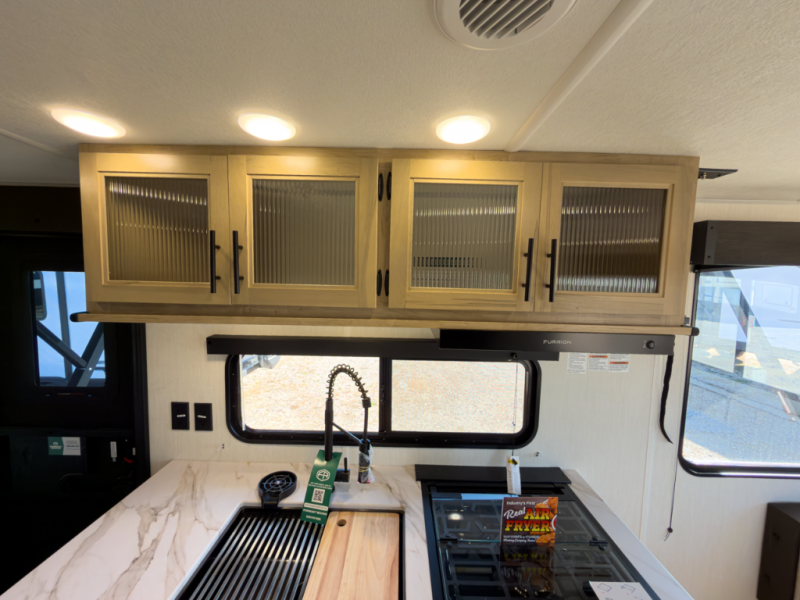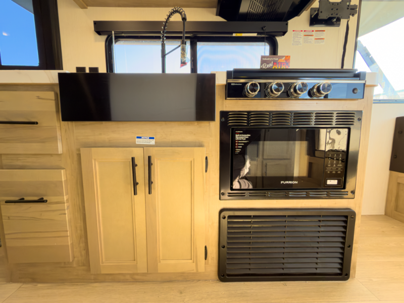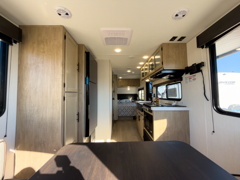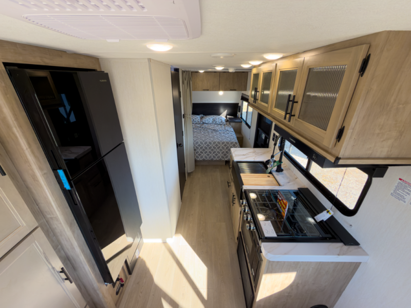 - Kitchen: Range, microwave, overhead cabinets, 12V refrigerator, pantry storage
