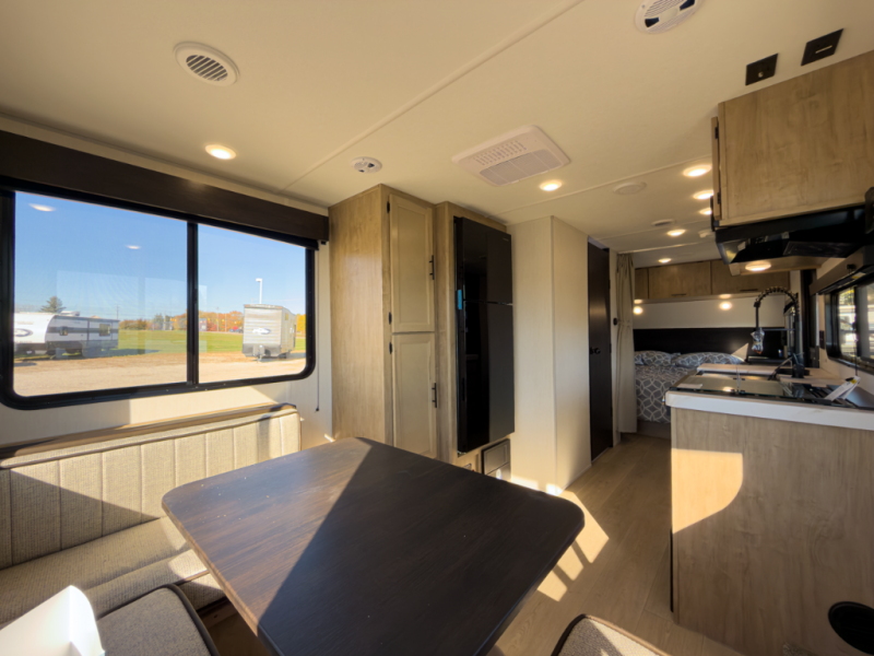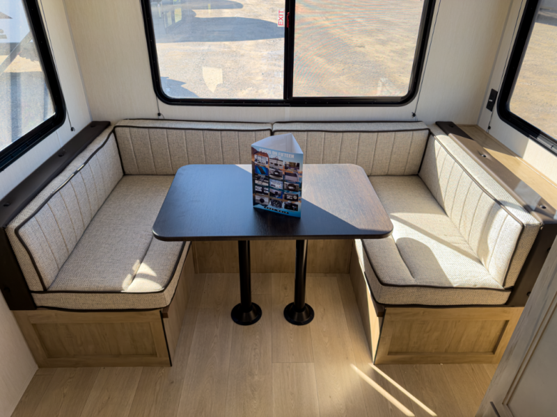 - Living / Dining: Large U-shaped dinette across from kitchen for meals + converts to additional bed space