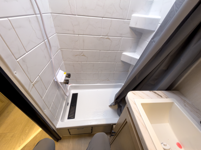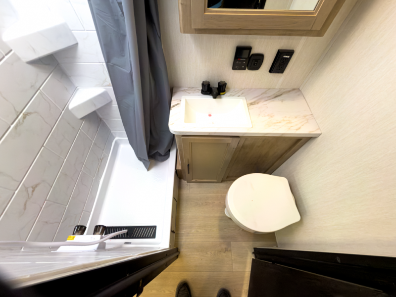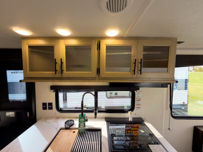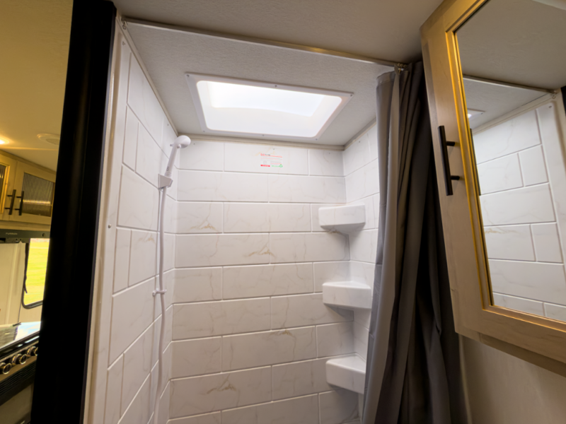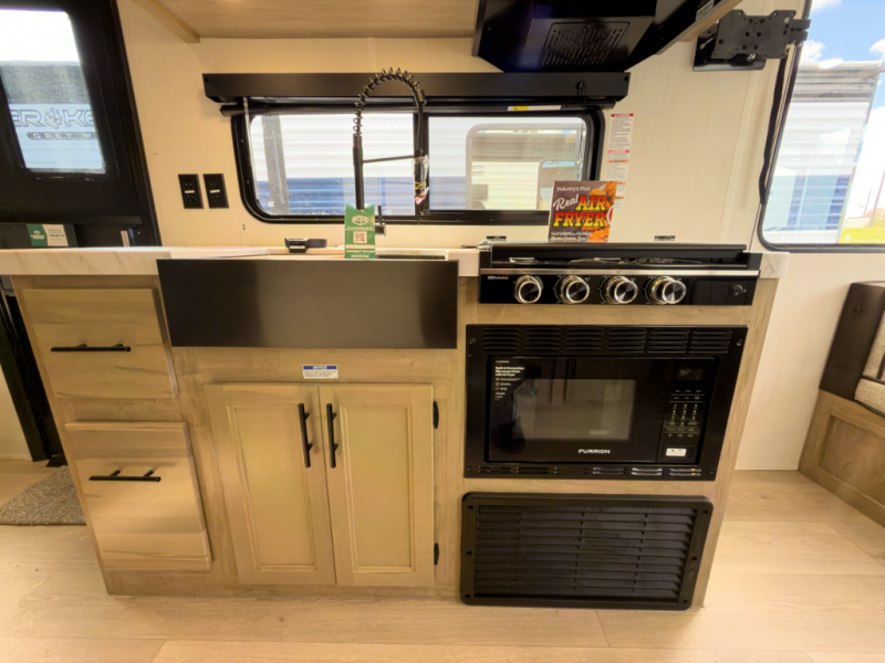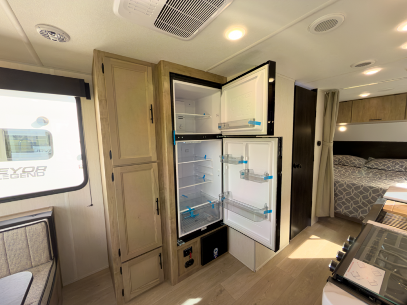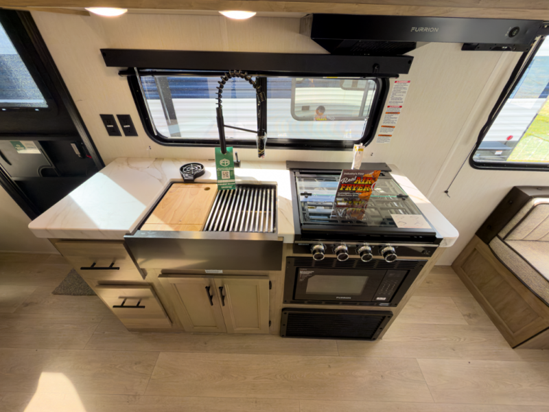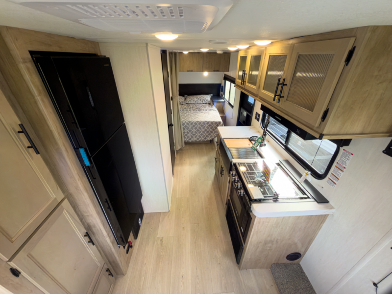 - Kitchen: 12V refrigerator, microwave, range, overhead cabinetry