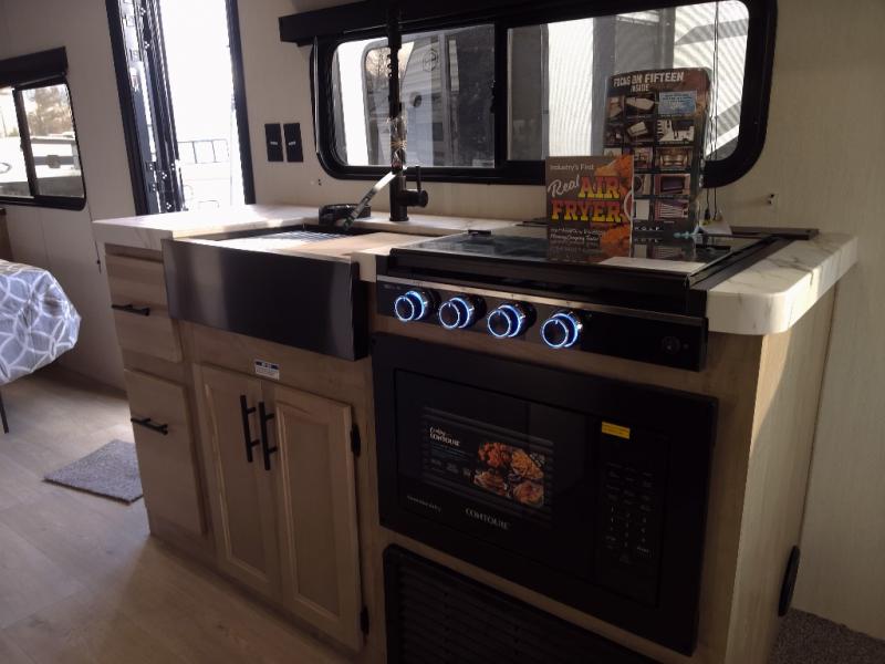 Time spent at the campground in this well designed travel trailer will be time well spent! The front bedroom includes a walk-around RV king bed, dual bedroom wardrobes plus USB ports to charge your phone or laptop. You can whip up breakfast in the modern kitchen that includes an air fryer, then dine around the U-shaped dinette with a panoramic window. This area can also double as sleeping space for one to two guests as well! A pantry will let you stock up on snacks and the TV mount means you can bring along a television if you want to enjoy movie nights. There is also a full bath with a tub/shower where you can freshen up each day!