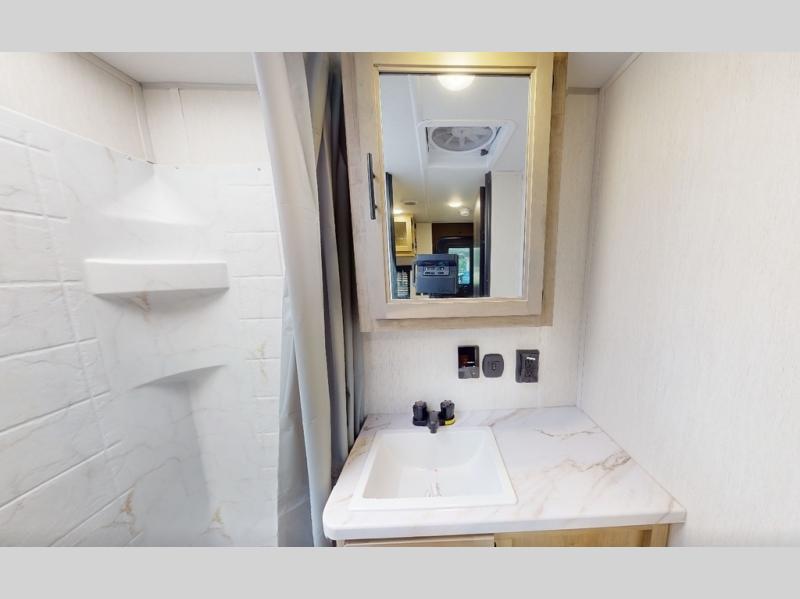 Time spent at the campground in this well designed travel trailer will be time well spent! The front bedroom includes a walk-around RV king bed, dual bedroom wardrobes plus USB ports to charge your phone or laptop. You can whip up breakfast in the modern kitchen that includes an air fryer, then dine around the U-shaped dinette with a panoramic window. This area can also double as sleeping space for one to two guests as well! A pantry will let you stock up on snacks and the TV mount means you can bring along a television if you want to enjoy movie nights. There is also a full bath with a tub/shower where you can freshen up each day!