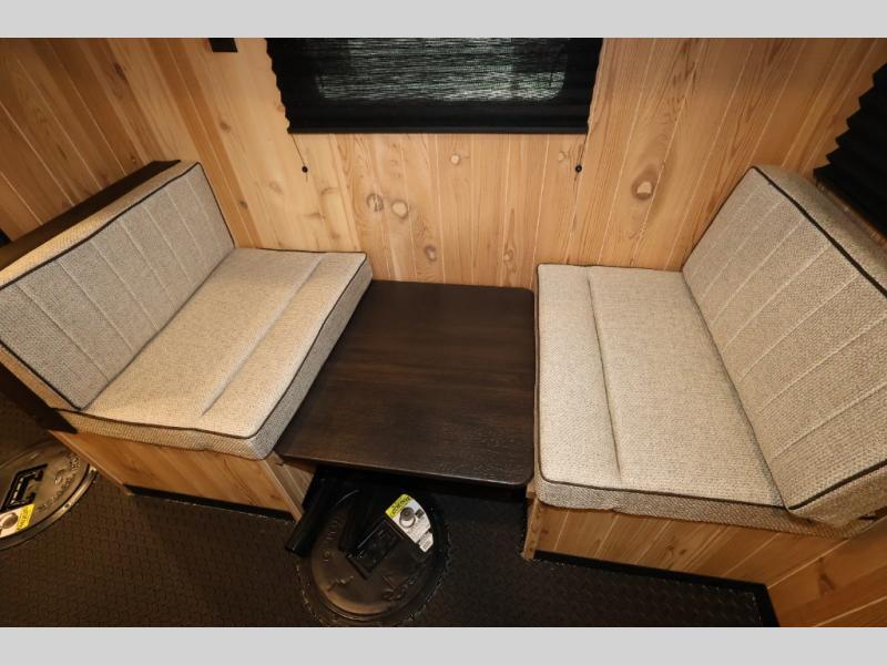 Time on the lake in this fish house will be time well spent! You will appreciate the eight fishing holes, the convenient fishing rod storage, and the front fireplace to warm you up after a day of fishing. There is a private shower with a toilet to stay clean throughout your trip, and the full kitchen will allow you to make hot meals each day. You'll find cozy sleeping space on the front sofa and electric lift bunk or on the flip-up bunks in the back. There is also bench seating in the front and back under the bunks for even more seating!