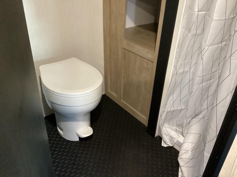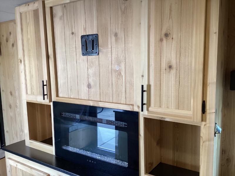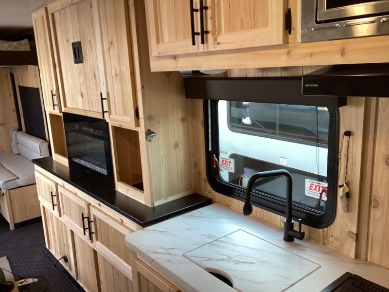 Equipped with a 3-burner cooktop, mid-sized fridge, U-dinette seating, and top-end efficiency throughout to keep you cozy in summer or winter. -