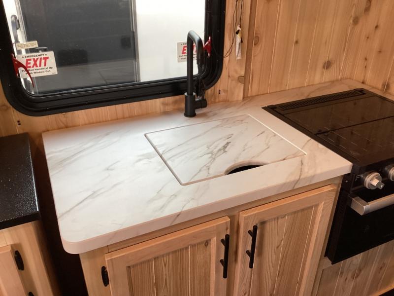 Upgraded interior includes sleek countertops and stainless accents, with USB charging and interior/exterior speakers—perfect for lakeside playlists. -
