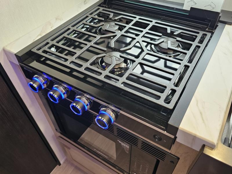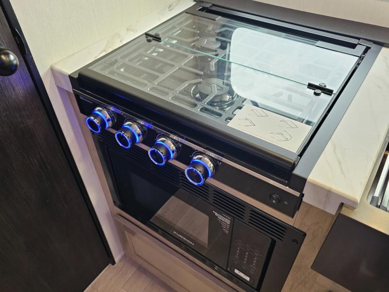 Rear corner kitchen with cooktop and built-in air fryer for quick, versatile cooking
