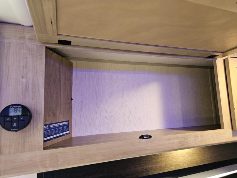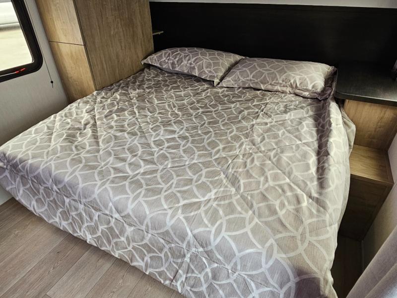 Front RV king bed with a wardrobe and a nightstand on the other side