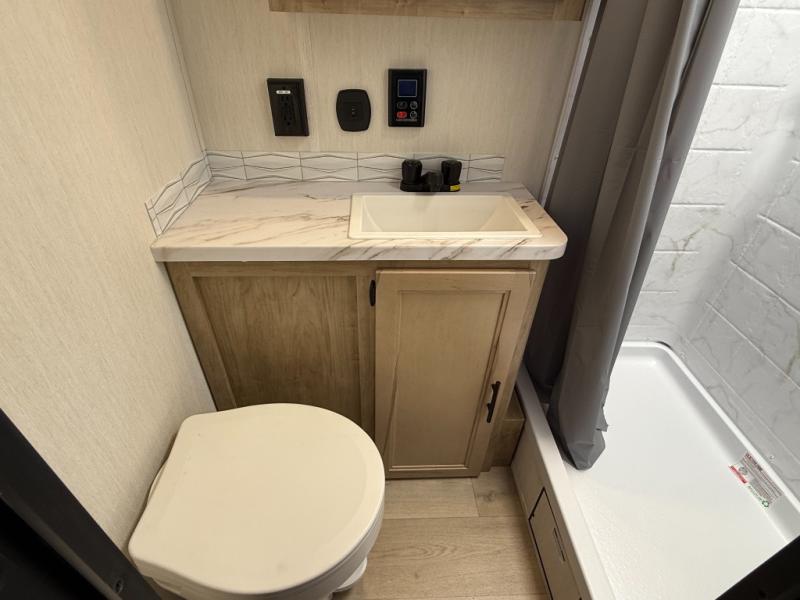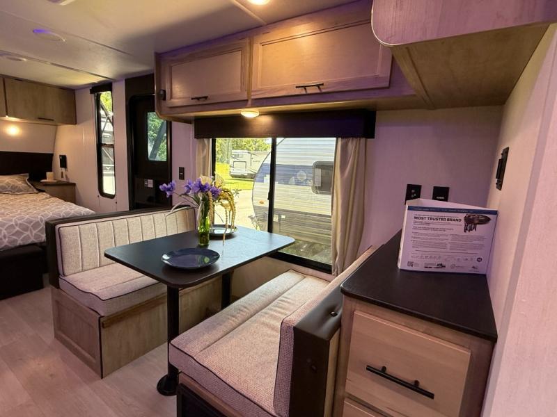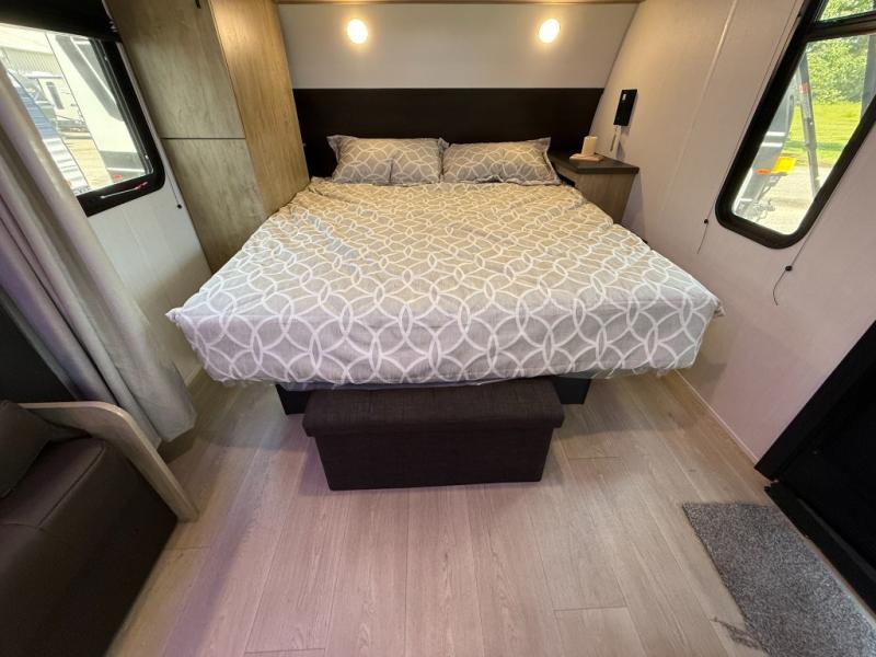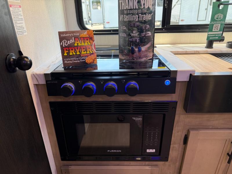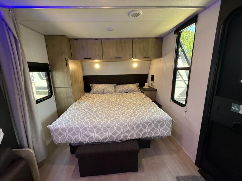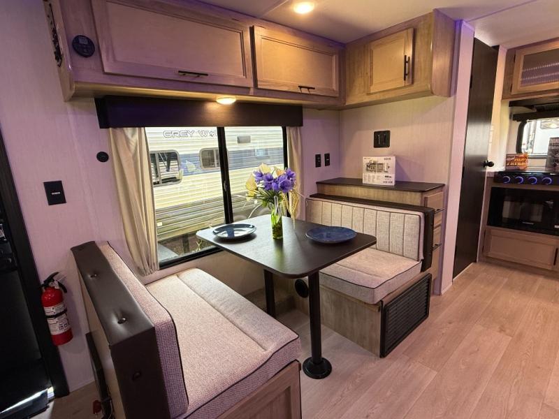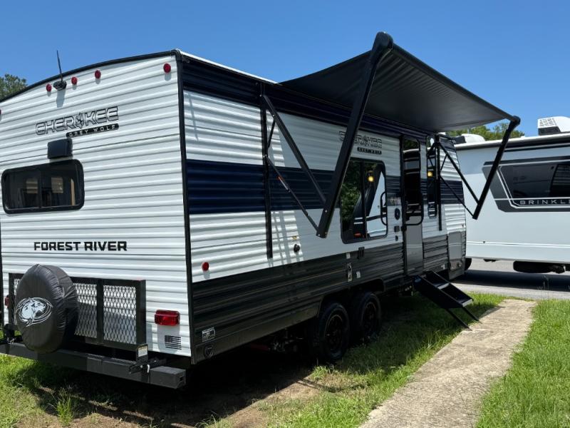 You will love traveling with this Cherokee Grey Wolf in tow. This is a great unit for a couple or family as the booth dinette and sofa can both be used for added sleeping for children or quests if needed. There is a comfortable RV king bed up front that you will love for a great night's rest with storage space in nightstands and wardrobes for your clothing and things on either side of the bed. A cooktop and air fryer is available for cooking inside, and the rear corner bath includes a tub/shower, toilet and sink. A nice 15' awning creates more outdoor living space to enjoy protected from the elements. You can also add a TV on the exterior as it has an outside TV mount.