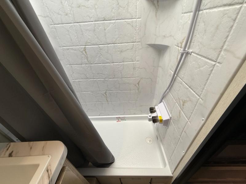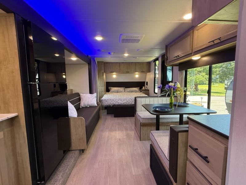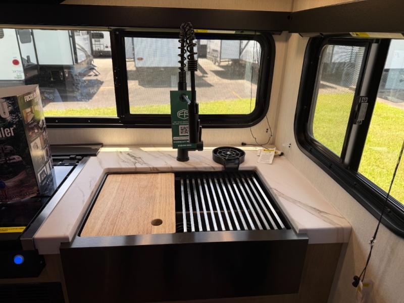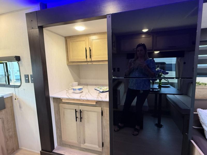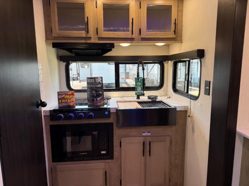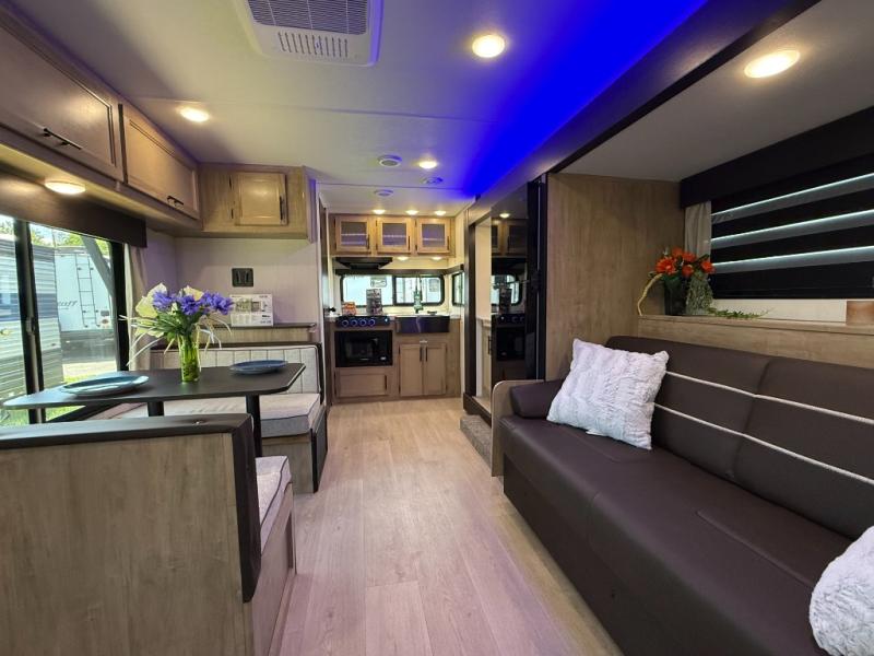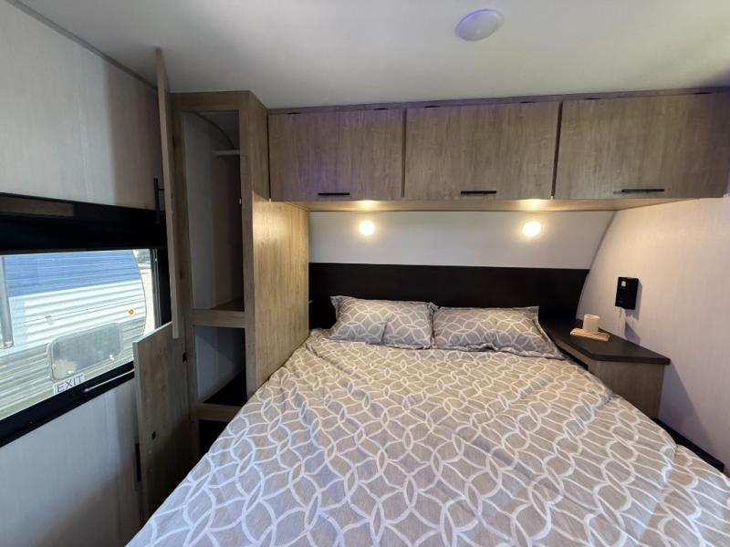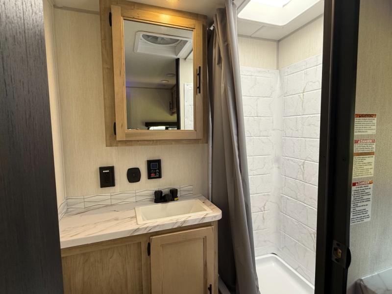 You will love traveling with this Cherokee Grey Wolf in tow. This is a great unit for a couple or family as the booth dinette and sofa can both be used for added sleeping for children or quests if needed. There is a comfortable RV king bed up front that you will love for a great night's rest with storage space in nightstands and wardrobes for your clothing and things on either side of the bed. A cooktop and air fryer is available for cooking inside, and the rear corner bath includes a tub/shower, toilet and sink. A nice 15' awning creates more outdoor living space to enjoy protected from the elements. You can also add a TV on the exterior as it has an outside TV mount.