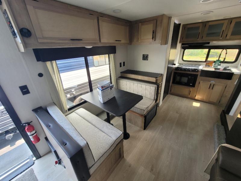 You will love traveling with this Cherokee Grey Wolf in tow. This is a great unit for a couple or family as the booth dinette and sofa can both be used for added sleeping for children or quests if needed. There is a comfortable RV king bed up front that you will love for a great night's rest with storage space in nightstands and wardrobes for your clothing and things on either side of the bed. A cooktop and air fryer is available for cooking inside, and the rear corner bath includes a tub/shower, toilet and sink. A nice 15' awning creates more outdoor living space to enjoy protected from the elements. You can also add a TV on the exterior as it has an outside TV mount.