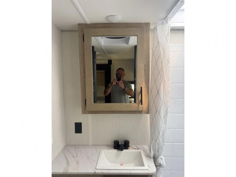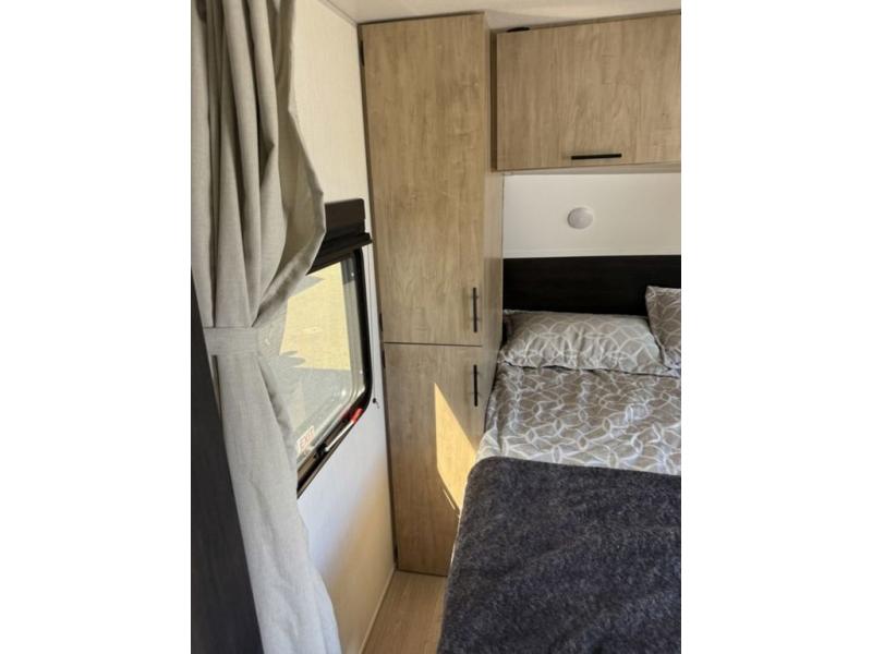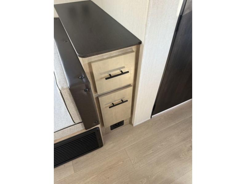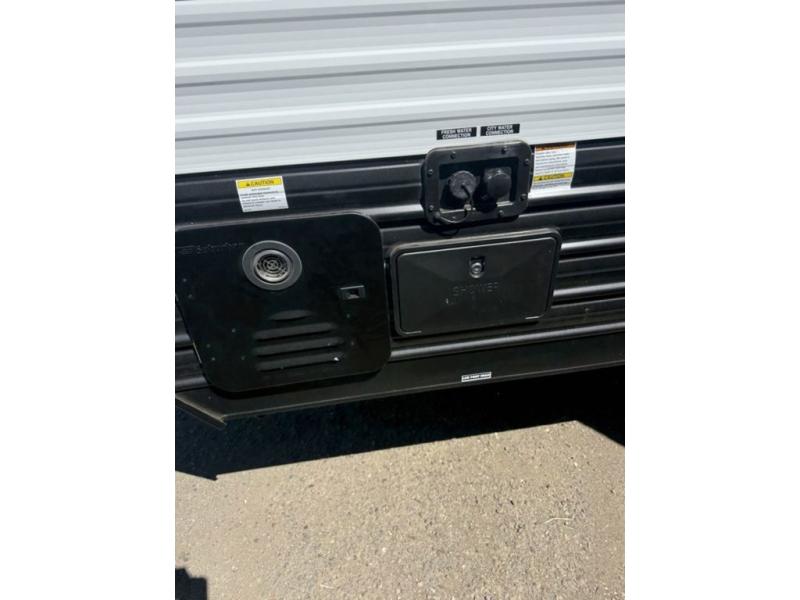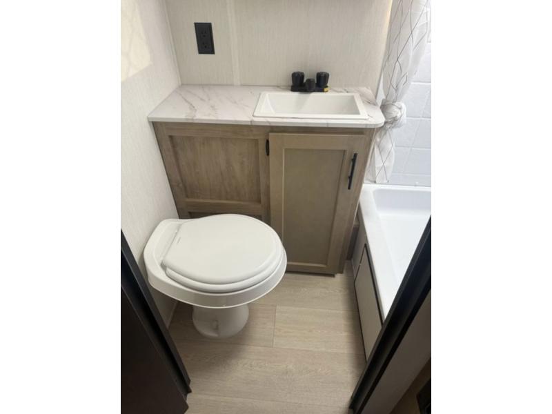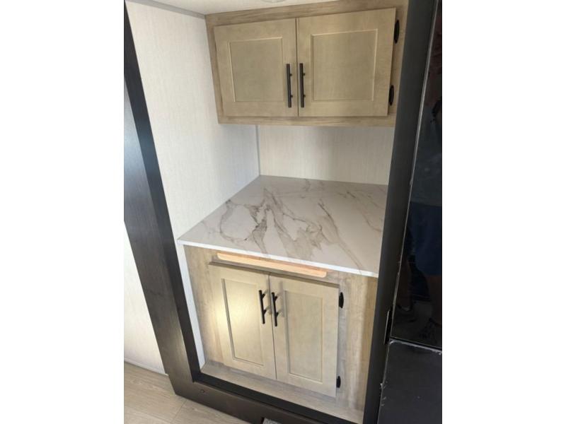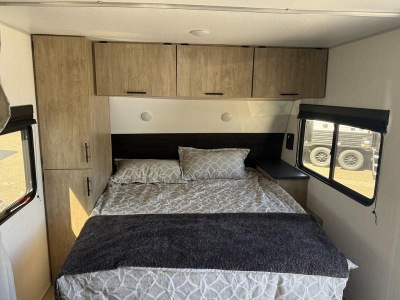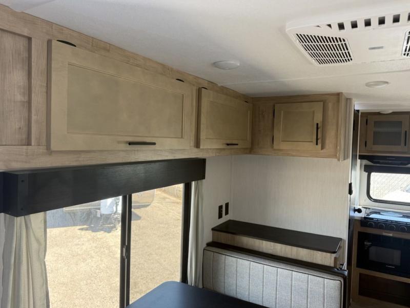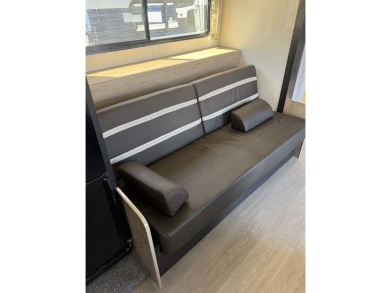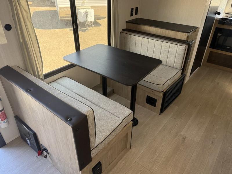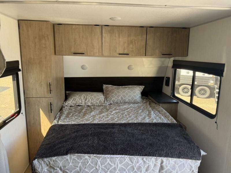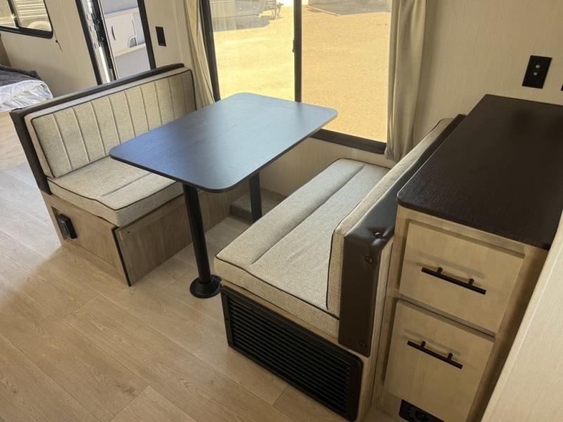 You will love traveling with this Cherokee Grey Wolf in tow. This is a great unit for a couple or family as the booth dinette and sofa can both be used for added sleeping for children or quests if needed. There is a comfortable RV king bed up front that you will love for a great night's rest with storage space in nightstands and wardrobes for your clothing and things on either side of the bed. A cooktop and air fryer is available for cooking inside, and the rear corner bath includes a tub/shower, toilet and sink. A nice 15' awning creates more outdoor living space to enjoy protected from the elements. You can also add a TV on the exterior as it has an outside TV mount.