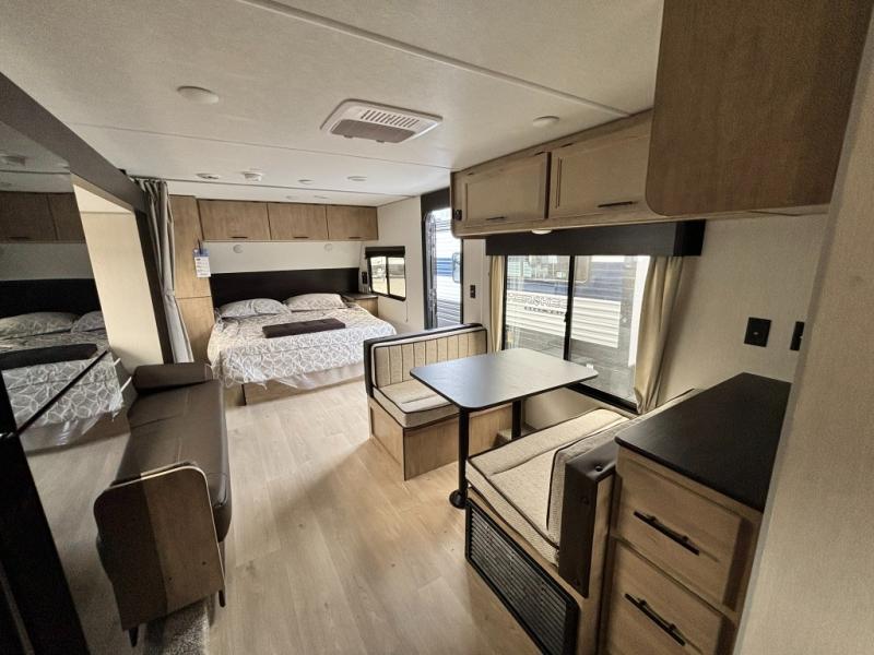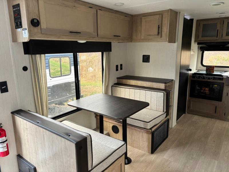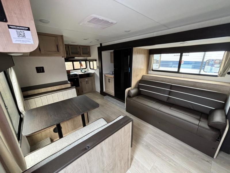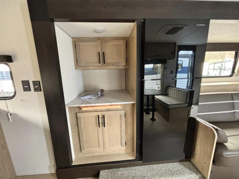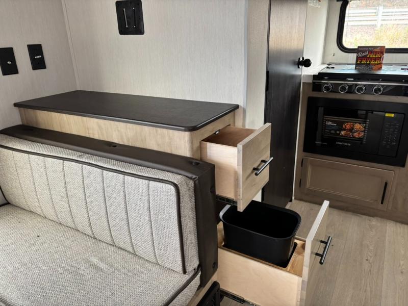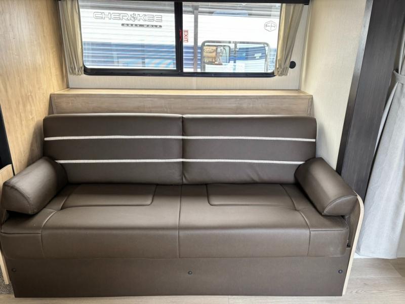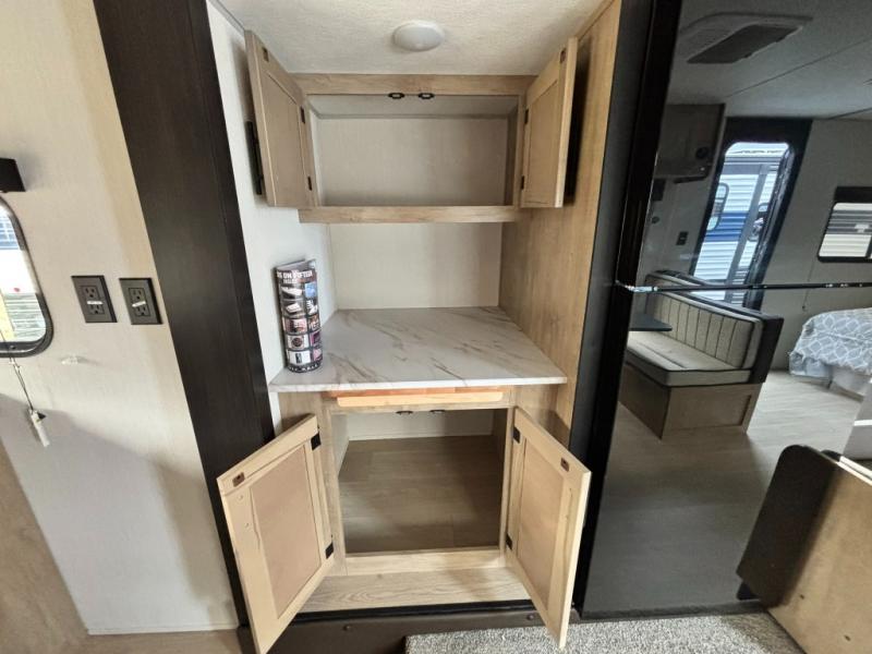 You will love traveling with this Cherokee Grey Wolf in tow. This is a great unit for a couple or family as the booth dinette and sofa can both be used for added sleeping for children or quests if needed. There is a comfortable RV king bed up front that you will love for a great night's rest with storage space in nightstands and wardrobes for your clothing and things on either side of the bed. A cooktop and air fryer is available for cooking inside, and the rear corner bath includes a tub/shower, toilet and sink. A nice 15' awning creates more outdoor living space to enjoy protected from the elements. You can also add a TV on the exterior as it has an outside TV mount.