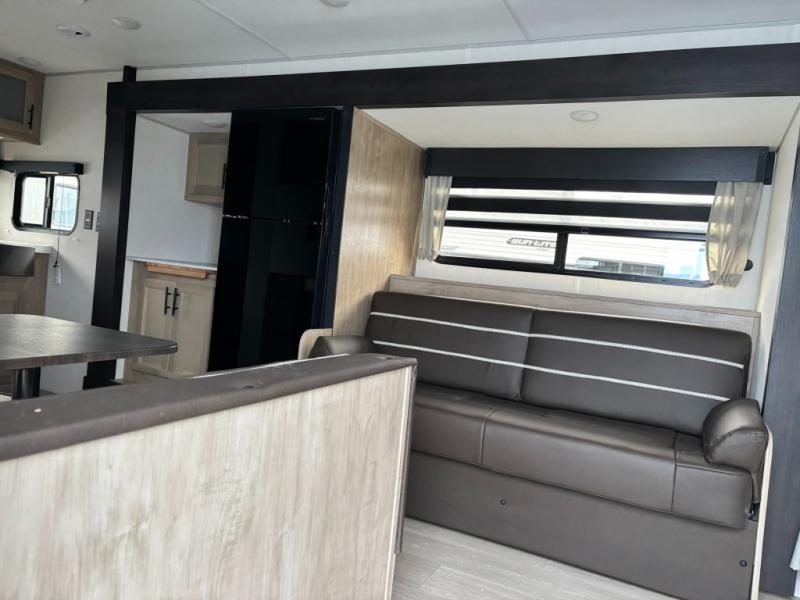 You will love traveling with this Cherokee Grey Wolf in tow. This is a great unit for a couple or family as the booth dinette and sofa can both be used for added sleeping for children or quests if needed. There is a comfortable RV king bed up front that you will love for a great night's rest with storage space in nightstands and wardrobes for your clothing and things on either side of the bed. A cooktop and air fryer is available for cooking inside, and the rear corner bath includes a tub/shower, toilet and sink. A nice 15' awning creates more outdoor living space to enjoy protected from the elements. You can also add a TV on the exterior as it has an outside TV mount.
