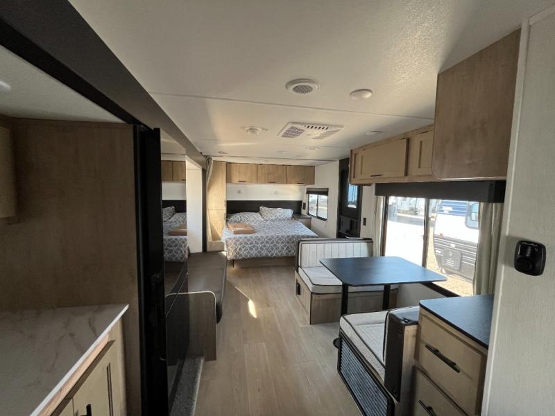 You will love traveling with this Cherokee Grey Wolf in tow. This is a great unit for a couple or family as the booth dinette and sofa can both be used for added sleeping for children or quests if needed. There is a comfortable RV king bed up front that you will love for a great night's rest with storage space in nightstands and wardrobes for your clothing and things on either side of the bed. A cooktop and air fryer is available for cooking inside, and the rear corner bath includes a tub/shower, toilet and sink. A nice 15' awning creates more outdoor living space to enjoy protected from the elements. You can also add a TV on the exterior as it has an outside TV mount.