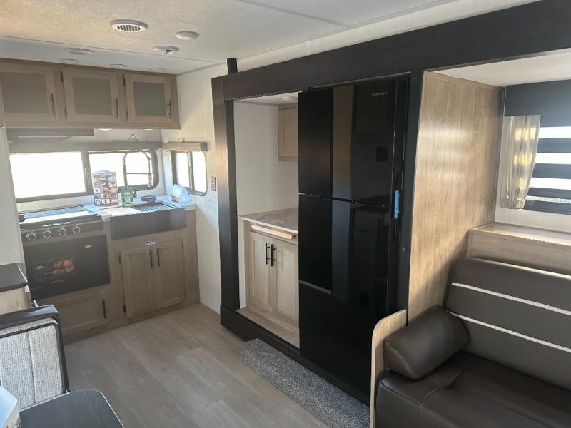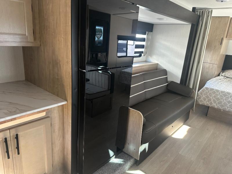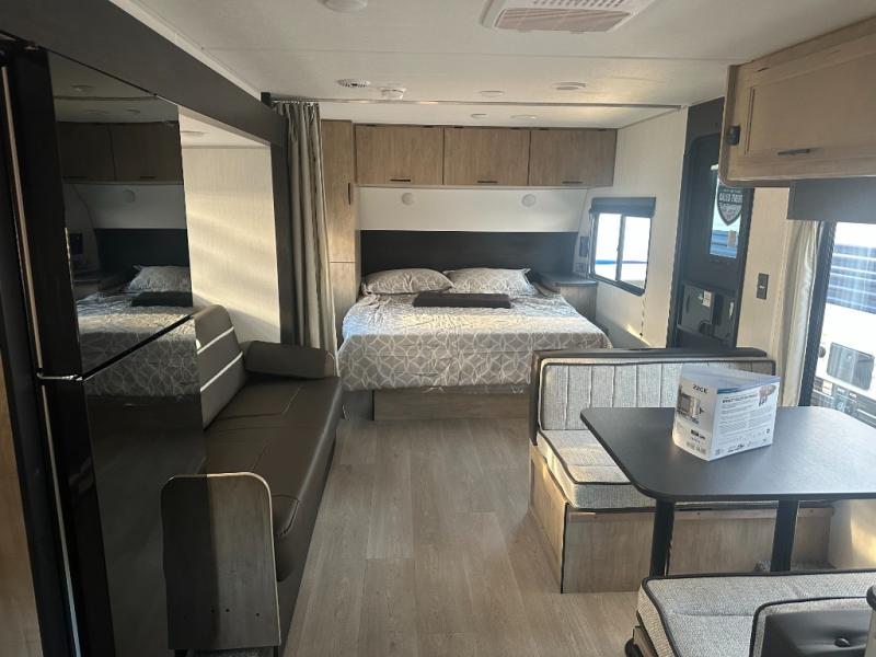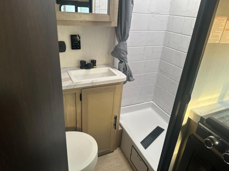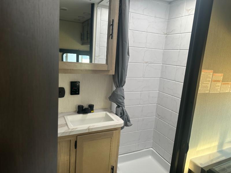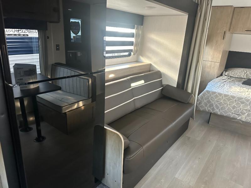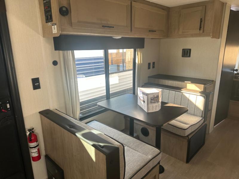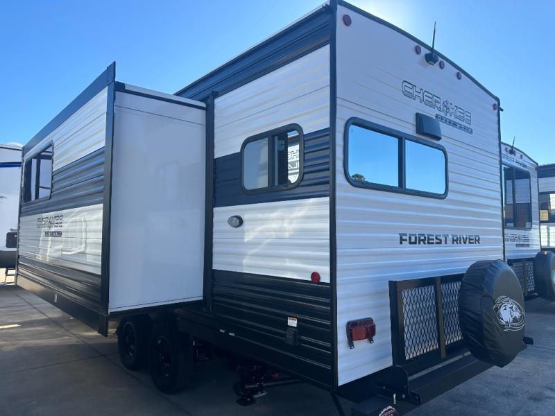 You will love traveling with this Cherokee Grey Wolf in tow. This is a great unit for a couple or family as the booth dinette and sofa can both be used for added sleeping for children or quests if needed. There is a comfortable RV king bed up front that you will love for a great night's rest with storage space in nightstands and wardrobes for your clothing and things on either side of the bed. A cooktop and air fryer is available for cooking inside, and the rear corner bath includes a tub/shower, toilet and sink. A nice 15' awning creates more outdoor living space to enjoy protected from the elements. You can also add a TV on the exterior as it has an outside TV mount.