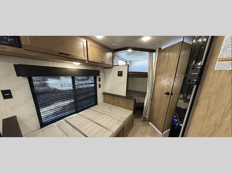 The whole family will love this travel trailer for weekend trips to the lake! When you arrive at the campground, unload the outside storage, set up the 15' patio awning, then take a hike to stretch your legs. The full kitchen with an included air fryer will let you prepare a quick lunch, and the full bath is there to freshen up each day. You will sleep soundly on the front RV king bed with dual bedroom wardrobes and USB ports, while the little ones or your guests take the double-size bunk beds! There is also a booth dinette that can double as dining and sleeping space for one to two more campers; now, that's convenient!