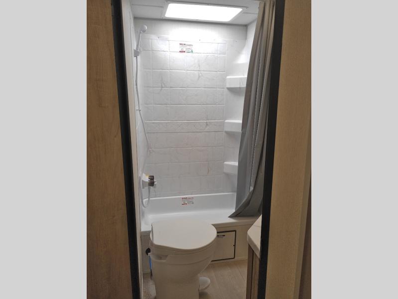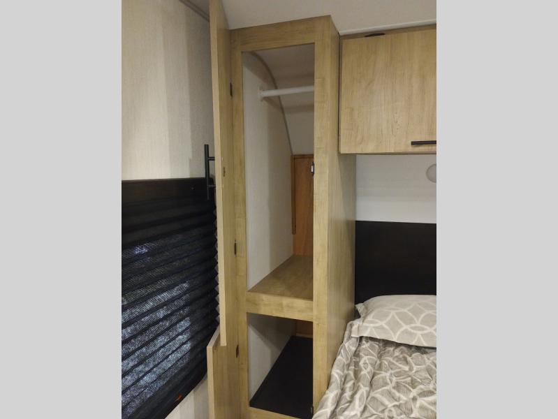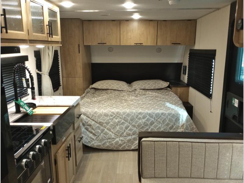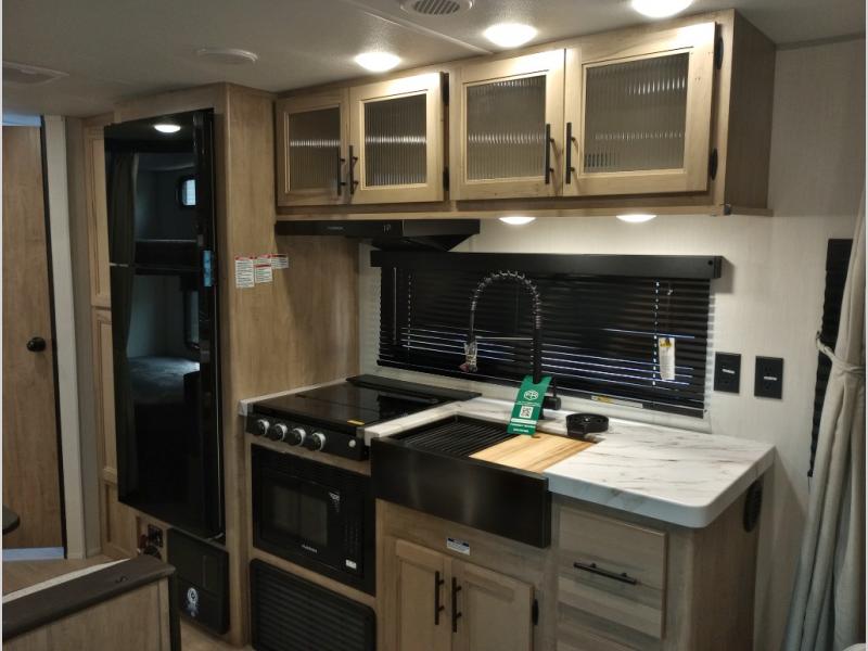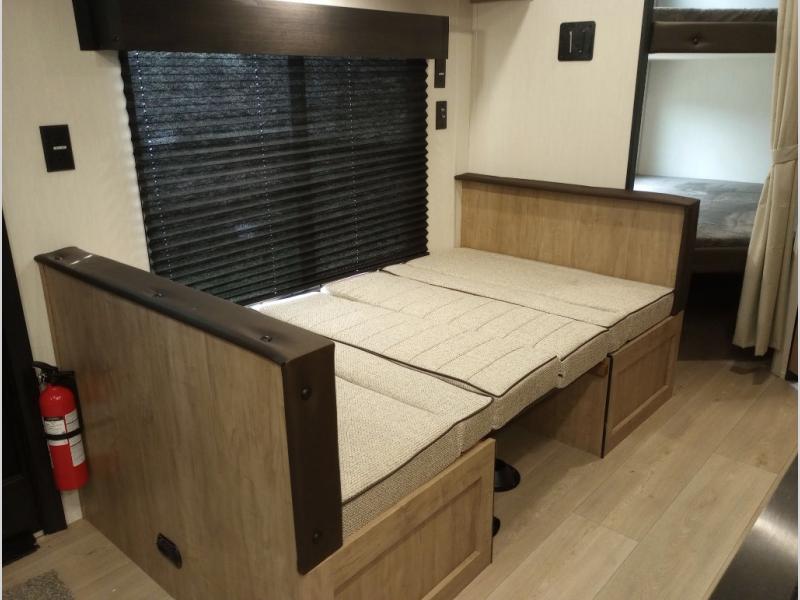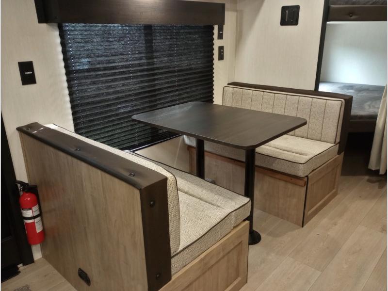 The whole family will love this travel trailer for weekend trips to the lake! When you arrive at the campground, unload the outside storage, set up the 15' patio awning, then take a hike to stretch your legs. The full kitchen with an included air fryer will let you prepare a quick lunch, and the full bath is there to freshen up each day. You will sleep soundly on the front RV king bed with dual bedroom wardrobes and USB ports, while the little ones or your guests take the double-size bunk beds! There is also a booth dinette that can double as dining and sleeping space for one to two more campers; now, that's convenient!