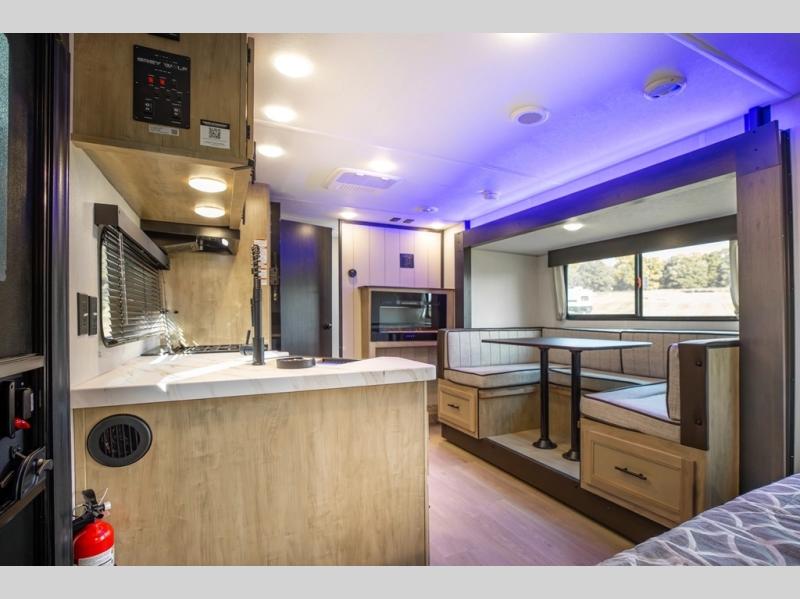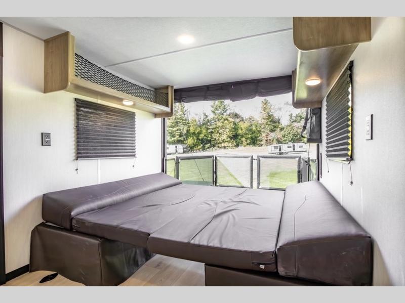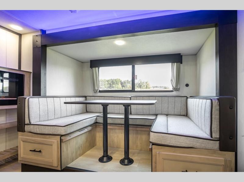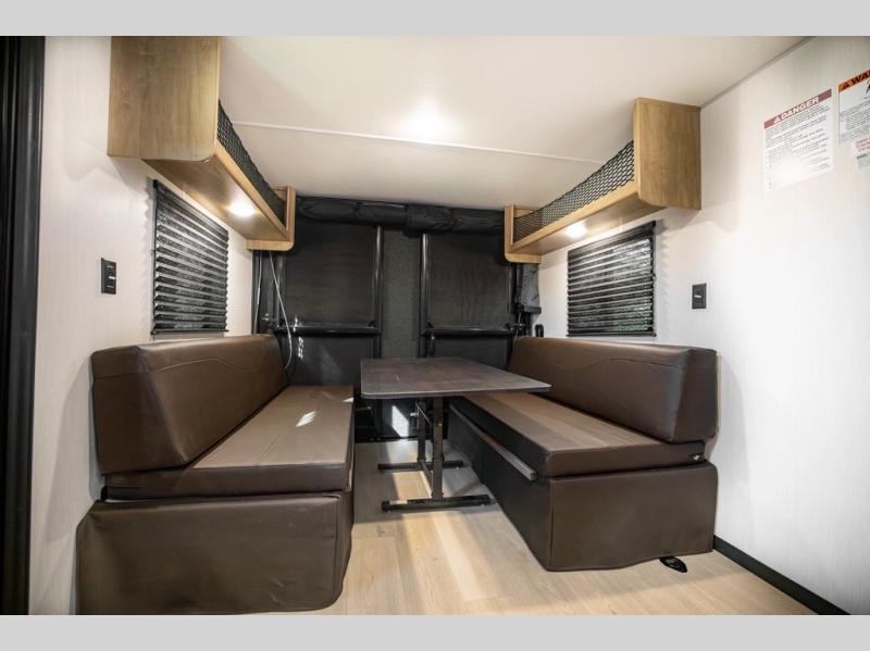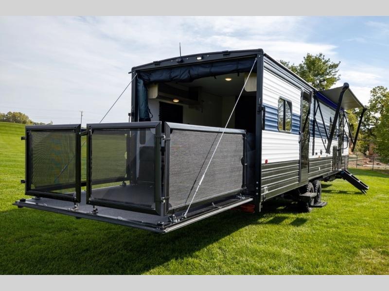 You will love this Cherokee Grey Wolf toy hauler with a rear ramp door for loading and unloading your toys and gear. If you position the fold-down sofas up against the wall, you will have even more room for extra gear when you are moving down the road. Set up camp and easily create a great dining area with the removable table between each fold-down sofa. You can also create your best meals in a breeze with the airy fryer or cooktop. A large pantry allows you to pack all of the snacks and canned goods you need for your adventure. You will appreciate the master suite up front for a great night's rest on the RV king bed along with easy access into the dual-entry bath.