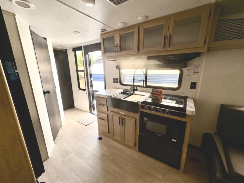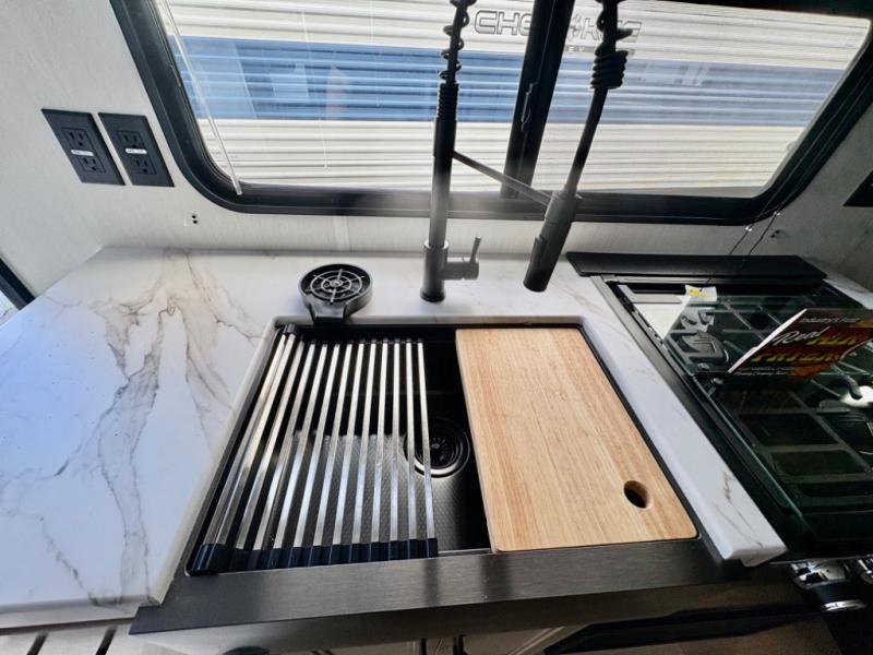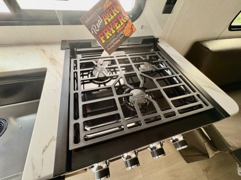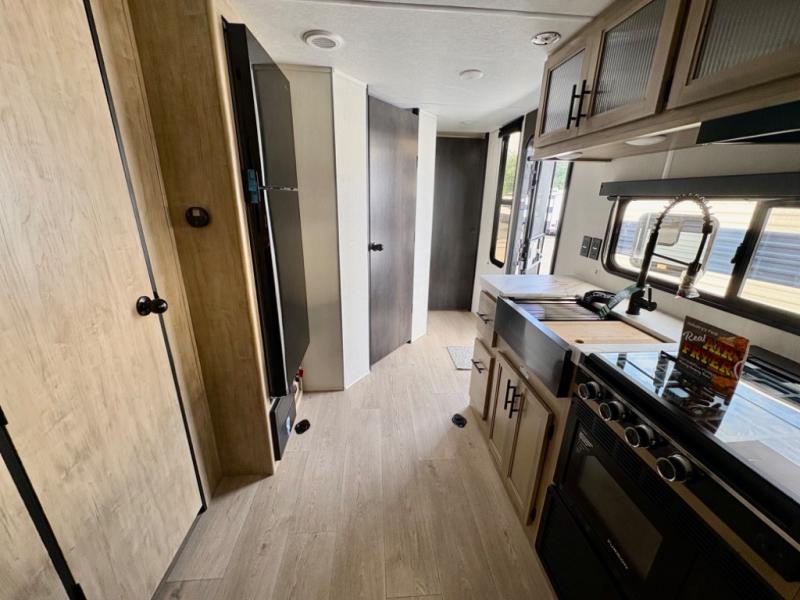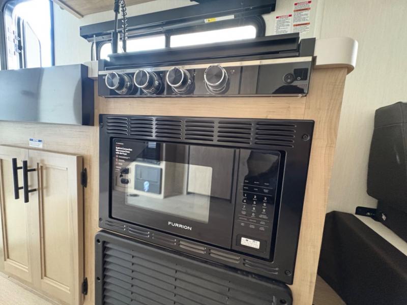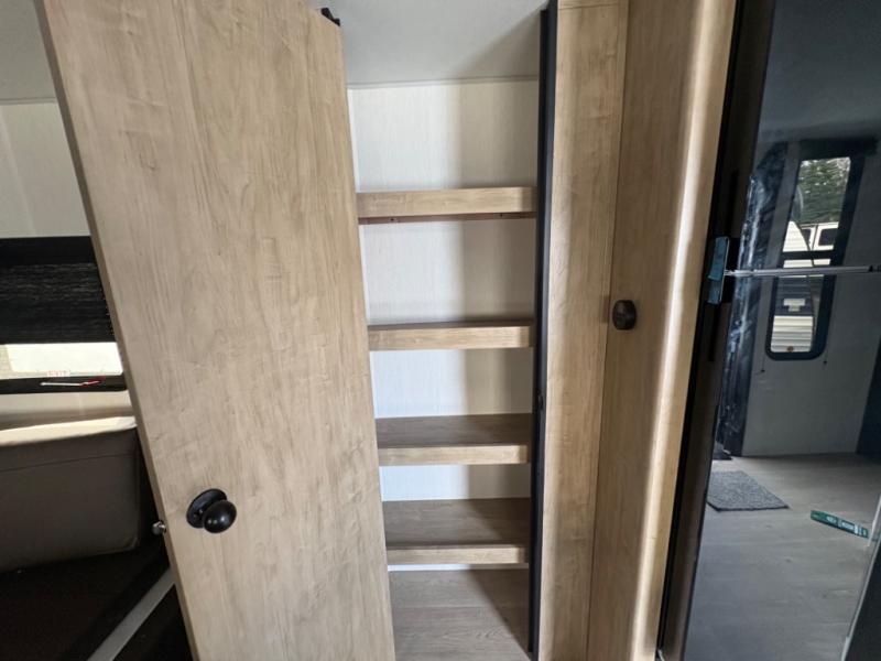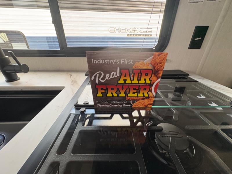 You will love this Cherokee Grey Wolf toy hauler with a rear ramp door for loading and unloading your toys and gear. If you position the fold-down sofas up against the wall, you will have even more room for extra gear when you are moving down the road. Set up camp and easily create a great dining area with the removable table between each fold-down sofa. You can also create your best meals in a breeze with the airy fryer or cooktop. A large pantry allows you to pack all of the snacks and canned goods you need for your adventure. You will appreciate the master suite up front for a great night's rest on the RV king bed along with easy access into the dual-entry bath.