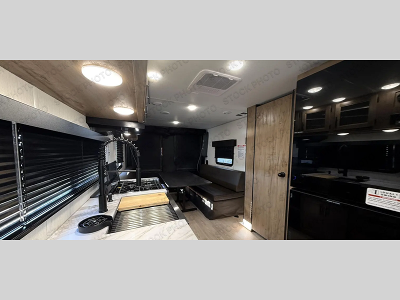 You will love this Cherokee Grey Wolf toy hauler with a rear ramp door for loading and unloading your toys and gear. If you position the fold-down sofas up against the wall, you will have even more room for extra gear when you are moving down the road. Set up camp and easily create a great dining area with the removable table between each fold-down sofa. You can also create your best meals in a breeze with the airy fryer or cooktop. A large pantry allows you to pack all of the snacks and canned goods you need for your adventure. You will appreciate the master suite up front for a great night's rest on the RV king bed along with easy access into the dual-entry bath.