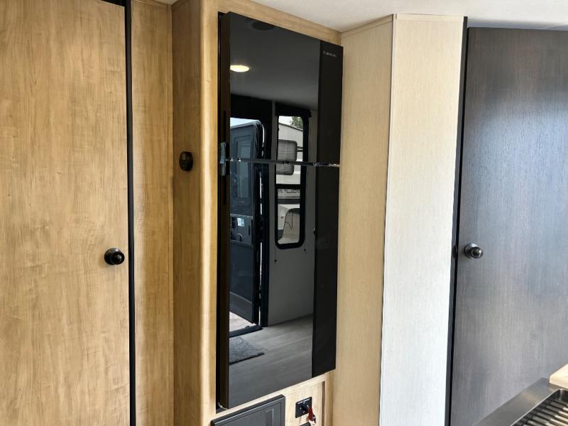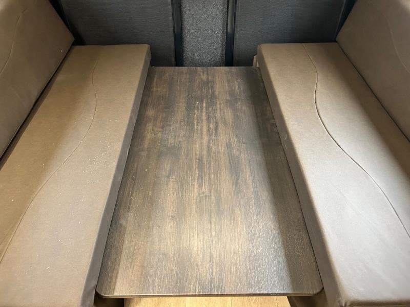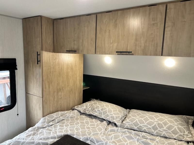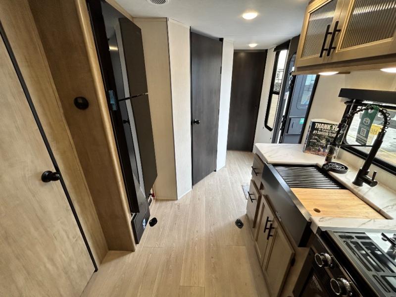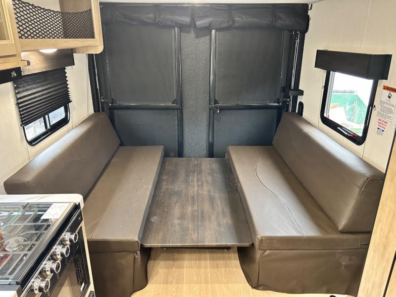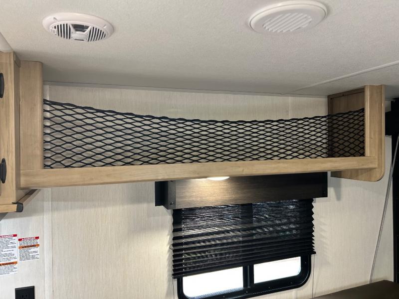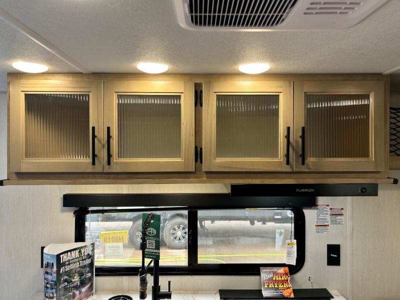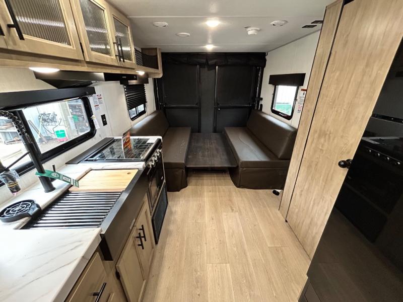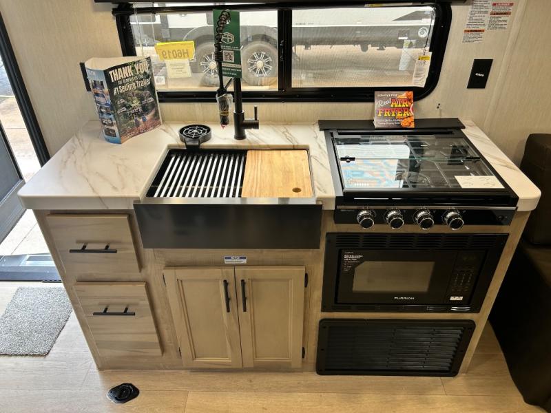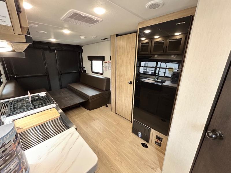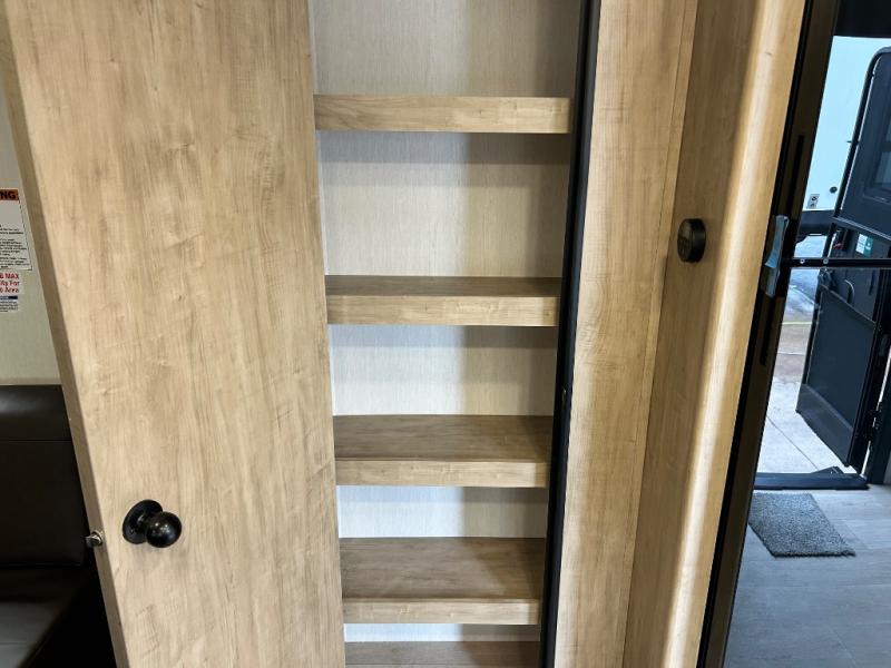 You will love this Cherokee Grey Wolf toy hauler with a rear ramp door for loading and unloading your toys and gear. If you position the fold-down sofas up against the wall, you will have even more room for extra gear when you are moving down the road. Set up camp and easily create a great dining area with the removable table between each fold-down sofa. You can also create your best meals in a breeze with the airy fryer or cooktop. A large pantry allows you to pack all of the snacks and canned goods you need for your adventure. You will appreciate the master suite up front for a great night's rest on the RV king bed along with easy access into the dual-entry bath.