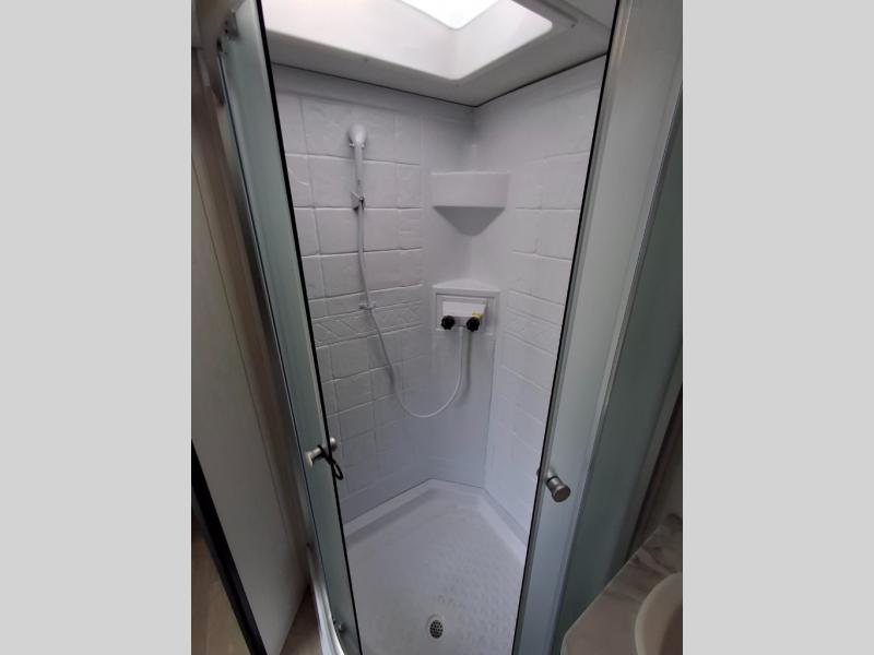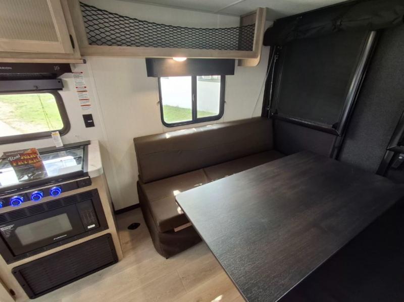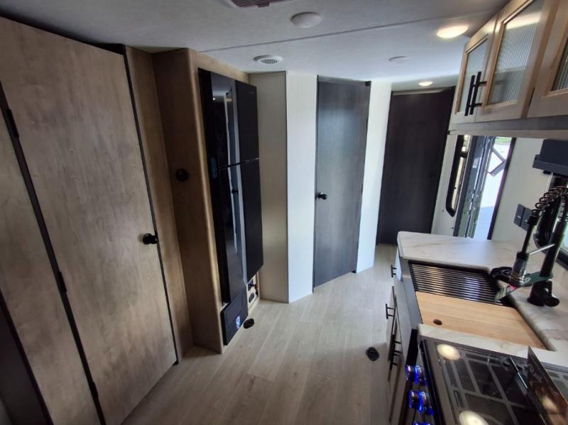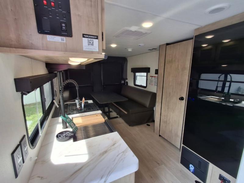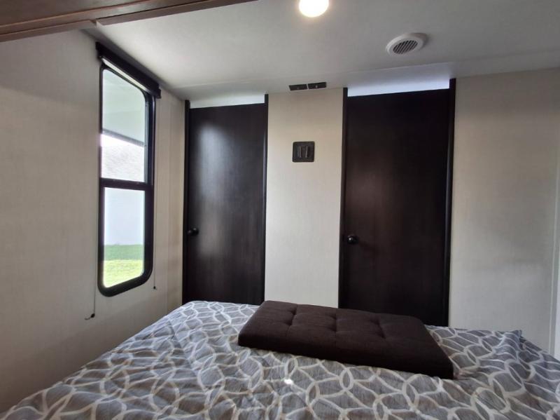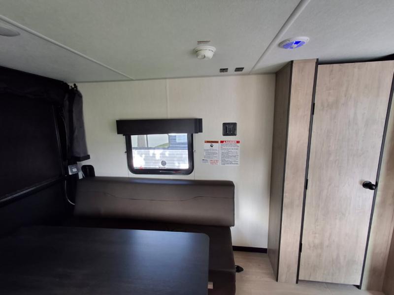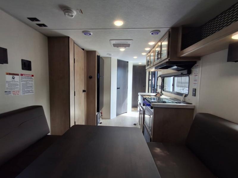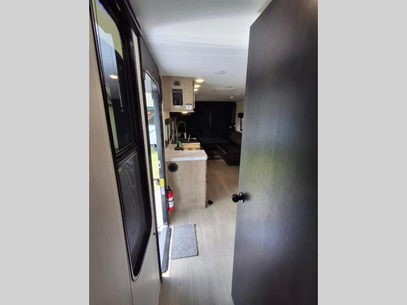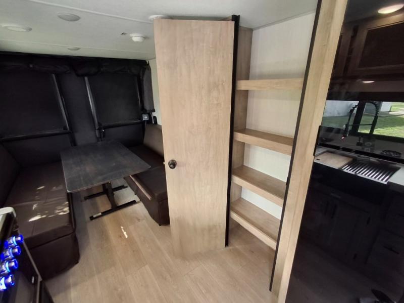 You will love this Cherokee Grey Wolf toy hauler with a rear ramp door for loading and unloading your toys and gear. If you position the fold-down sofas up against the wall, you will have even more room for extra gear when you are moving down the road. Set up camp and easily create a great dining area with the removable table between each fold-down sofa. You can also create your best meals in a breeze with the airy fryer or cooktop. A large pantry allows you to pack all of the snacks and canned goods you need for your adventure. You will appreciate the master suite up front for a great night's rest on the RV king bed along with easy access into the dual-entry bath.