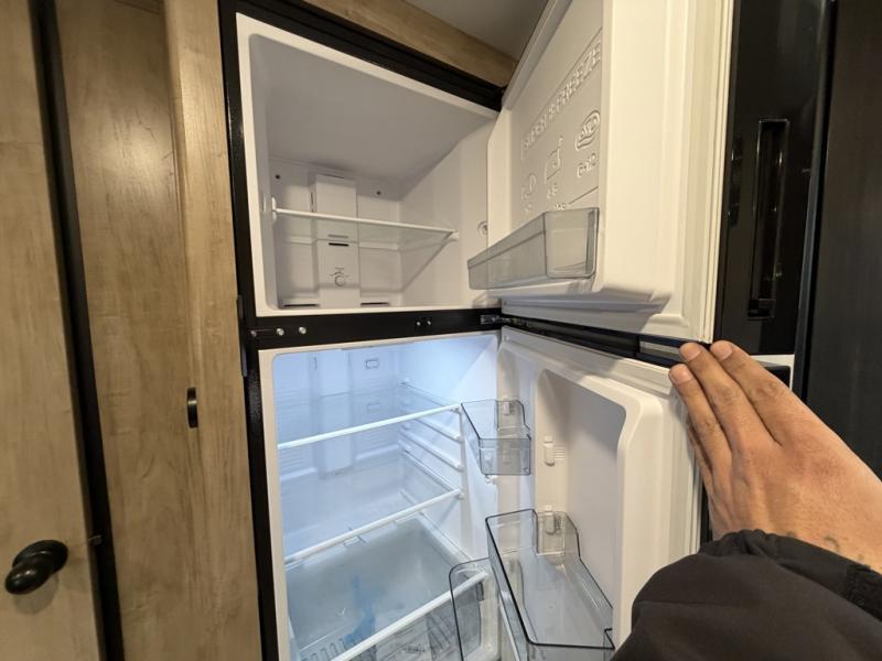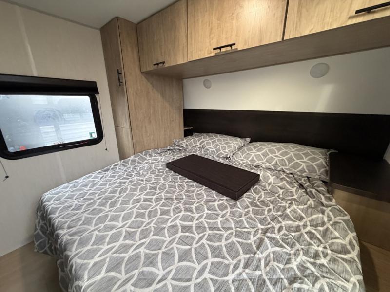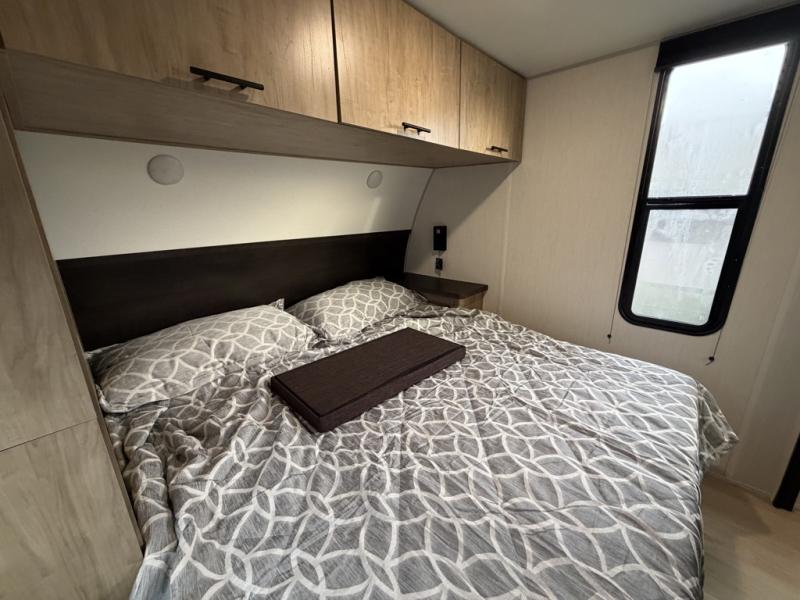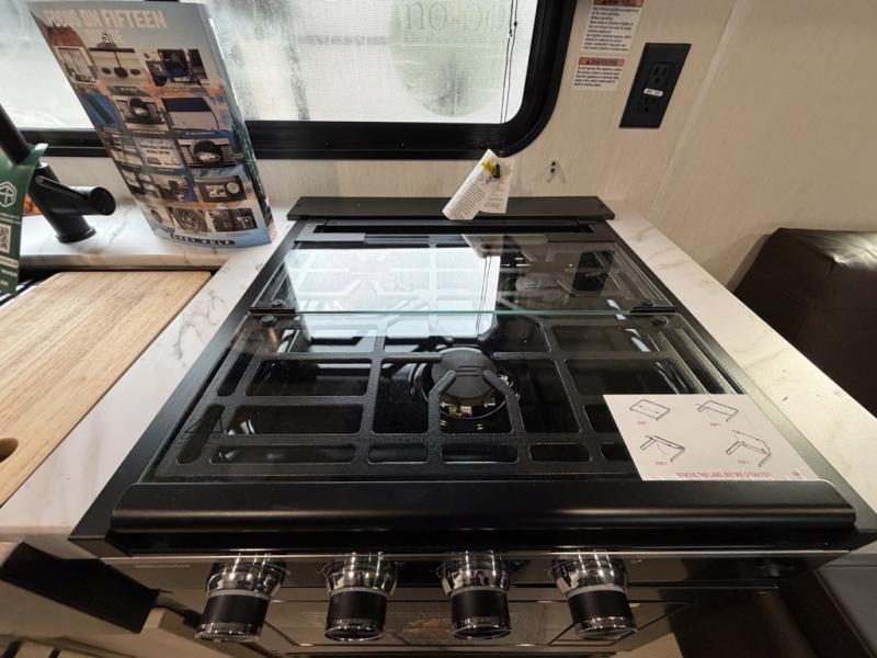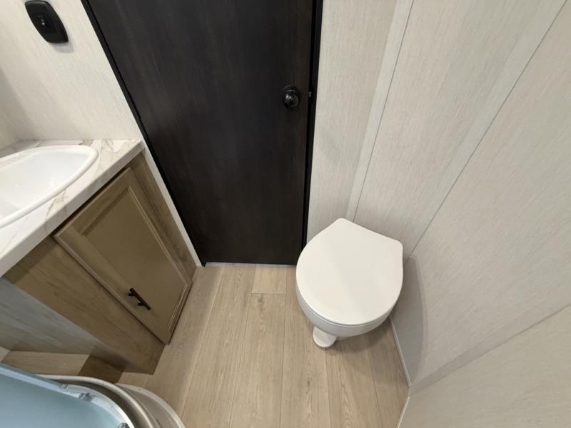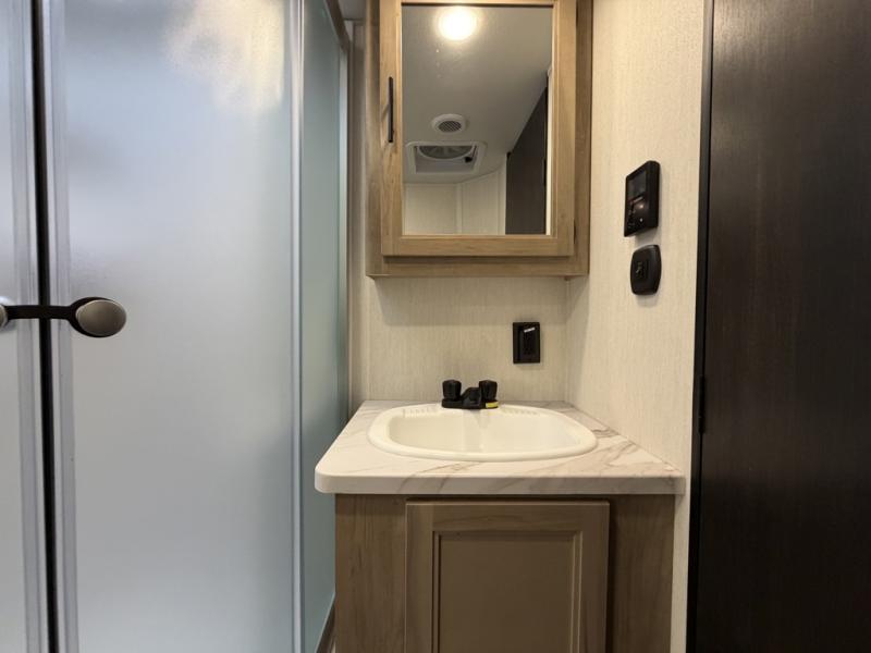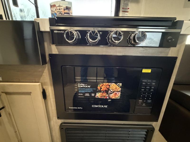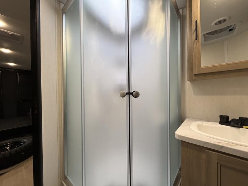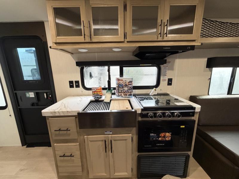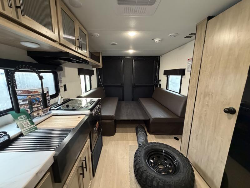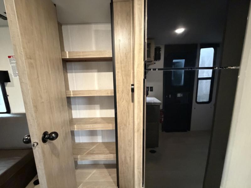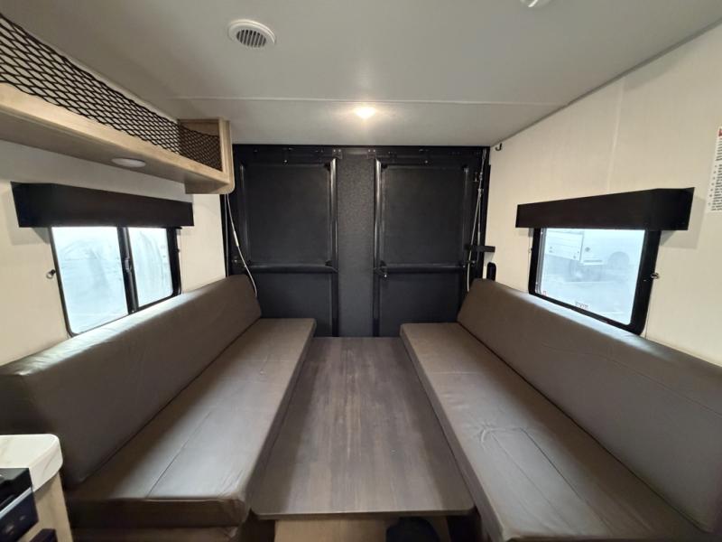 You will love this Cherokee Grey Wolf toy hauler with a rear ramp door for loading and unloading your toys and gear. If you position the fold-down sofas up against the wall, you will have even more room for extra gear when you are moving down the road. Set up camp and easily create a great dining area with the removable table between each fold-down sofa. You can also create your best meals in a breeze with the airy fryer or cooktop. A large pantry allows you to pack all of the snacks and canned goods you need for your adventure. You will appreciate the master suite up front for a great night's rest on the RV king bed along with easy access into the dual-entry bath.
