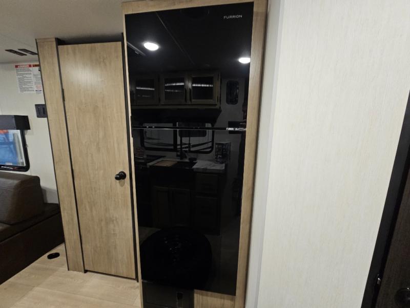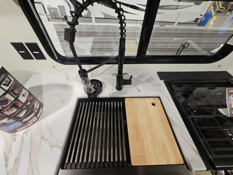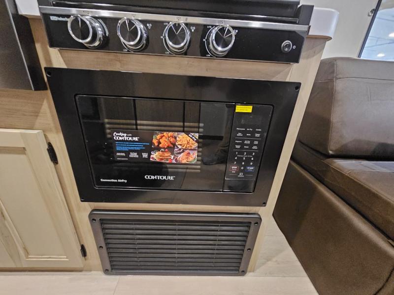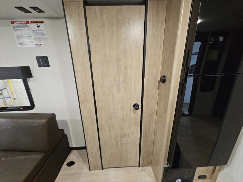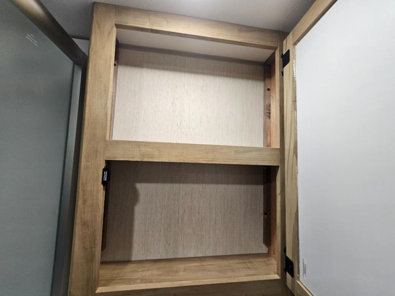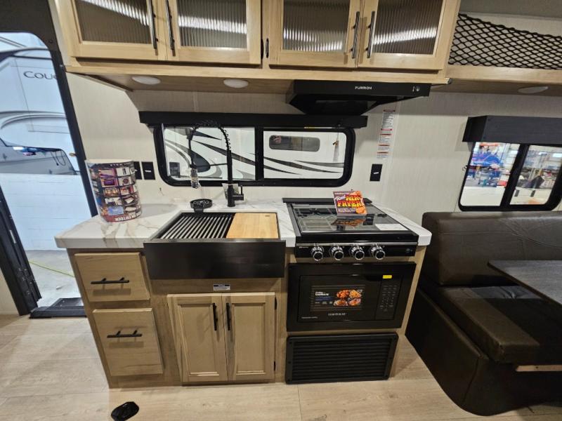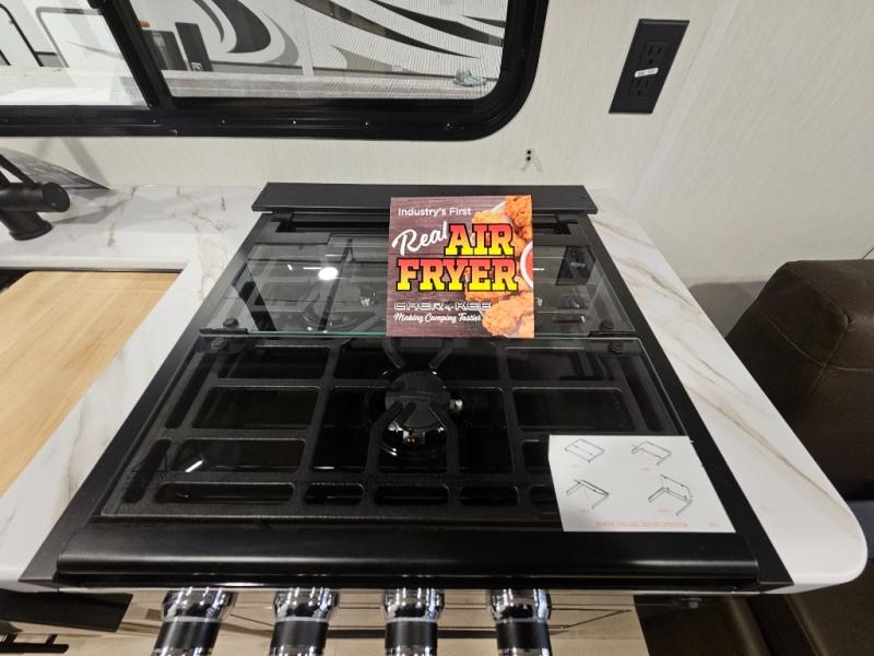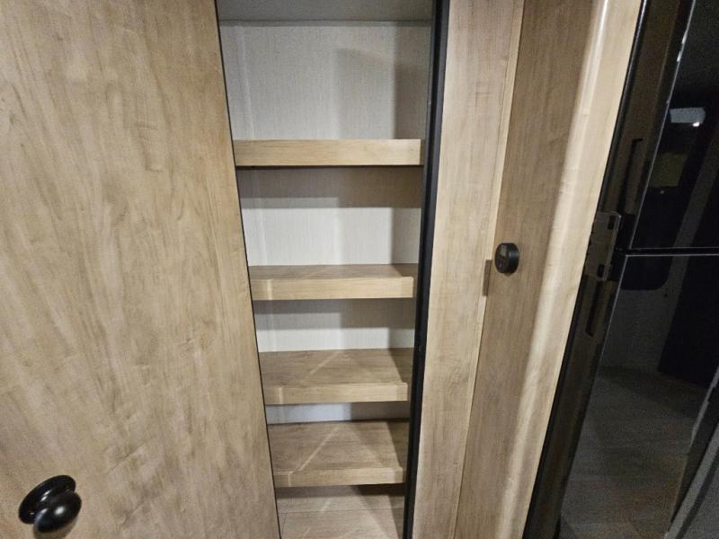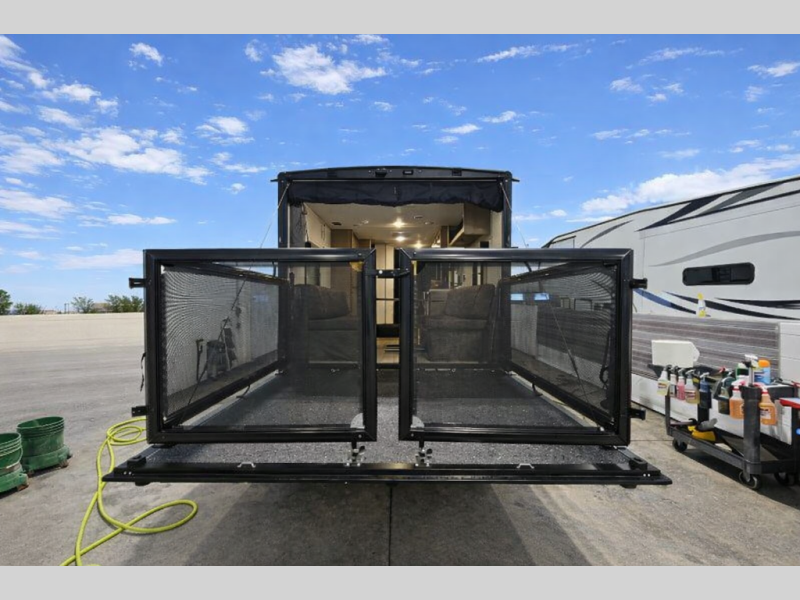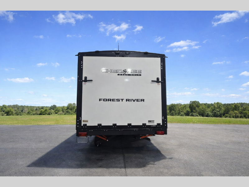 You will love this Cherokee Grey Wolf toy hauler with a rear ramp door for loading and unloading your toys and gear. If you position the fold-down sofas up against the wall, you will have even more room for extra gear when you are moving down the road. Set up camp and easily create a great dining area with the removable table between each fold-down sofa. You can also create your best meals in a breeze with the airy fryer or cooktop. A large pantry allows you to pack all of the snacks and canned goods you need for your adventure. You will appreciate the master suite up front for a great night's rest on the RV king bed along with easy access into the dual-entry bath.