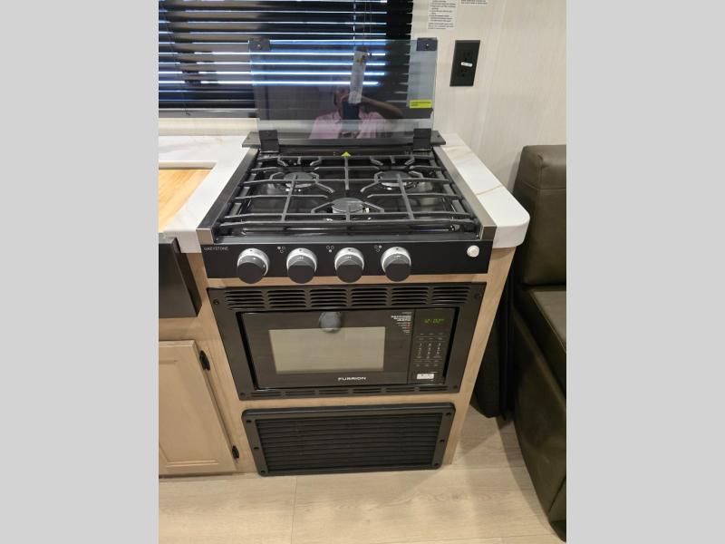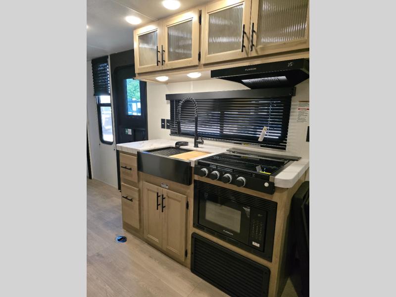 You will love this Cherokee Grey Wolf toy hauler with a rear ramp door for loading and unloading your toys and gear. If you position the fold-down sofas up against the wall, you will have even more room for extra gear when you are moving down the road. Set up camp and easily create a great dining area with the removable table between each fold-down sofa. You can also create your best meals in a breeze with the airy fryer or cooktop. A large pantry allows you to pack all of the snacks and canned goods you need for your adventure. You will appreciate the master suite up front for a great night's rest on the RV king bed along with easy access into the dual-entry bath.