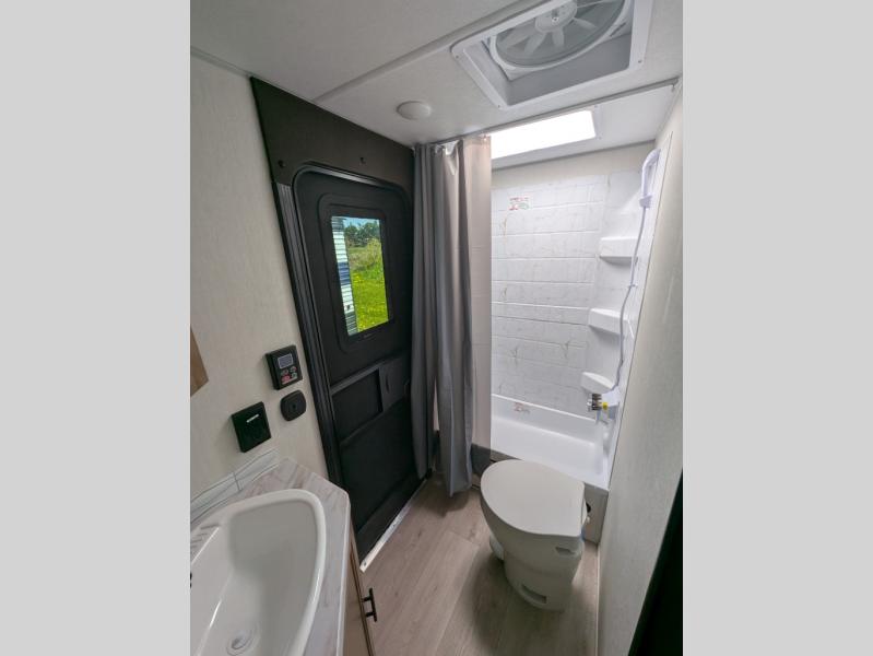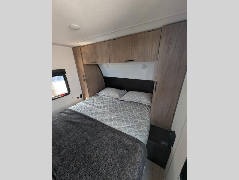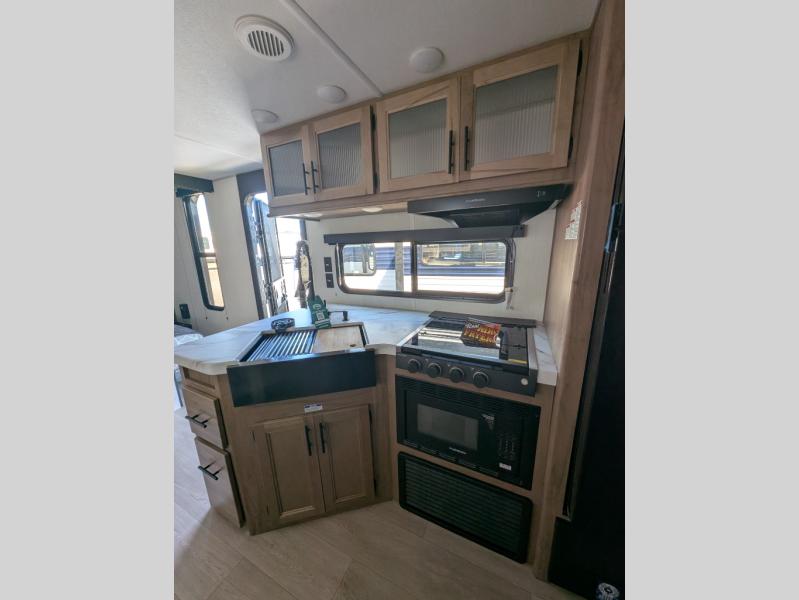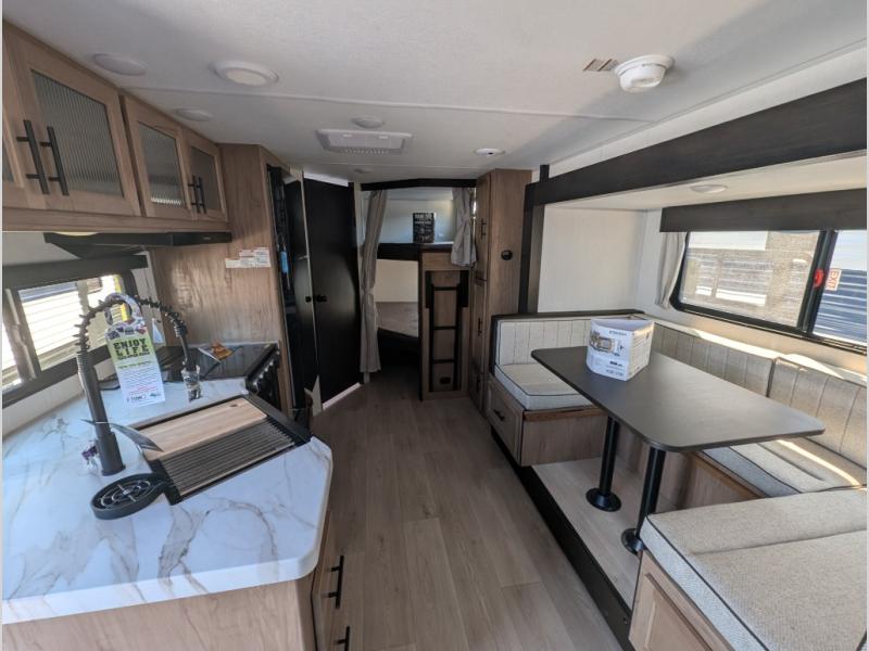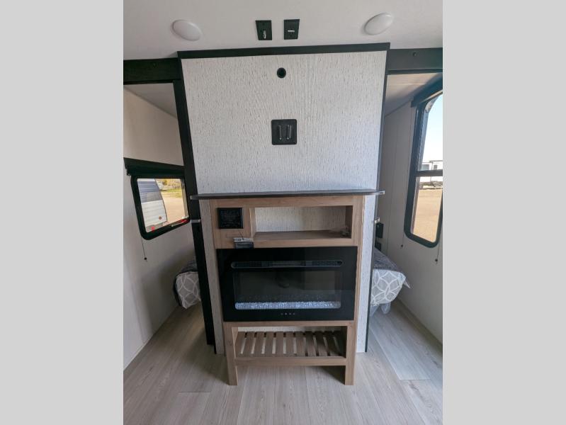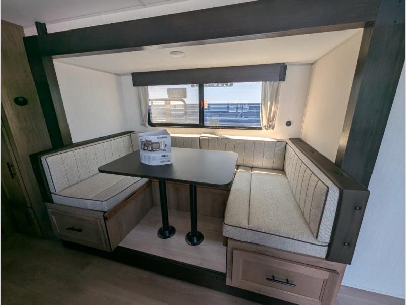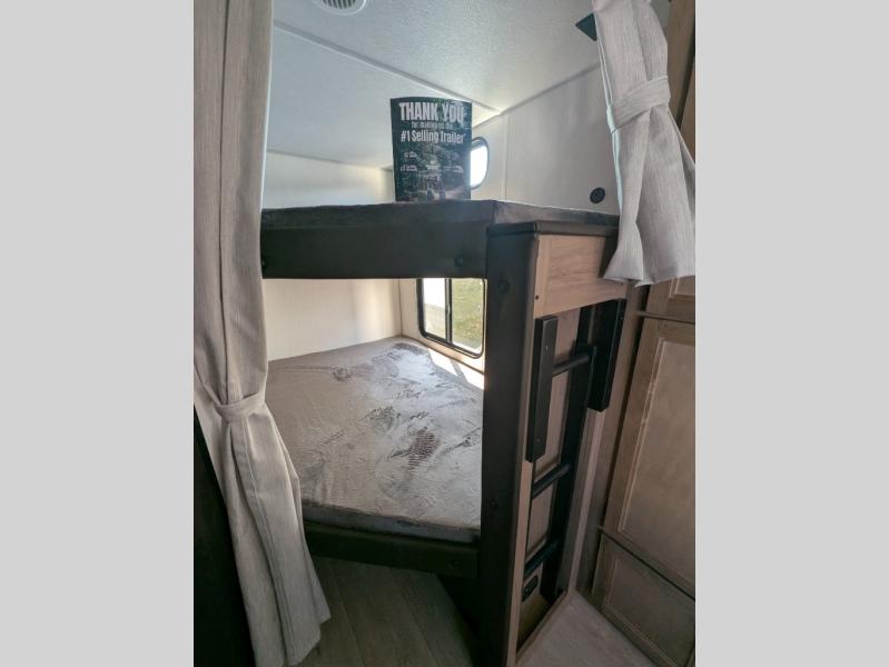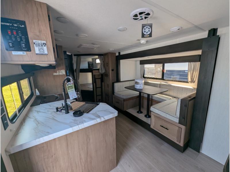 You will love the space provided in this dual entry Cherokee Grey Wolf travel trailer that has double-size bunks! The rear entry door leads right into the full bath allowing easy access from outside when you need to use the bathroom while you're enjoying the great outdoors. The large U-shaped dinette slide will not only seat everyone comfortably for a meal or a game, but since it also slides out, it opens up the interior even more to give you plenty of space for foot traffic. For all of your outdoor gear, you will find the outside storage compartments handy for stowing away your things when not in use. While the kids enjoy their bunk beds, you will enjoy a good night's rest in your RV king bed with wardrobes on either side up in the front private bedroom!