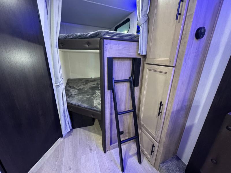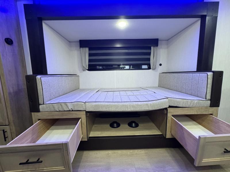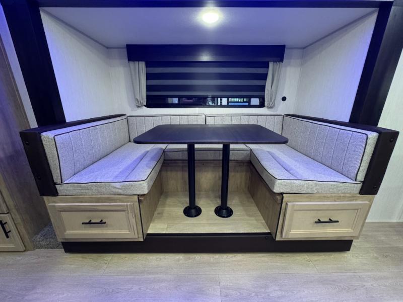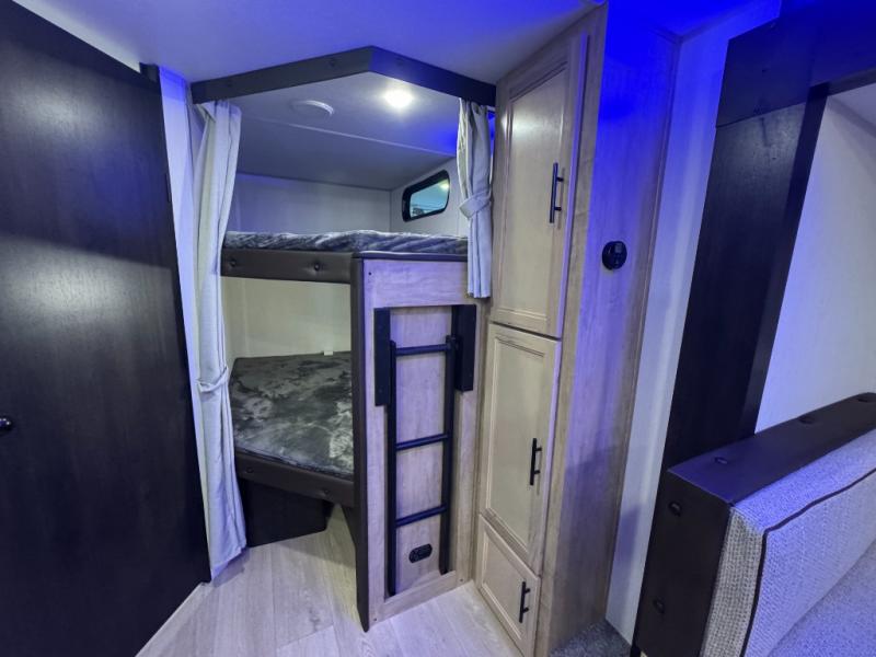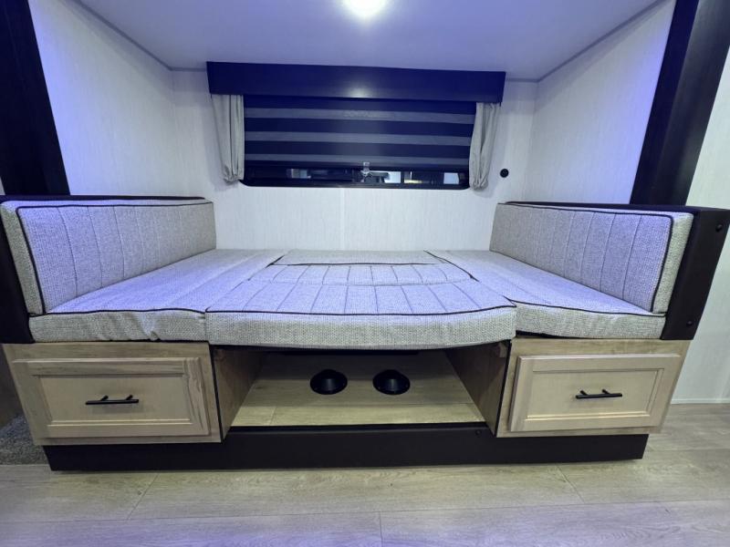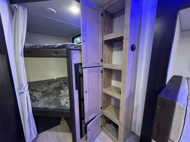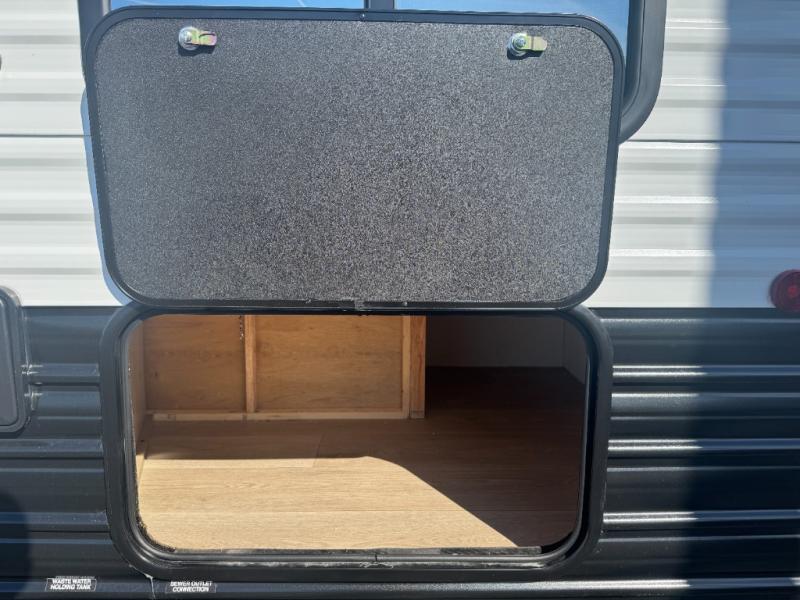 You will love the space provided in this dual entry Cherokee Grey Wolf travel trailer that has double-size bunks! The rear entry door leads right into the full bath allowing easy access from outside when you need to use the bathroom while you're enjoying the great outdoors. The large U-shaped dinette slide will not only seat everyone comfortably for a meal or a game, but since it also slides out, it opens up the interior even more to give you plenty of space for foot traffic. For all of your outdoor gear, you will find the outside storage compartments handy for stowing away your things when not in use. While the kids enjoy their bunk beds, you will enjoy a good night's rest in your RV king bed with wardrobes on either side up in the front private bedroom!