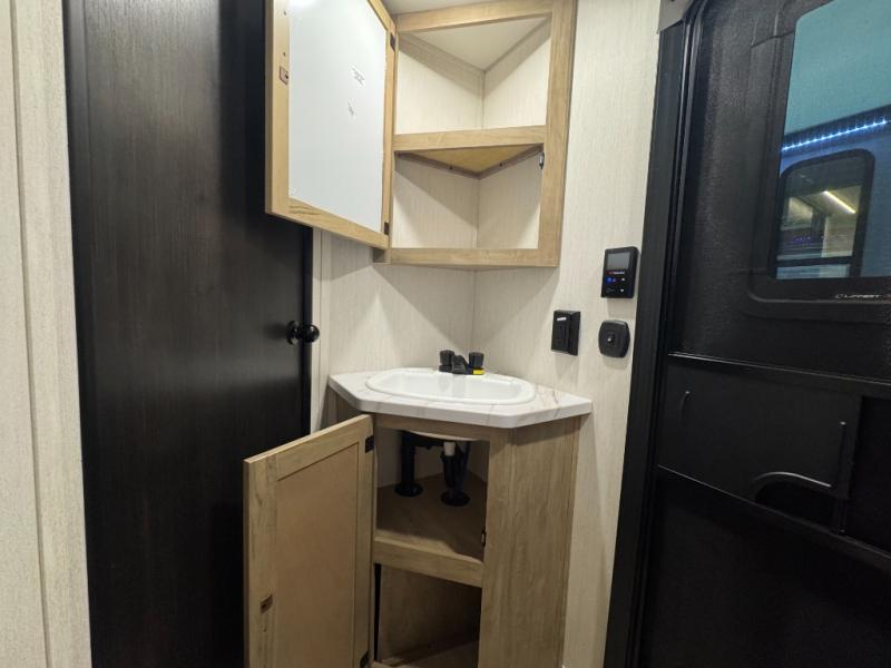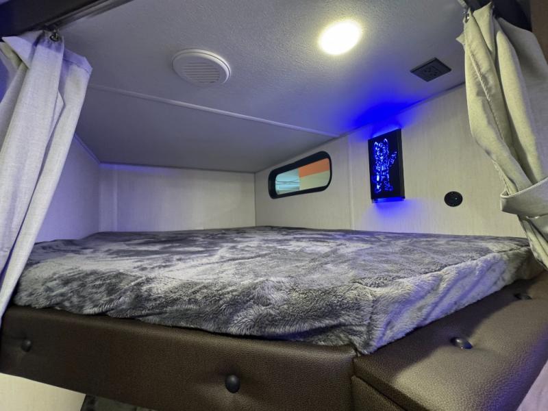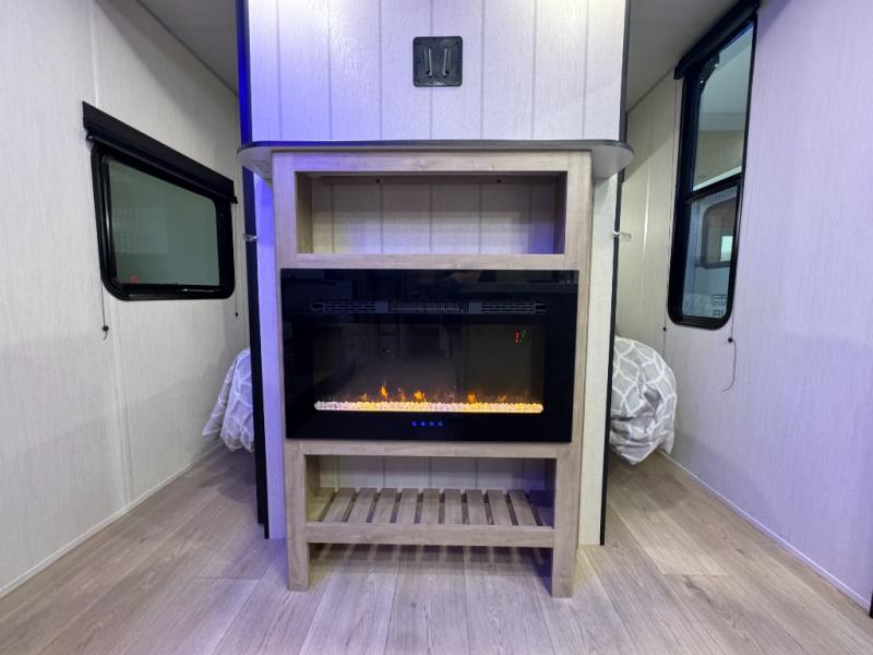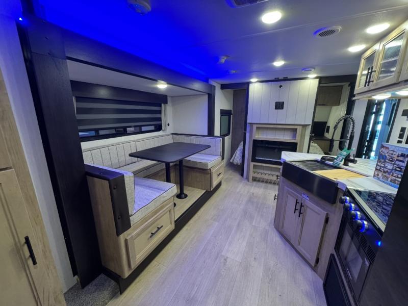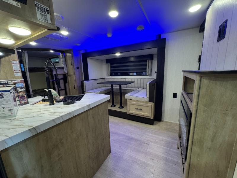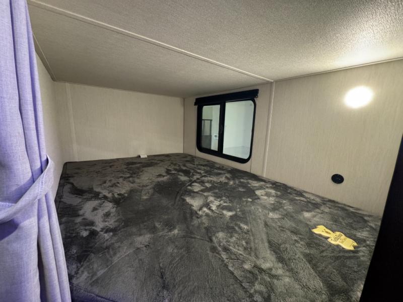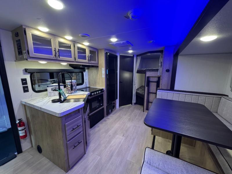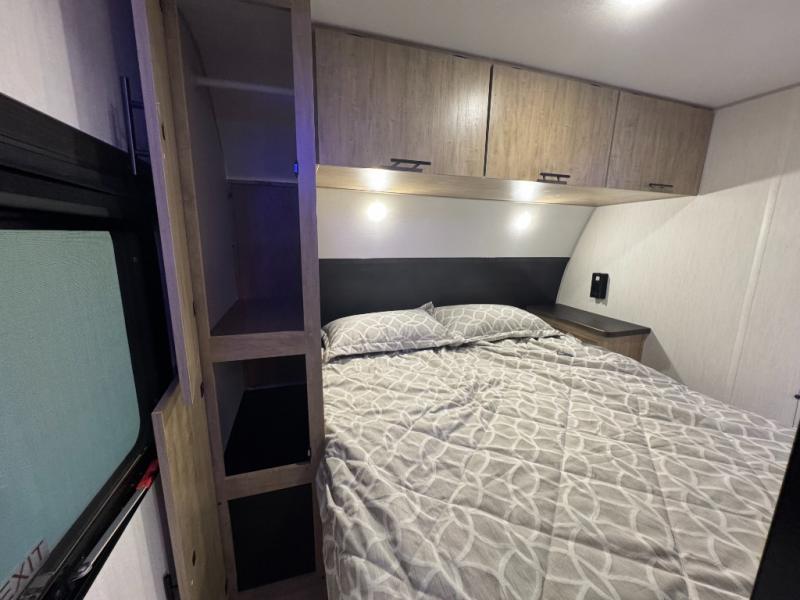 You will love the space provided in this dual entry Cherokee Grey Wolf travel trailer that has double-size bunks! The rear entry door leads right into the full bath allowing easy access from outside when you need to use the bathroom while you're enjoying the great outdoors. The large U-shaped dinette slide will not only seat everyone comfortably for a meal or a game, but since it also slides out, it opens up the interior even more to give you plenty of space for foot traffic. For all of your outdoor gear, you will find the outside storage compartments handy for stowing away your things when not in use. While the kids enjoy their bunk beds, you will enjoy a good night's rest in your RV king bed with wardrobes on either side up in the front private bedroom!