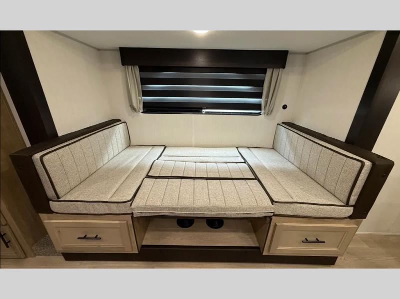 You will love the space provided in this dual entry Cherokee Grey Wolf travel trailer that has double-size bunks! The rear entry door leads right into the full bath allowing easy access from outside when you need to use the bathroom while you're enjoying the great outdoors. The large U-shaped dinette slide will not only seat everyone comfortably for a meal or a game, but since it also slides out, it opens up the interior even more to give you plenty of space for foot traffic. For all of your outdoor gear, you will find the outside storage compartments handy for stowing away your things when not in use. While the kids enjoy their bunk beds, you will enjoy a good night's rest in your RV king bed with wardrobes on either side up in the front private bedroom!