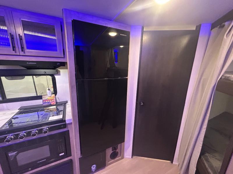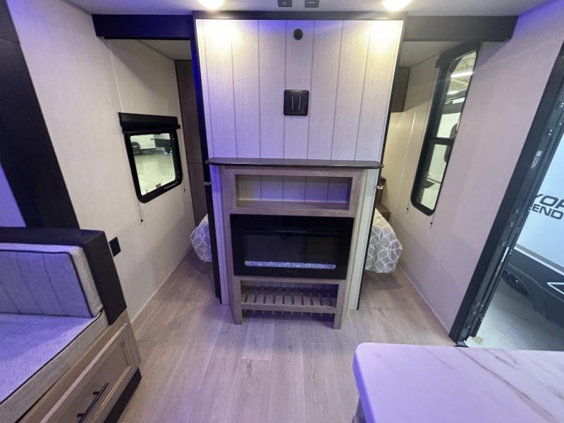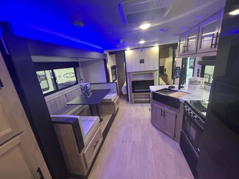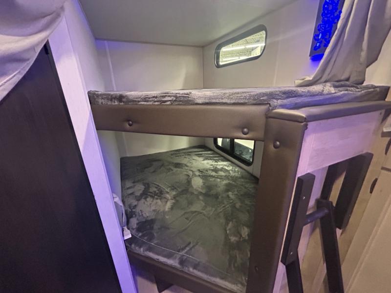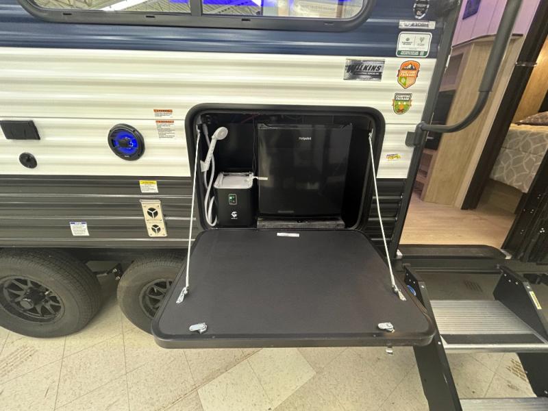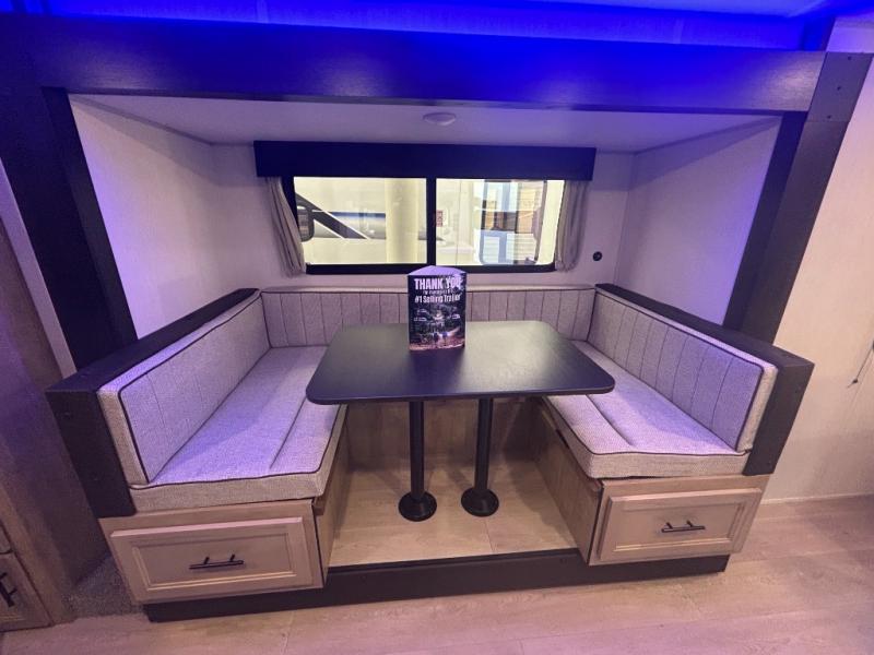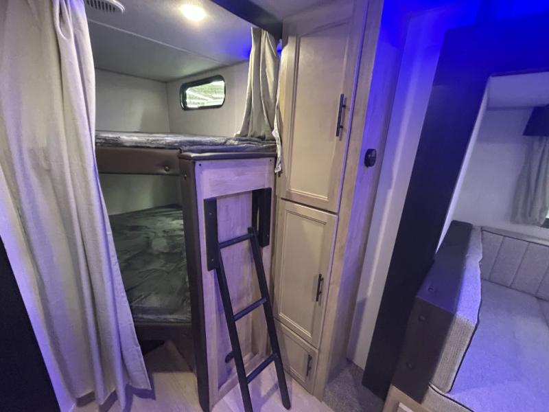 You will love the space provided in this dual entry Cherokee Grey Wolf travel trailer that has double-size bunks! The rear entry door leads right into the full bath allowing easy access from outside when you need to use the bathroom while you're enjoying the great outdoors. The large U-shaped dinette slide will not only seat everyone comfortably for a meal or a game, but since it also slides out, it opens up the interior even more to give you plenty of space for foot traffic. For all of your outdoor gear, you will find the outside storage compartments handy for stowing away your things when not in use. While the kids enjoy their bunk beds, you will enjoy a good night's rest in your RV king bed with wardrobes on either side up in the front private bedroom!