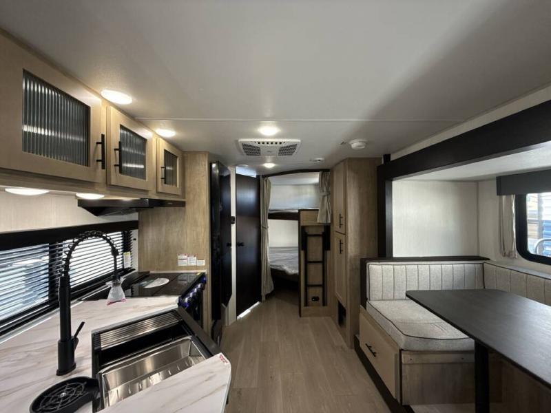 You will love the space provided in this dual entry Cherokee Grey Wolf travel trailer that has double-size bunks! The rear entry door leads right into the full bath allowing easy access from outside when you need to use the bathroom while you're enjoying the great outdoors. The large U-shaped dinette slide will not only seat everyone comfortably for a meal or a game, but since it also slides out, it opens up the interior even more to give you plenty of space for foot traffic. For all of your outdoor gear, you will find the outside storage compartments handy for stowing away your things when not in use. While the kids enjoy their bunk beds, you will enjoy a good night's rest in your RV king bed with wardrobes on either side up in the front private bedroom!