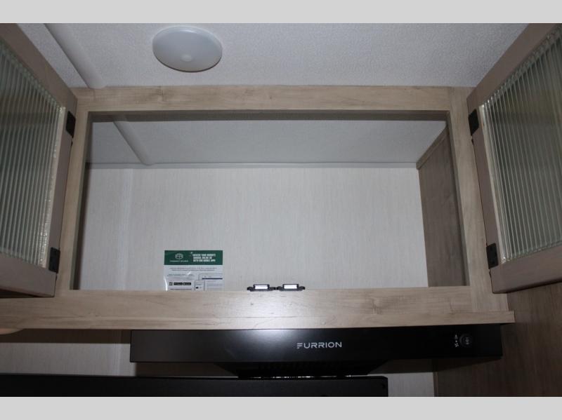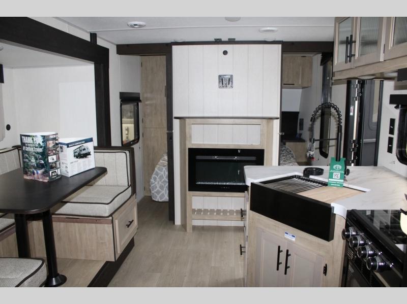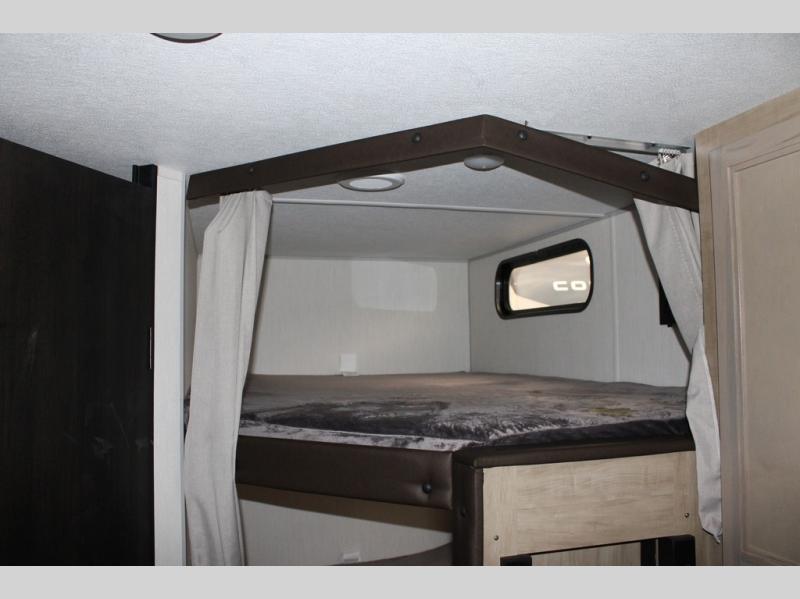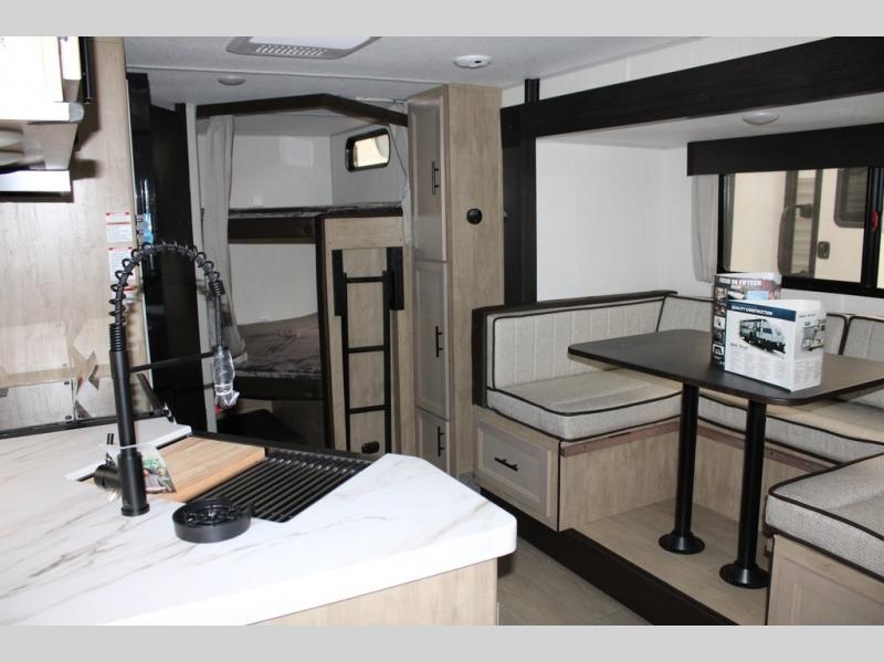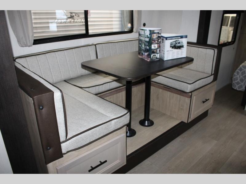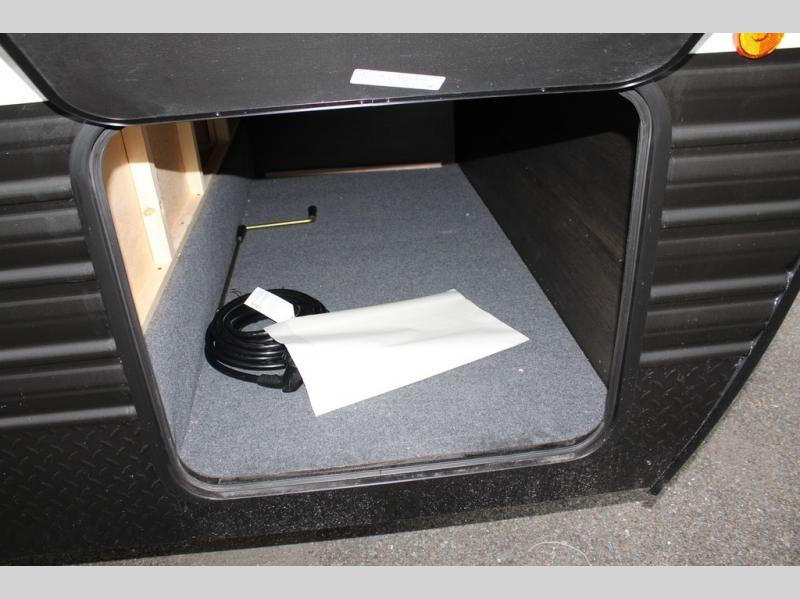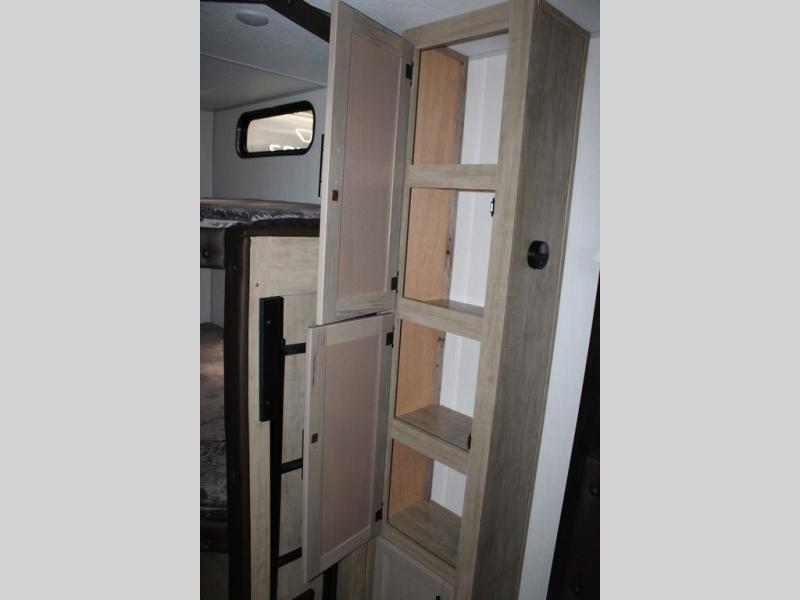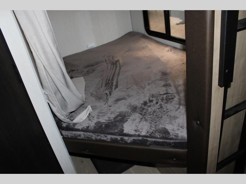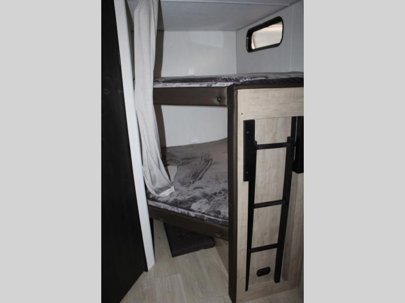 You will love the space provided in this dual entry Cherokee Grey Wolf travel trailer that has double-size bunks! The rear entry door leads right into the full bath allowing easy access from outside when you need to use the bathroom while you're enjoying the great outdoors. The large U-shaped dinette slide will not only seat everyone comfortably for a meal or a game, but since it also slides out, it opens up the interior even more to give you plenty of space for foot traffic. For all of your outdoor gear, you will find the outside storage compartments handy for stowing away your things when not in use. While the kids enjoy their bunk beds, you will enjoy a good night's rest in your RV king bed with wardrobes on either side up in the front private bedroom!