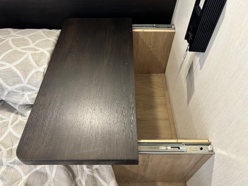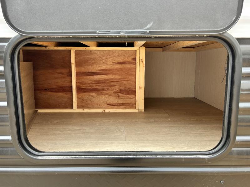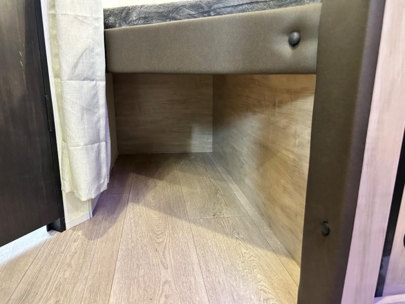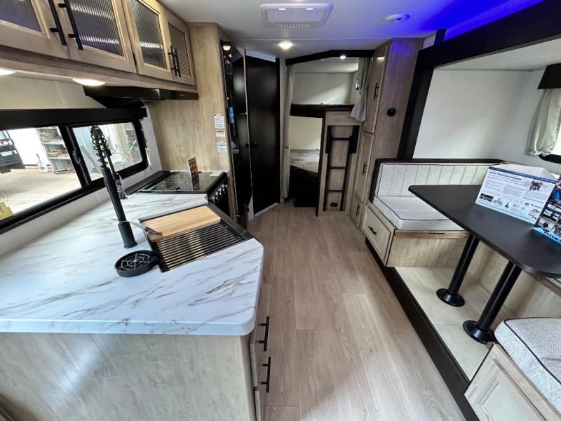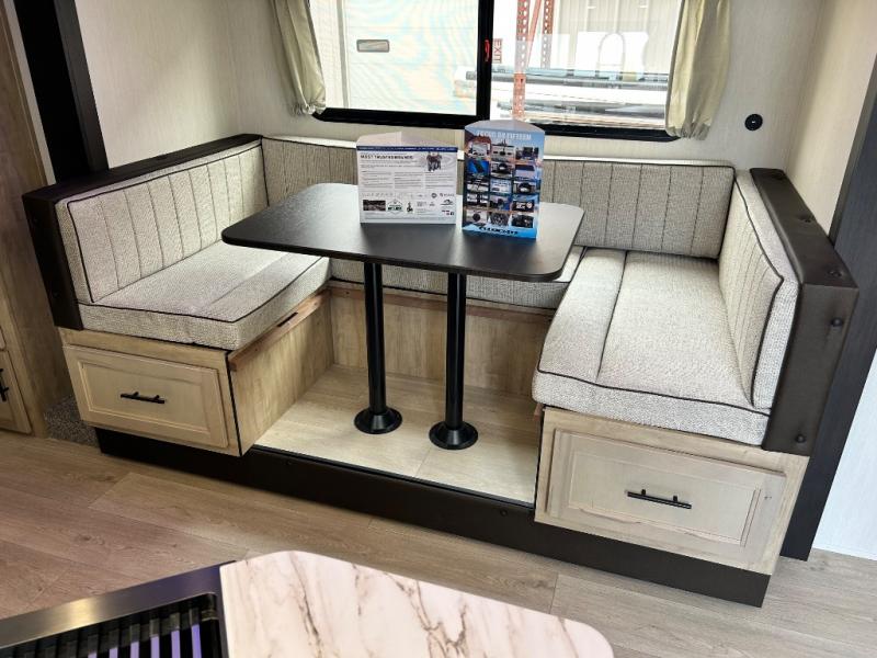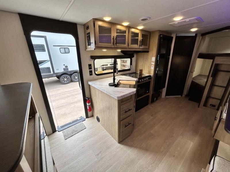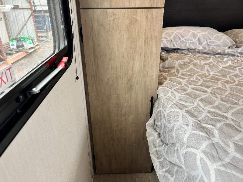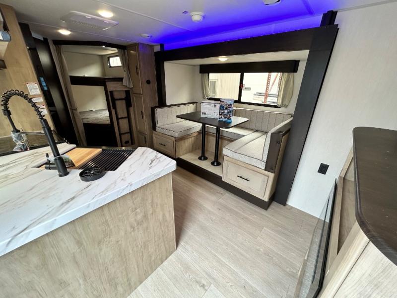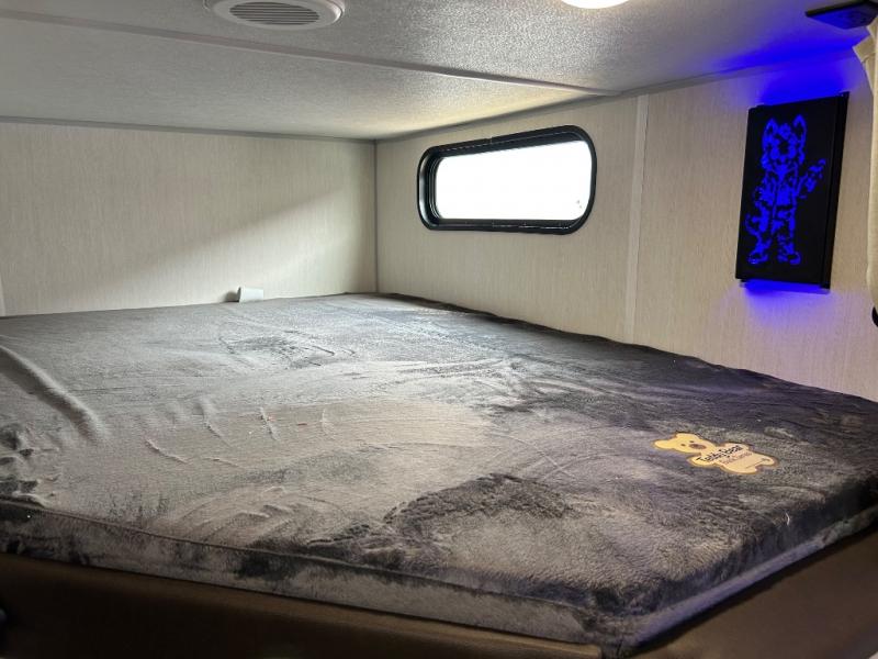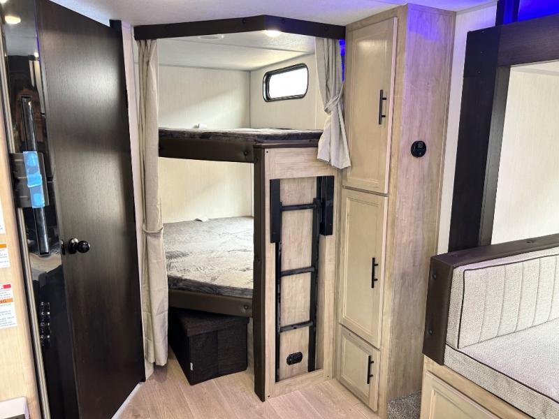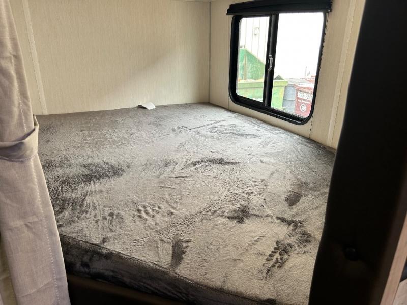 You will love the space provided in this dual entry Cherokee Grey Wolf travel trailer that has double-size bunks! The rear entry door leads right into the full bath allowing easy access from outside when you need to use the bathroom while you're enjoying the great outdoors. The large U-shaped dinette slide will not only seat everyone comfortably for a meal or a game, but since it also slides out, it opens up the interior even more to give you plenty of space for foot traffic. For all of your outdoor gear, you will find the outside storage compartments handy for stowing away your things when not in use. While the kids enjoy their bunk beds, you will enjoy a good night's rest in your RV king bed with wardrobes on either side up in the front private bedroom!
