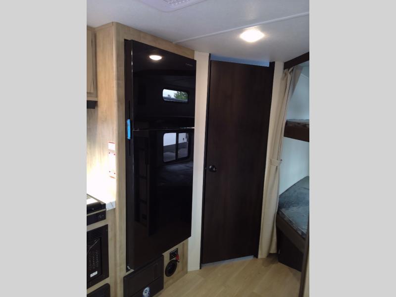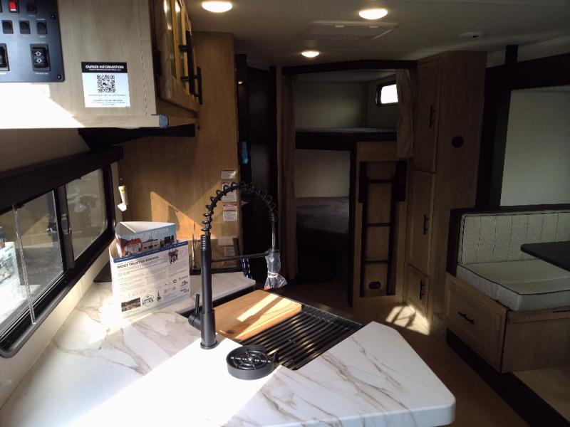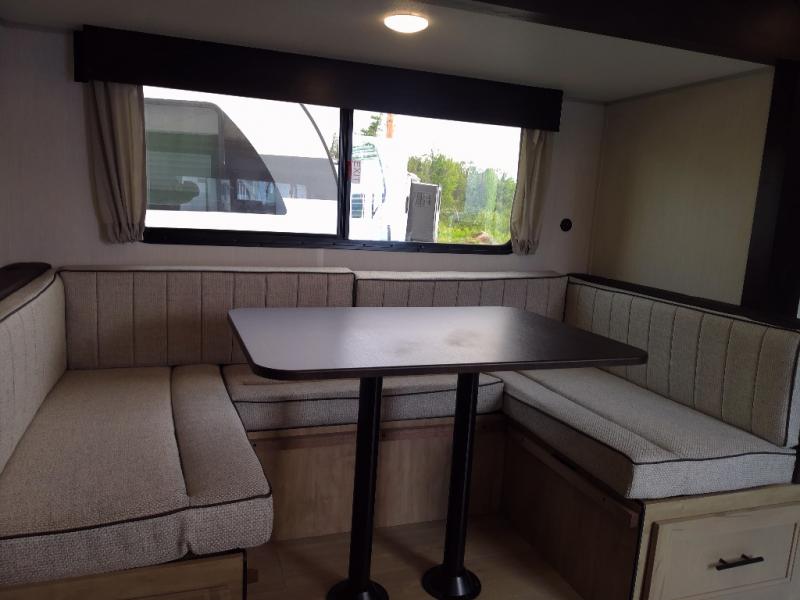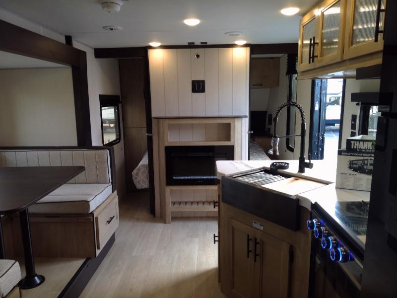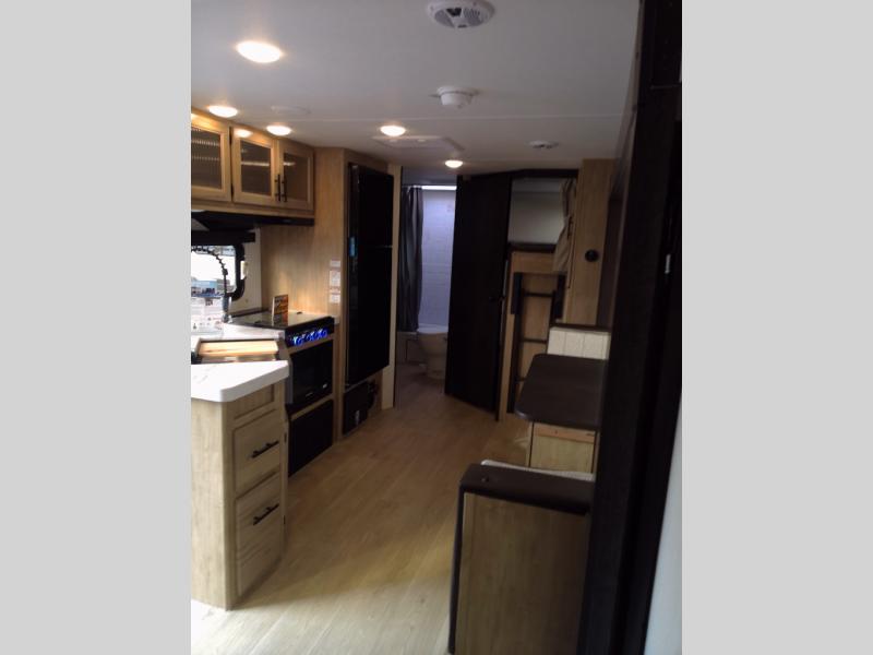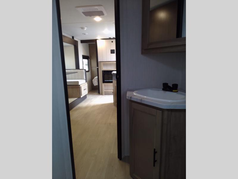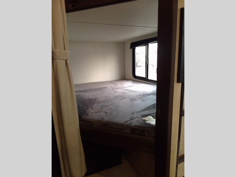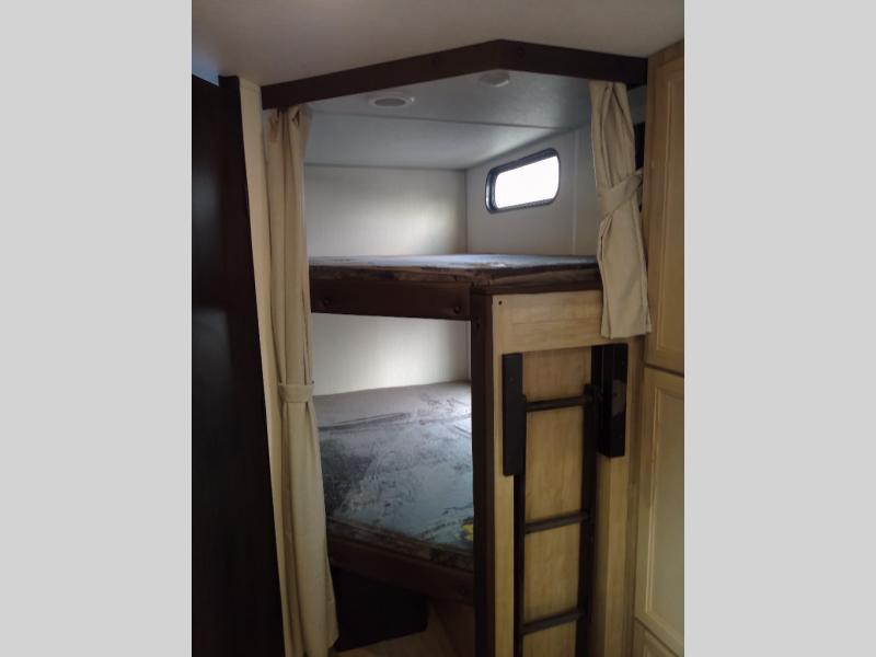 You will love the space provided in this dual entry Cherokee Grey Wolf travel trailer that has double-size bunks! The rear entry door leads right into the full bath allowing easy access from outside when you need to use the bathroom while you're enjoying the great outdoors. The large U-shaped dinette slide will not only seat everyone comfortably for a meal or a game, but since it also slides out, it opens up the interior even more to give you plenty of space for foot traffic. For all of your outdoor gear, you will find the outside storage compartments handy for stowing away your things when not in use. While the kids enjoy their bunk beds, you will enjoy a good night's rest in your RV king bed with wardrobes on either side up in the front private bedroom!