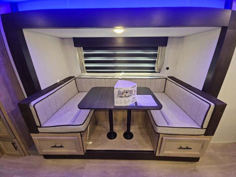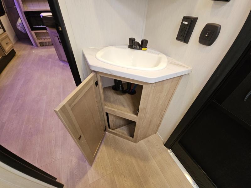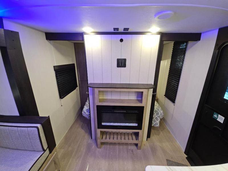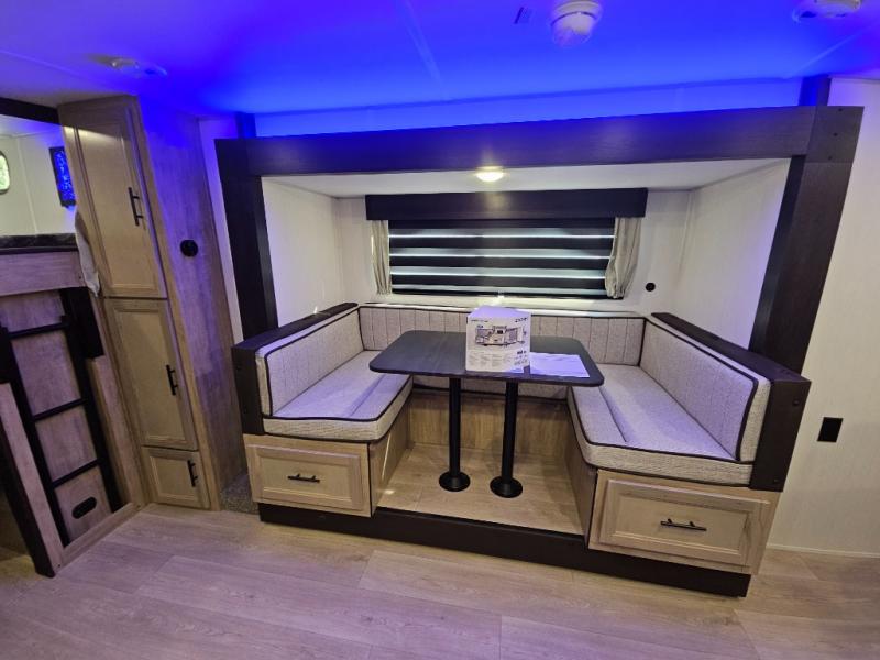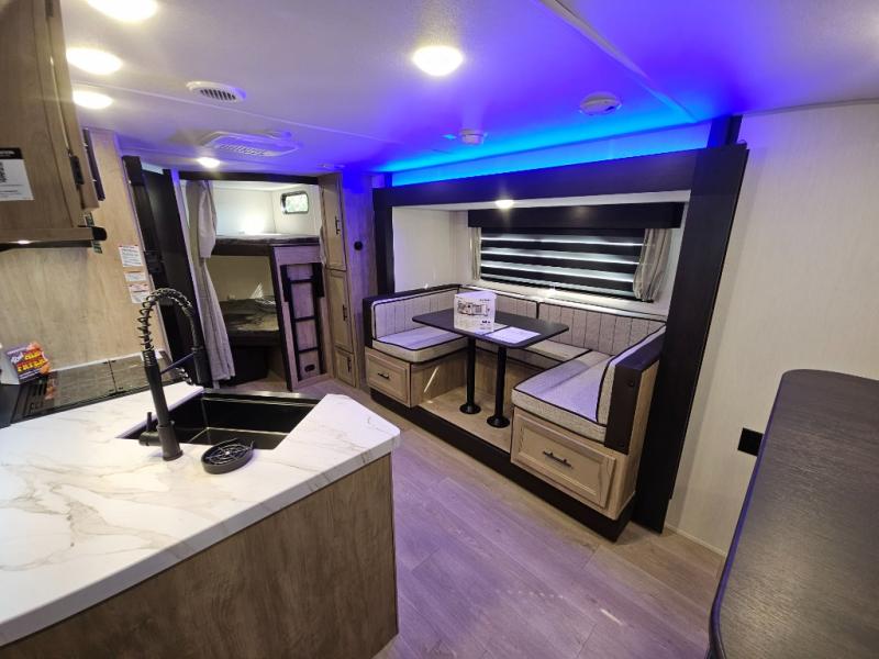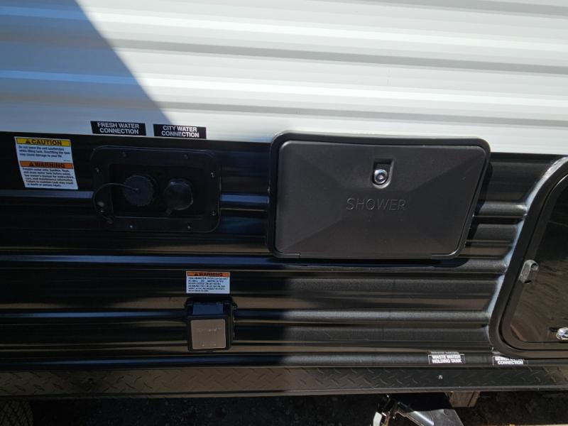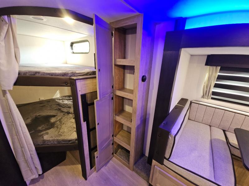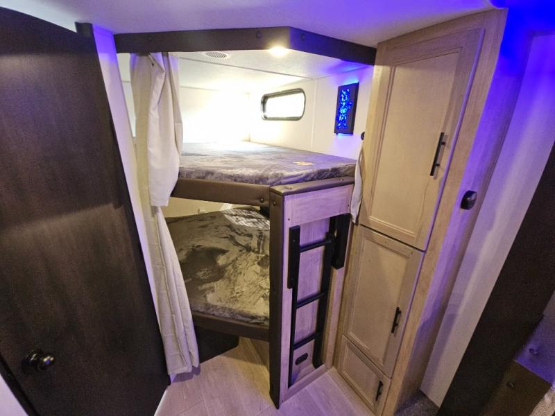 You will love the space provided in this dual entry Cherokee Grey Wolf travel trailer that has double-size bunks! The rear entry door leads right into the full bath allowing easy access from outside when you need to use the bathroom while you're enjoying the great outdoors. The large U-shaped dinette slide will not only seat everyone comfortably for a meal or a game, but since it also slides out, it opens up the interior even more to give you plenty of space for foot traffic. For all of your outdoor gear, you will find the outside storage compartments handy for stowing away your things when not in use. While the kids enjoy their bunk beds, you will enjoy a good night's rest in your RV king bed with wardrobes on either side up in the front private bedroom!