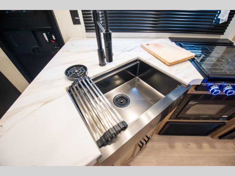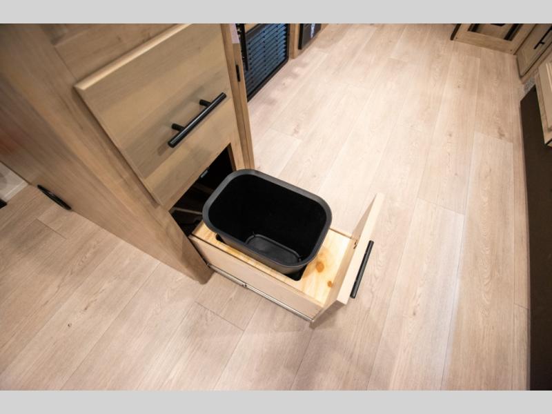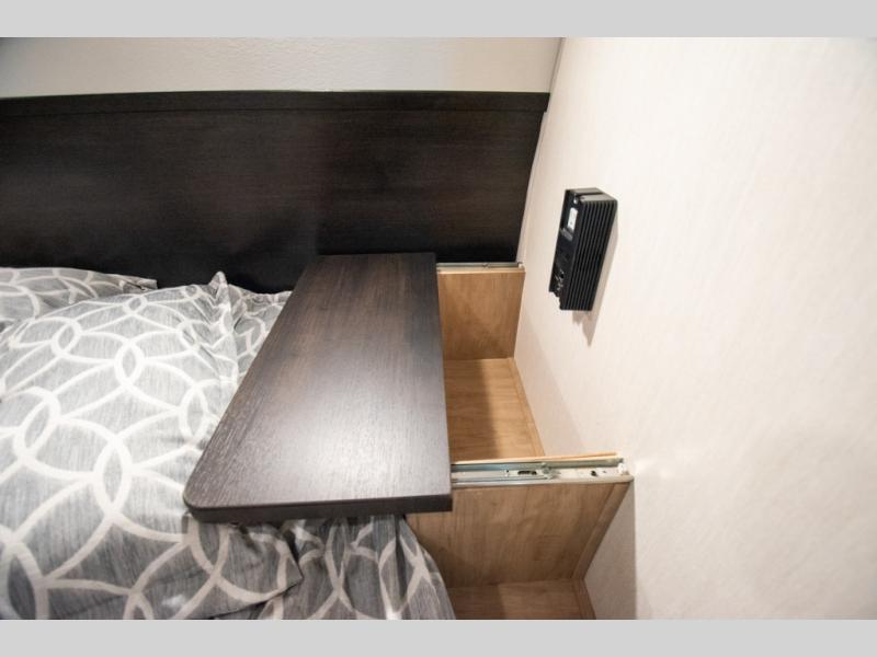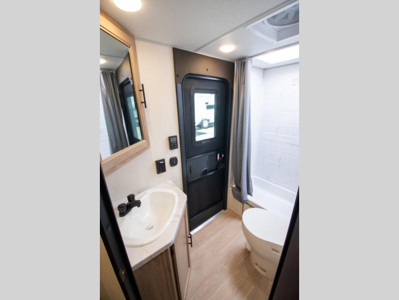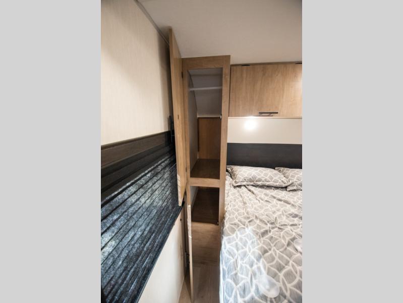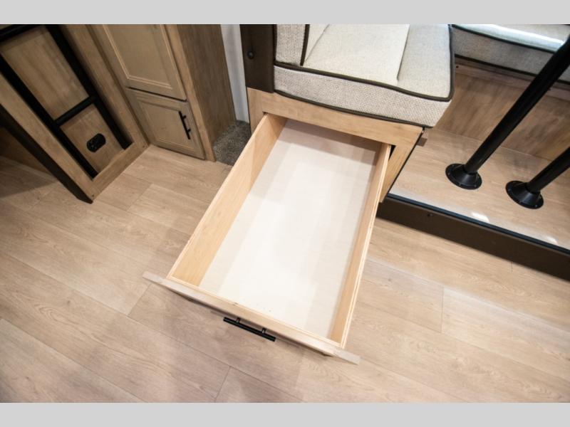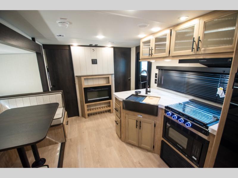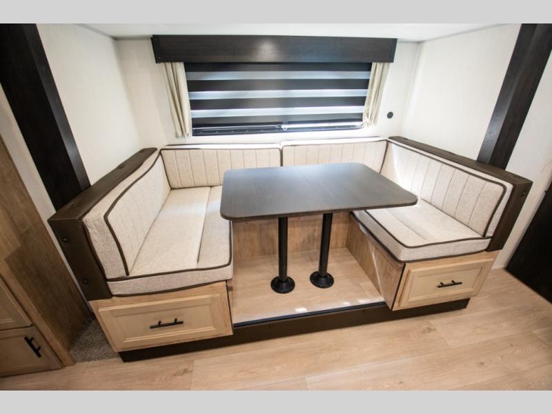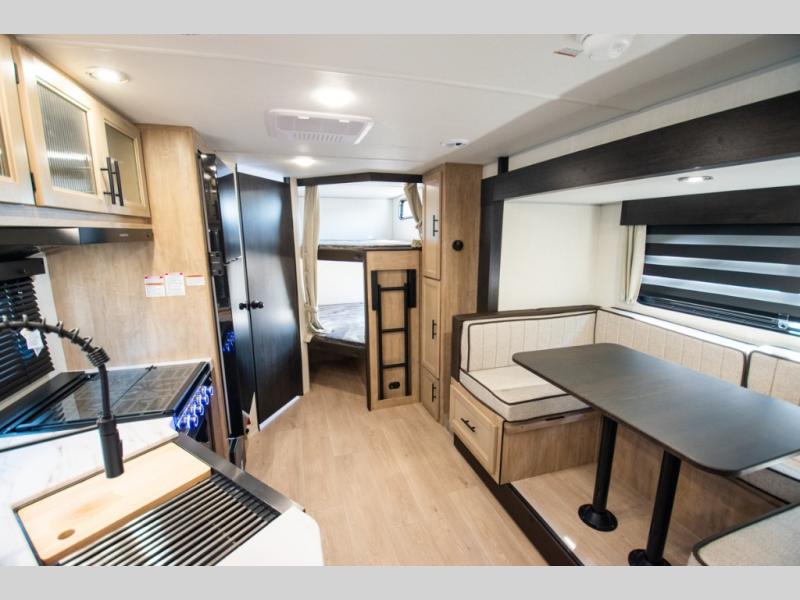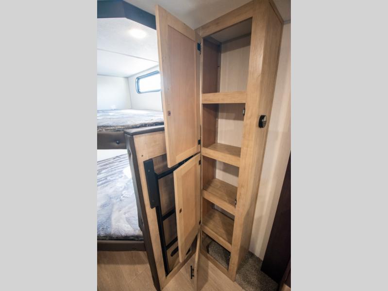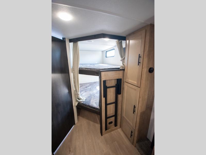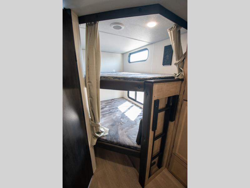 You will love the space provided in this dual entry Cherokee Grey Wolf travel trailer that has double-size bunks! The rear entry door leads right into the full bath allowing easy access from outside when you need to use the bathroom while you're enjoying the great outdoors. The large U-shaped dinette slide will not only seat everyone comfortably for a meal or a game, but since it also slides out, it opens up the interior even more to give you plenty of space for foot traffic. For all of your outdoor gear, you will find the outside storage compartments handy for stowing away your things when not in use. While the kids enjoy their bunk beds, you will enjoy a good night's rest in your RV king bed with wardrobes on either side up in the front private bedroom!